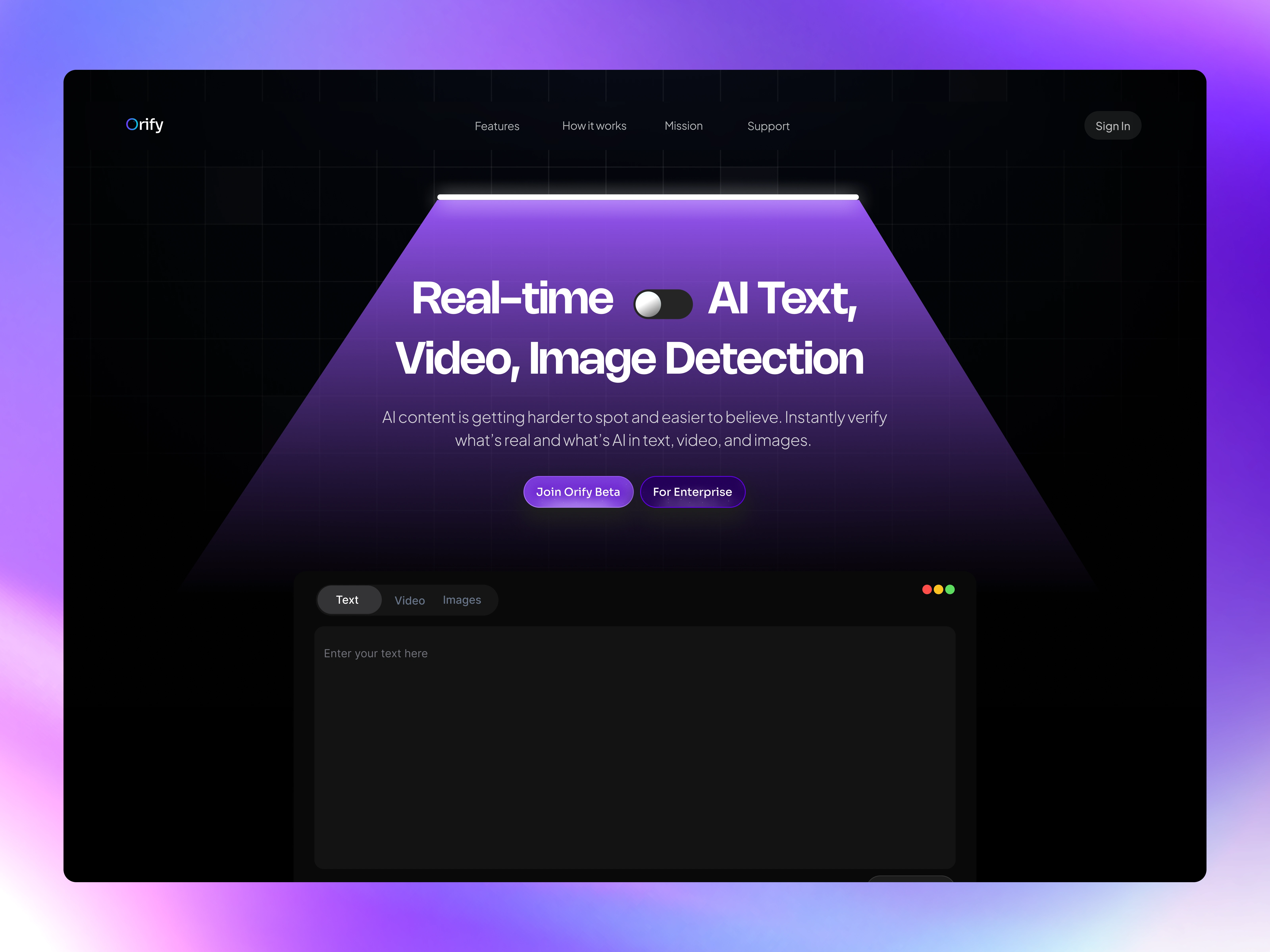 Orify is building trust in the age of AI-generated content but their old website wasn’t telling that story clearly. It was text-heavy, lacked hierarchy, and didn’t visually reflect Orify’s cutting-edge technology. My role was to redesign the website into a modern, engaging, and trustworthy platform that communicates Orify’s mission and product in a way that resonates with enterprises, governments, educators, and everyday users.