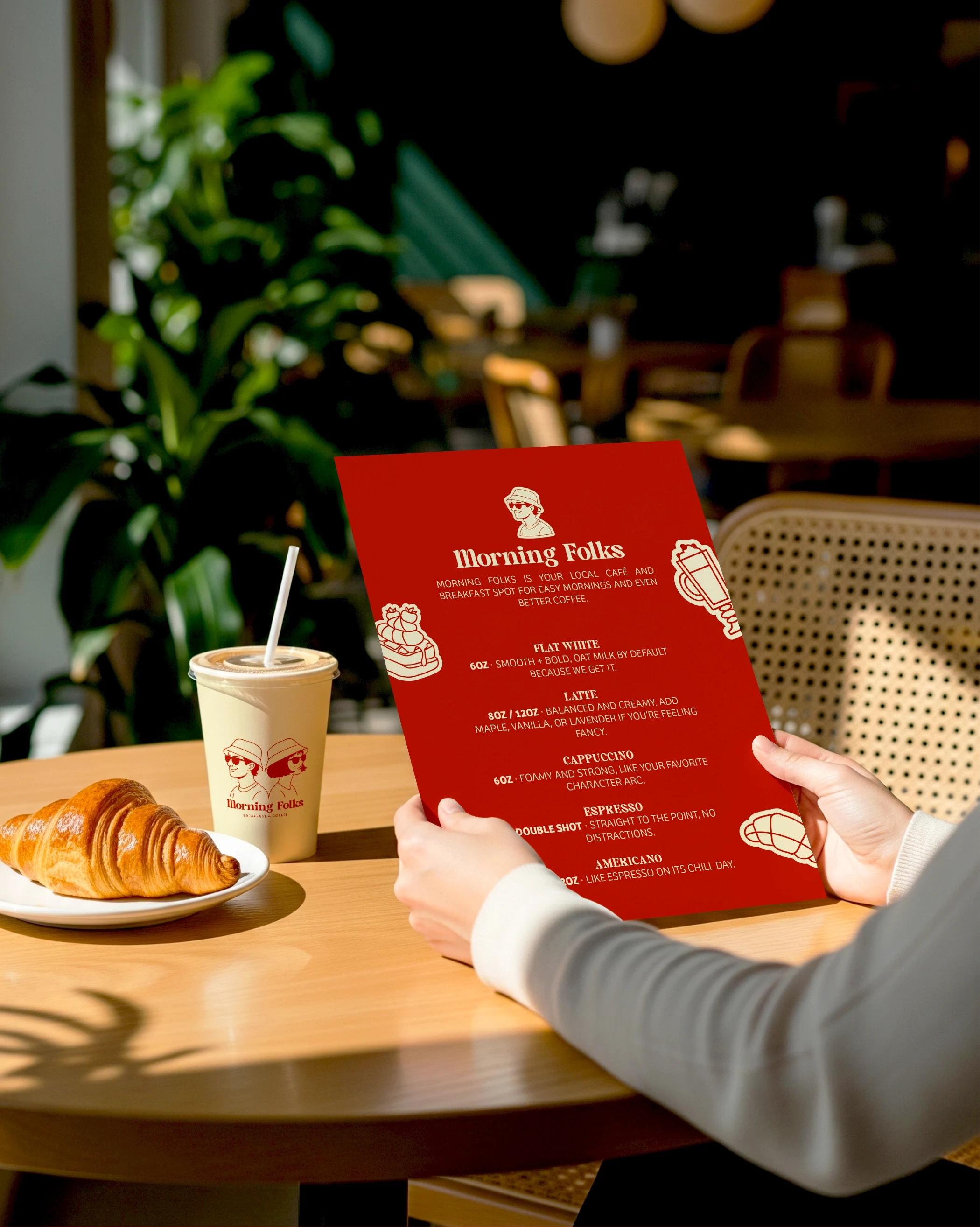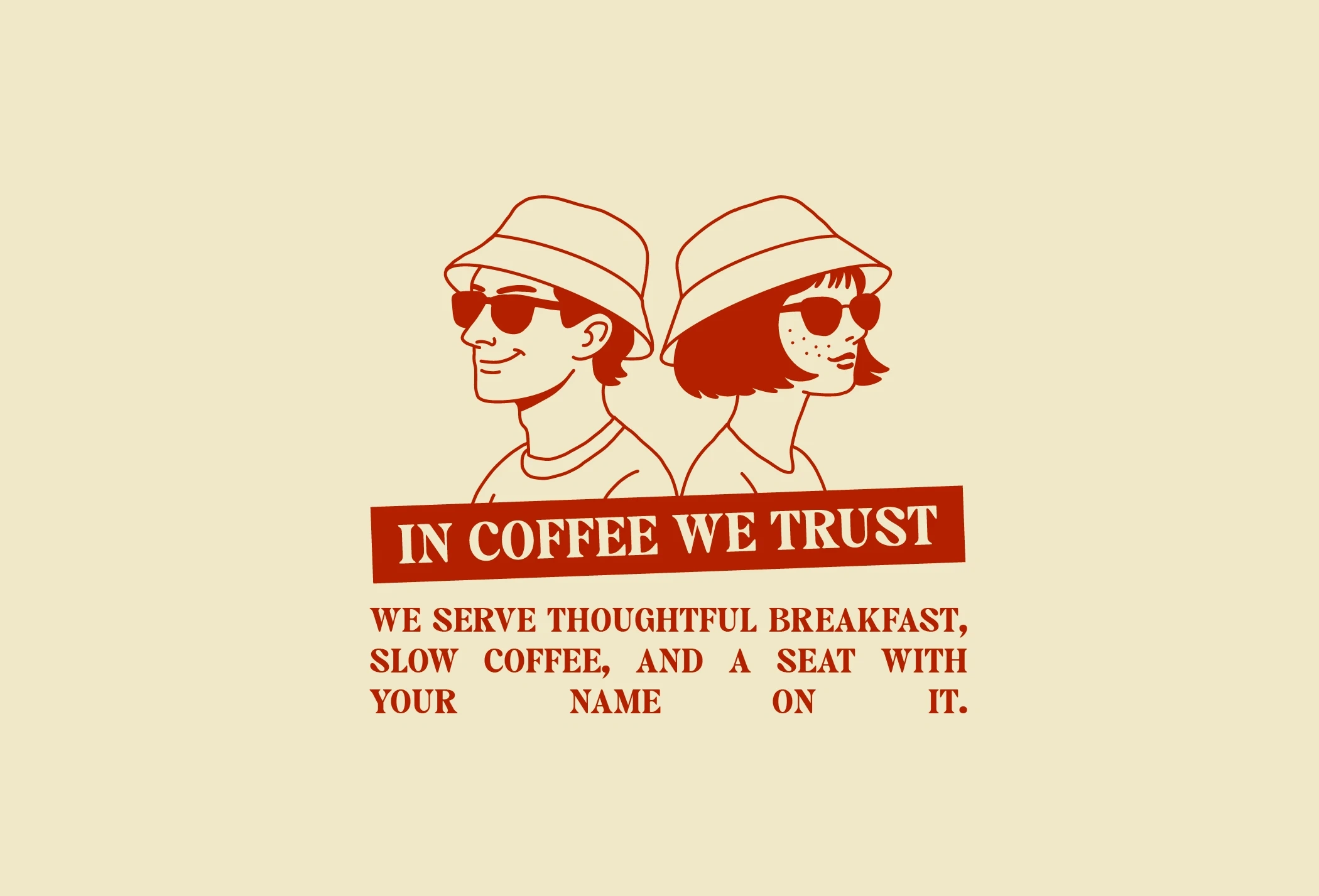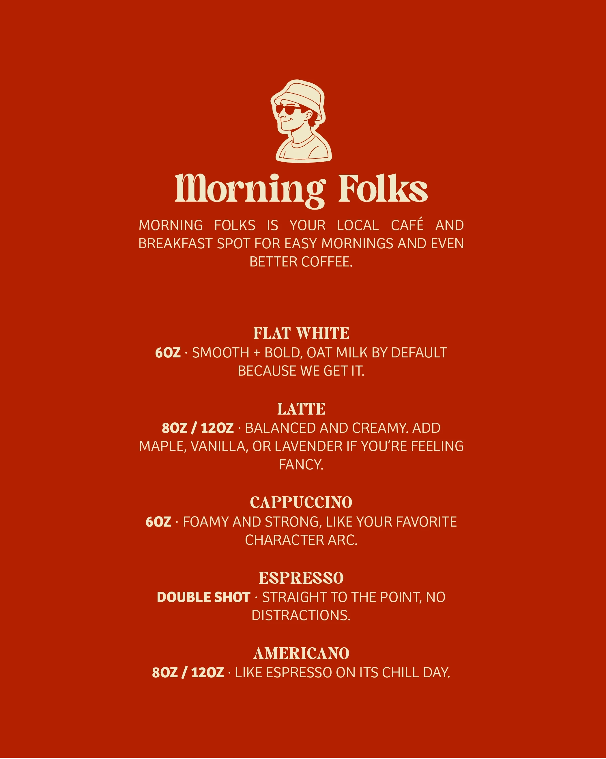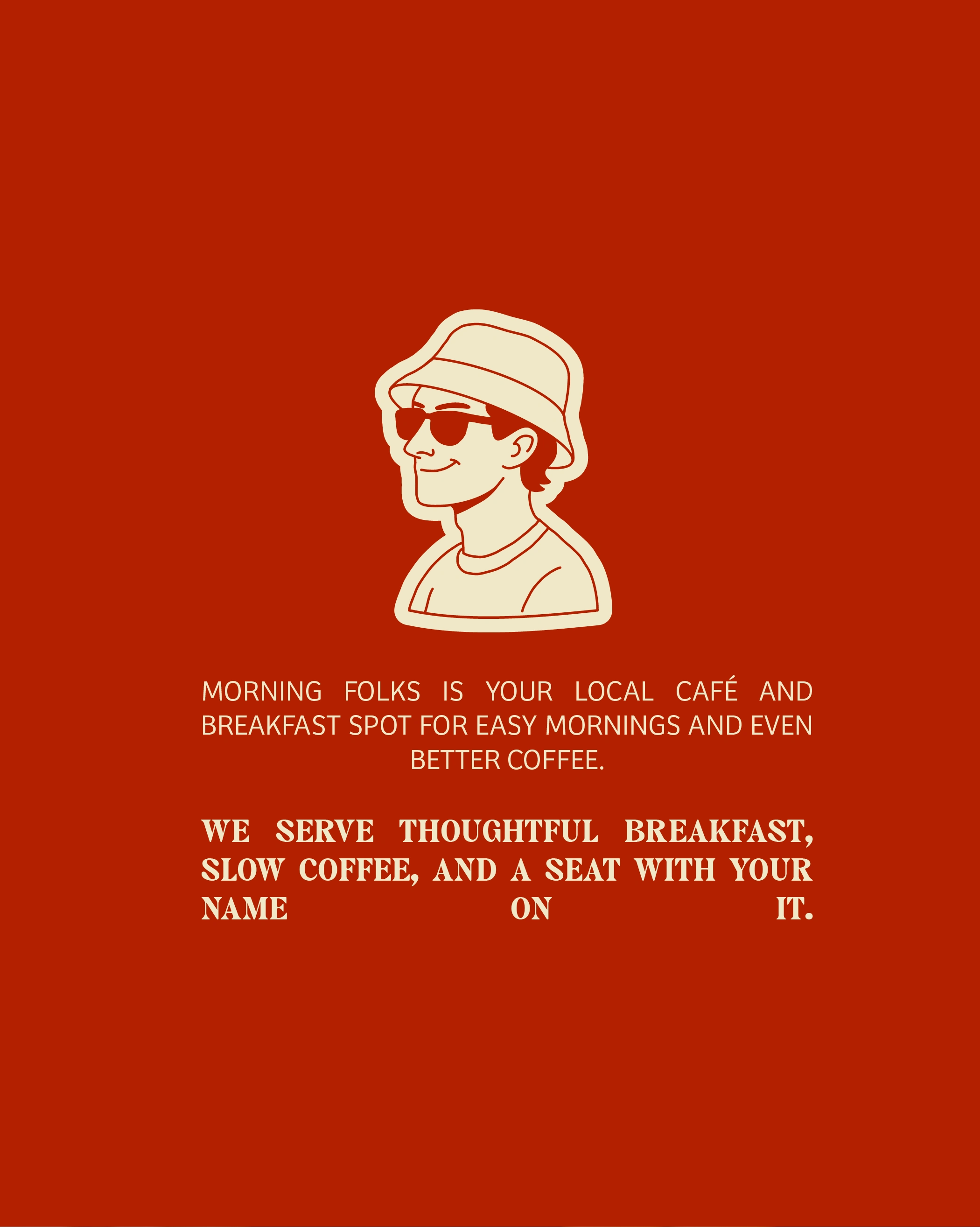 Supporting graphics include croissants, moka pots, and sunny-side eggs, used across takeaway packaging, uniforms, and social content to build a system that feels cohesive and full of personality. Messaging is short, snappy, and human, like “We serve thoughtful breakfast, slow coffee, and a seat with your name on it.” From cups to carry bags to uniforms, every brand touchpoint is designed to feel fun, friendly, and instantly recognizable.