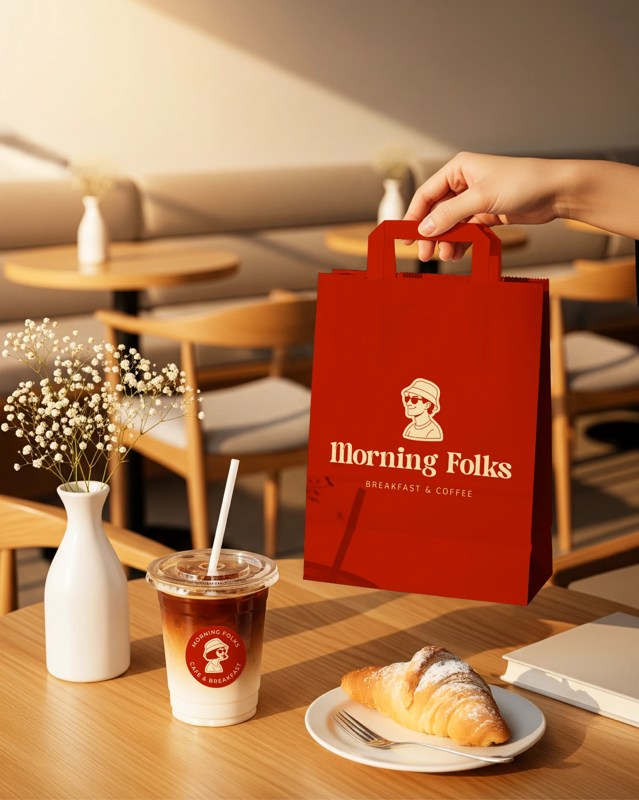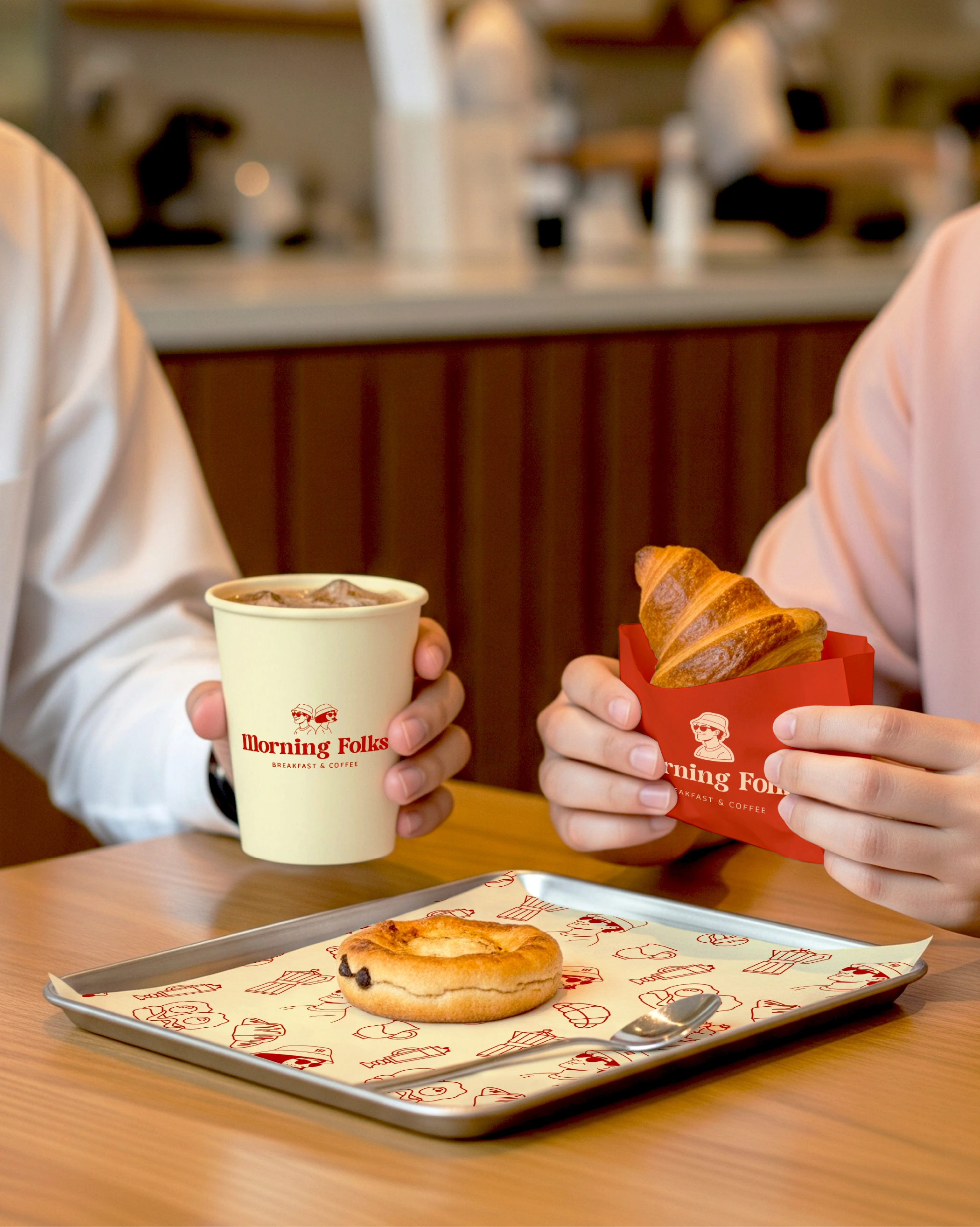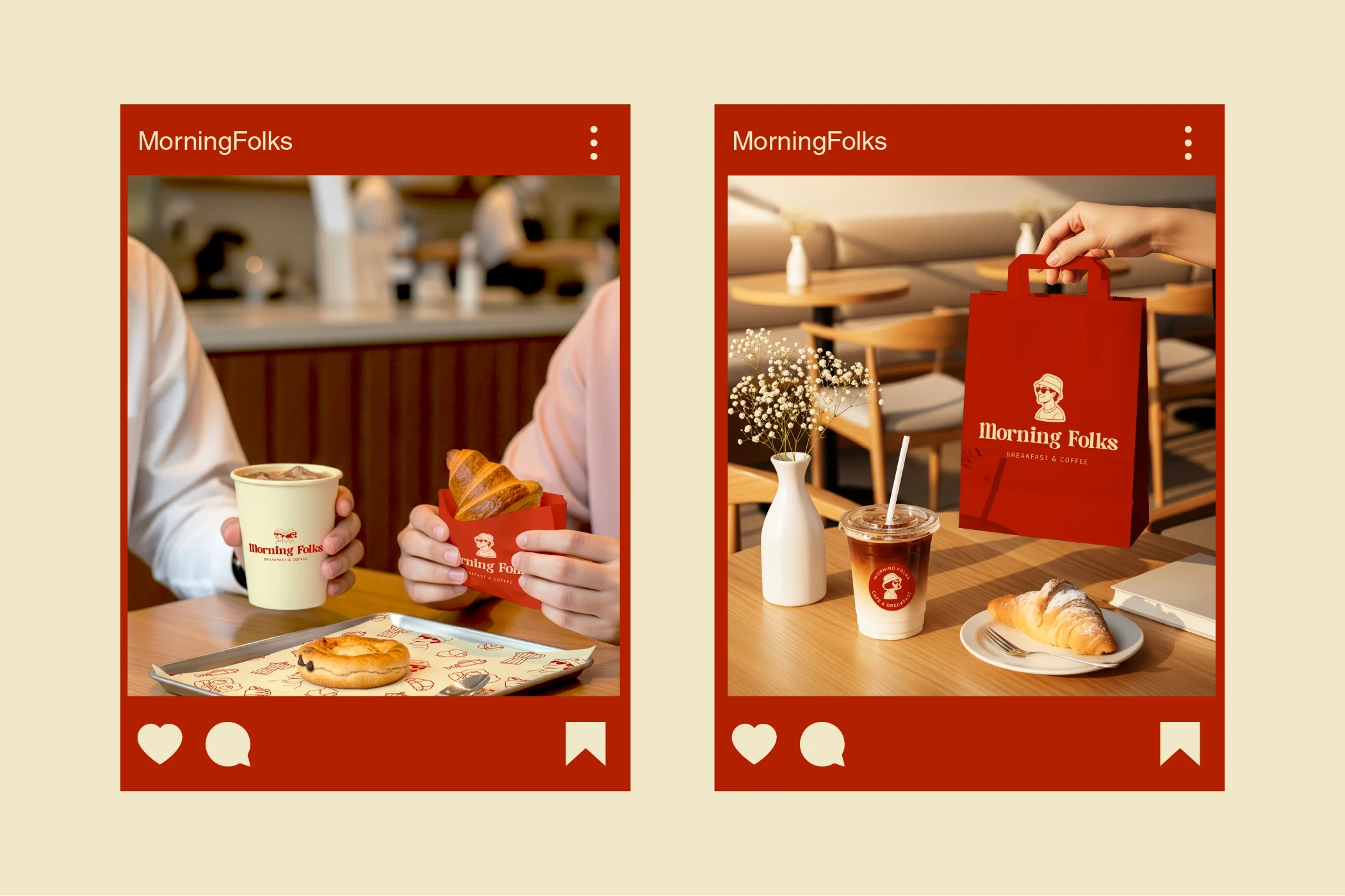 Supporting graphics include croissants, moka pots, and sunny-side eggs, used across takeaway packaging, uniforms, and social content to build a system that feels cohesive and full of personality. Messaging is short, snappy, and human, like “We serve thoughtful breakfast, slow coffee, and a seat with your name on it.” From cups to carry bags to uniforms, every brand touchpoint is designed to feel fun, friendly, and instantly recognizable.
