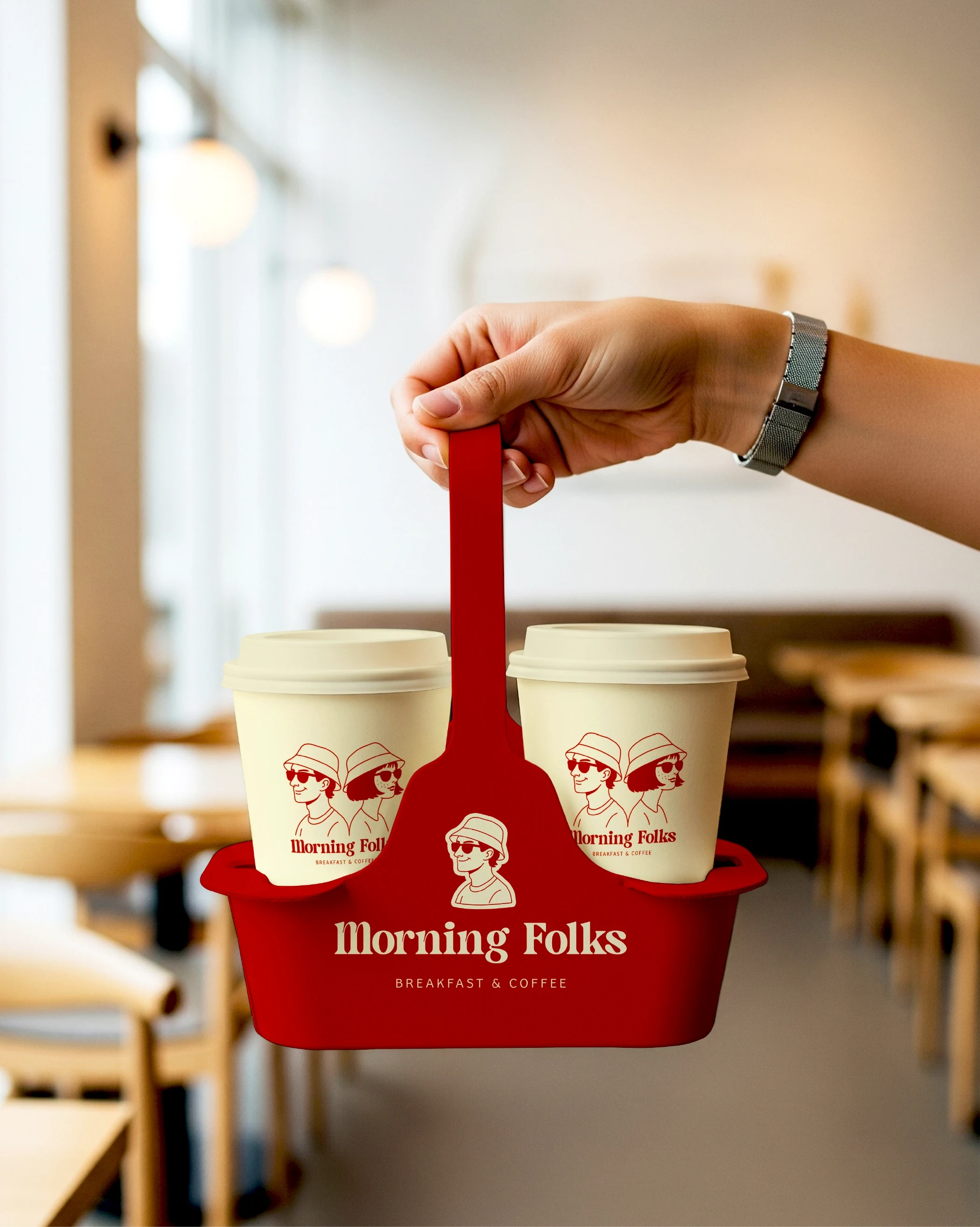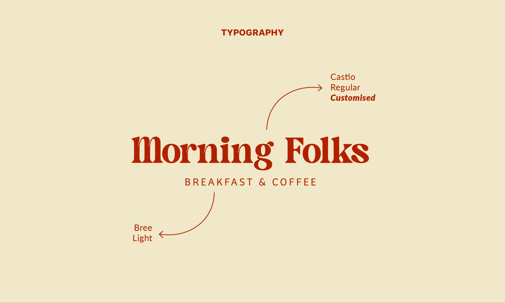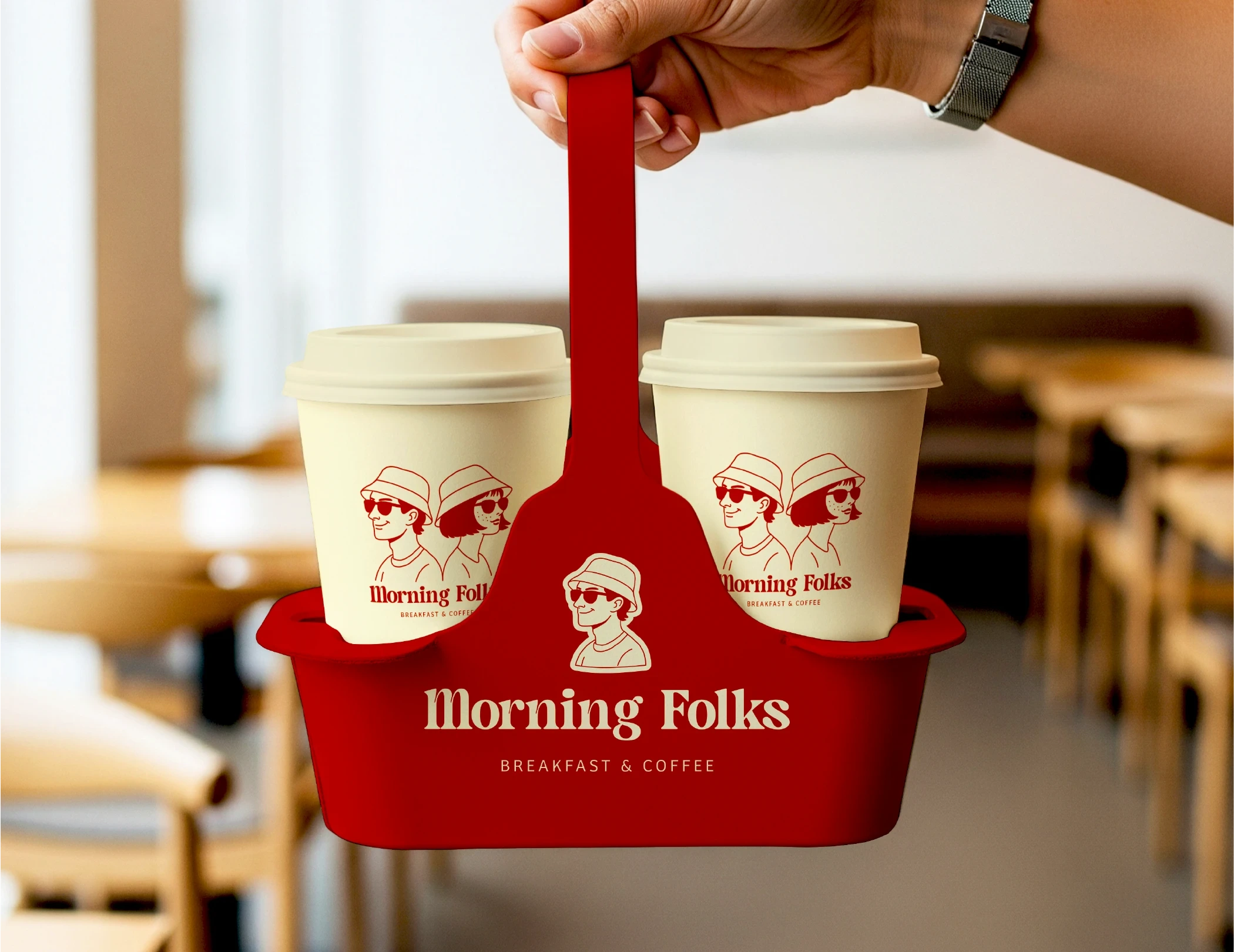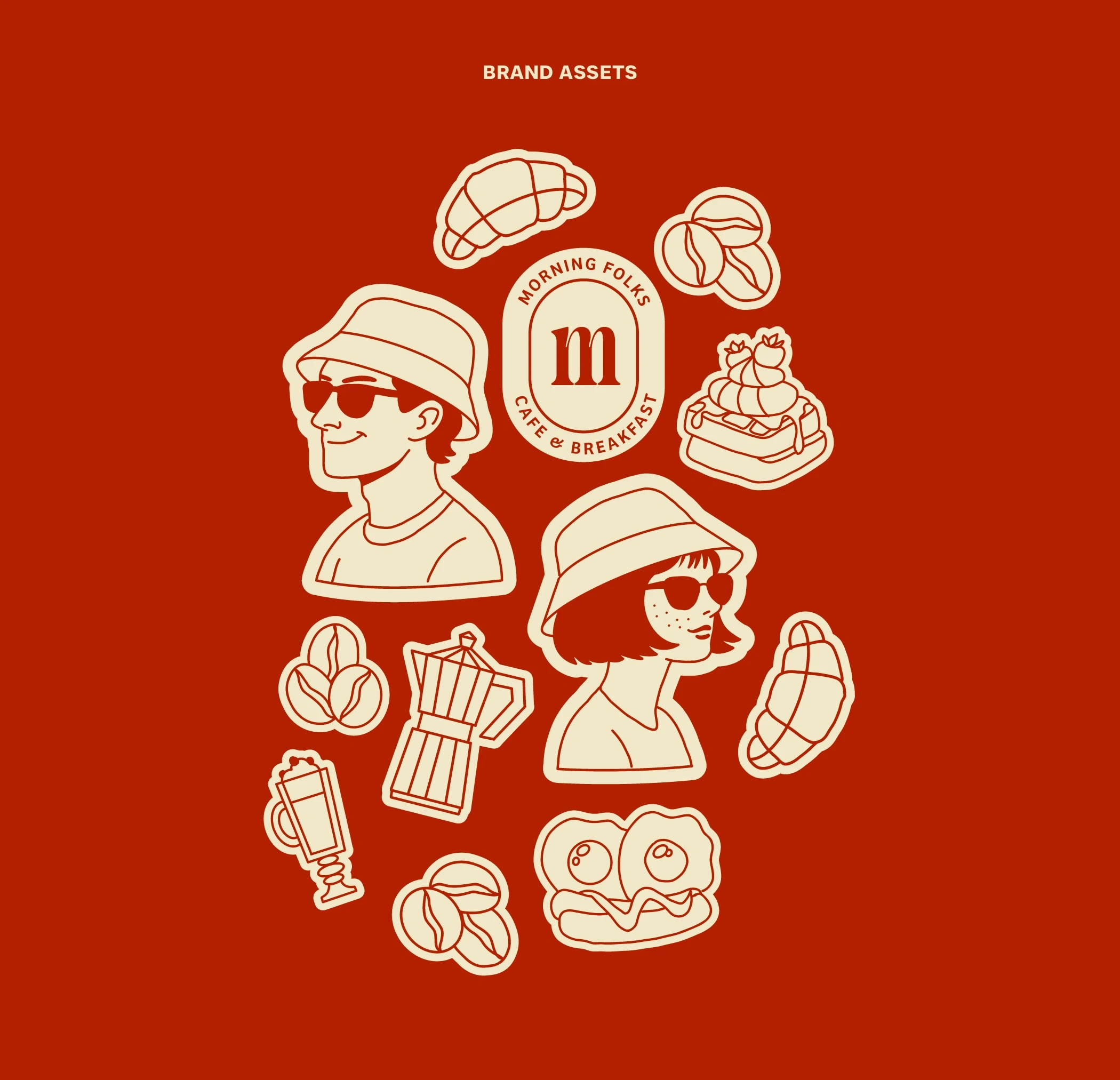 Supporting graphics include croissants, moka pots, and sunny-side eggs, used across takeaway packaging, uniforms, and social content to build a system that feels cohesive and full of personality. Messaging is short, snappy, and human, like “We serve thoughtful breakfast, slow coffee, and a seat with your name on it.” From cups to carry bags to uniforms, every brand touchpoint is designed to feel fun, friendly, and instantly recognizable.