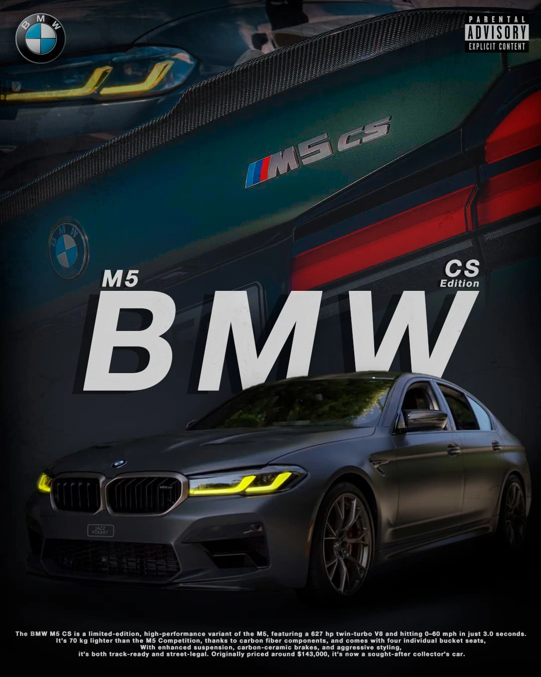 Bold poster of the BMW M5 CS, blending luxury car photography, sleek design, and cinematic style to highlight performance and exclusivity.