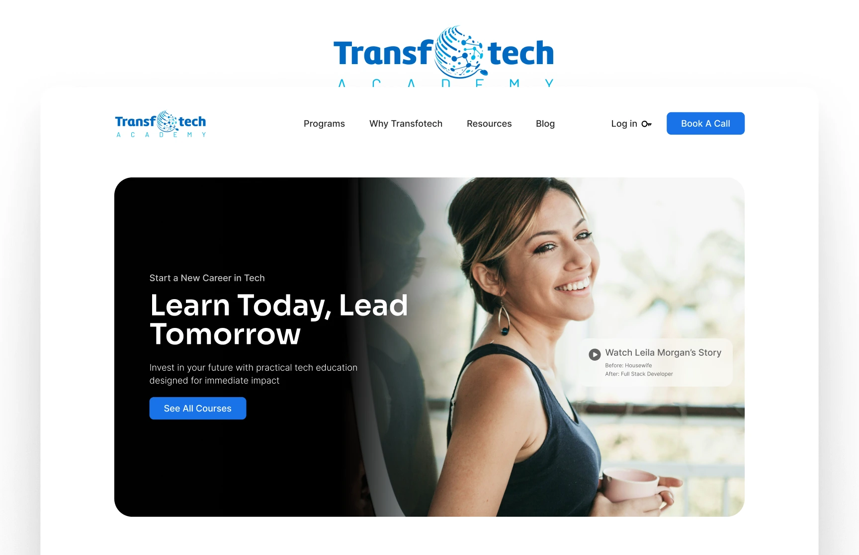 Designed a modern, career-focused landing page for Transfotech Academy, an educational platform helping people transition into tech. The hero section highlights real success stories, strong calls to action, and a clean structure for trust and conversion.