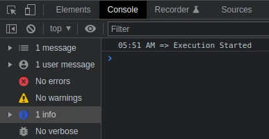 [Note: before executing the code make sure the meet page is loaded propery and there's no popup]Execute buttonCTRL+SHIFT+I or mouse right click and select inspect / inspect element. Go to console tab as below image and paste the code then hit EnterCTRL+SHIFT+I or mouse right click and select inspect / inspect element. (as above instruction)Console tab and click on the 'Info' from the left sidebar panel