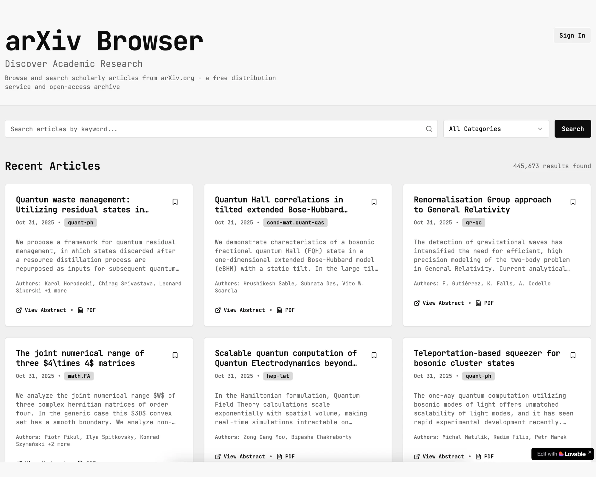 arXiv API. This is a great tool for anyone doing research or wanting to start a research project. Search through articles, save them, or go directly to their source. Remix link can be found below.