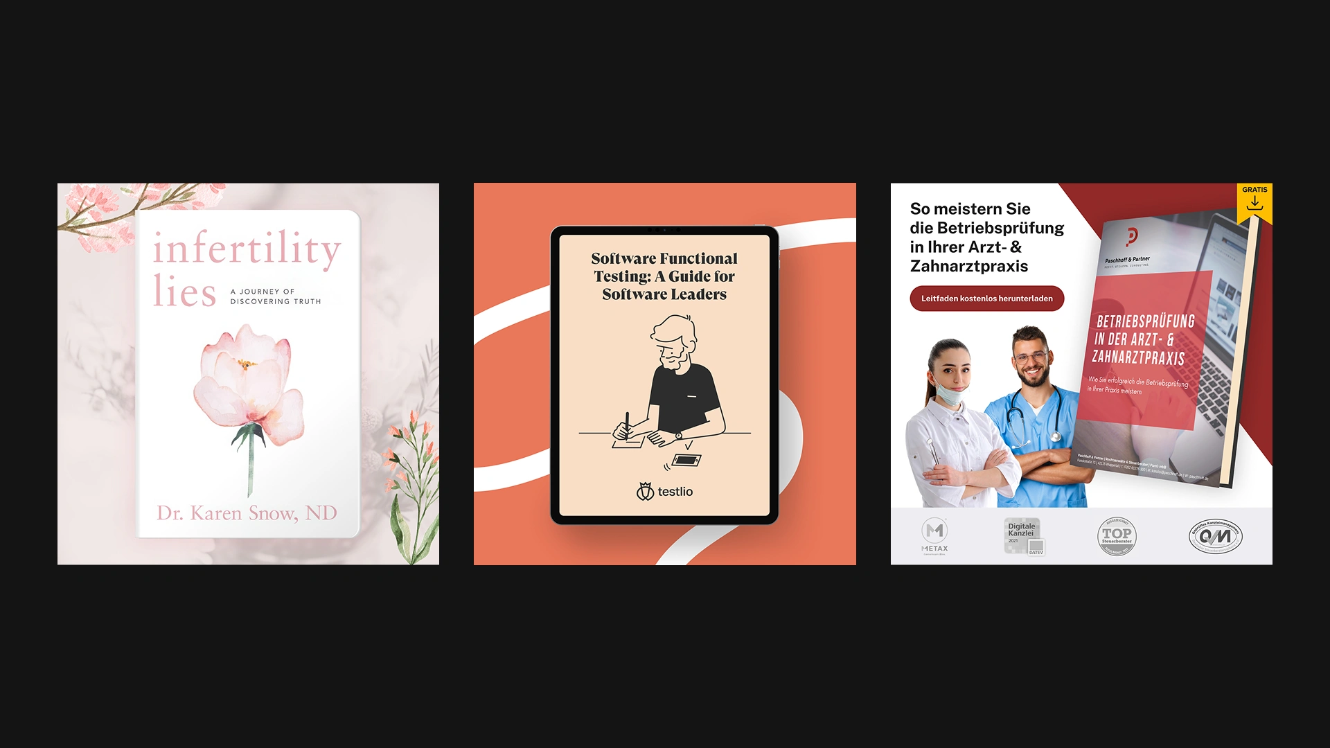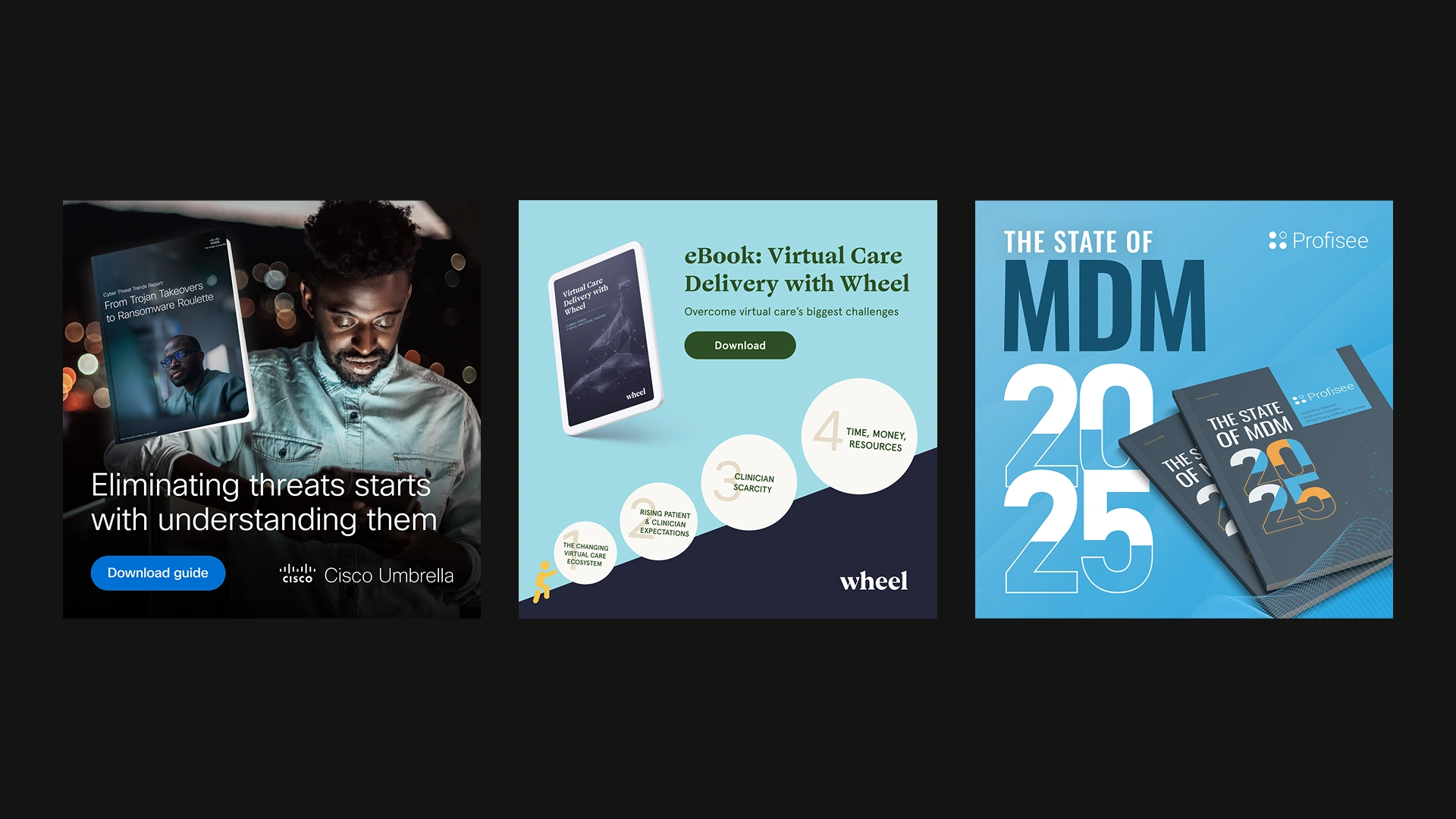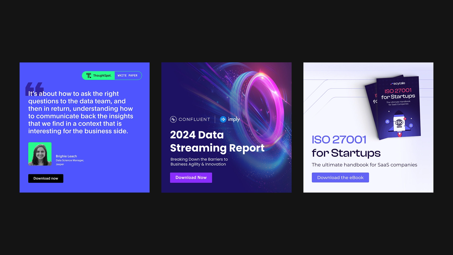 B2B SaaS ads for eBooks and guides. Technical resources are visualized through content mockups and previews to represent value and drive lead generation.