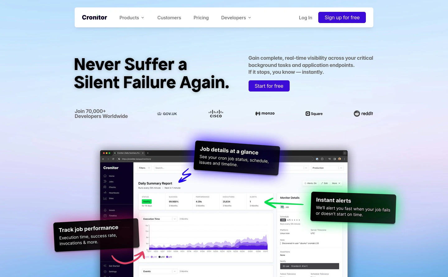The redesigned hero section gives Cronitor.io a cleaner, more approachable aesthetic while maintaining product credibility. It demonstrates how thoughtful design can improve conversion potential and elevate the brand’s first impression.