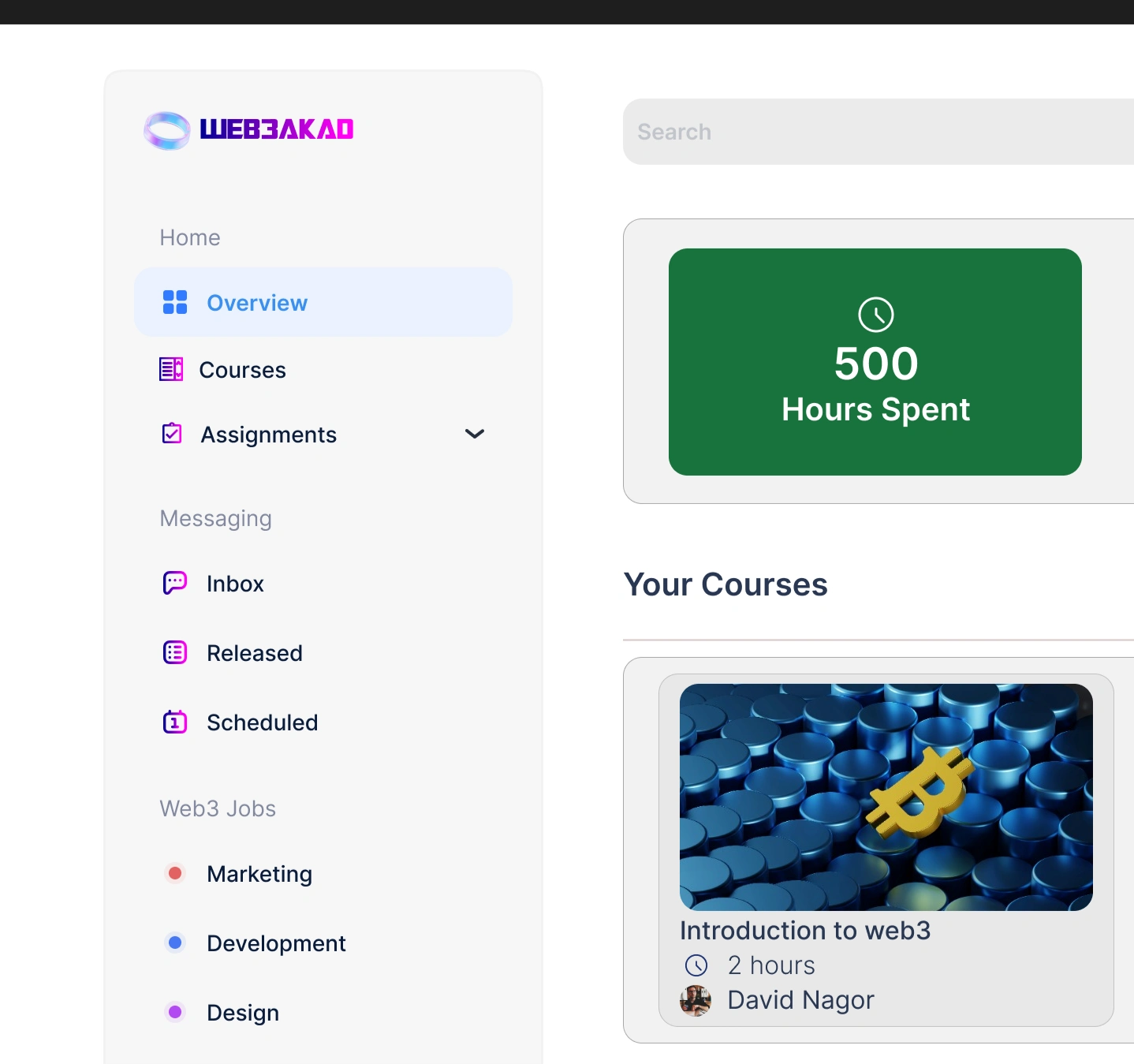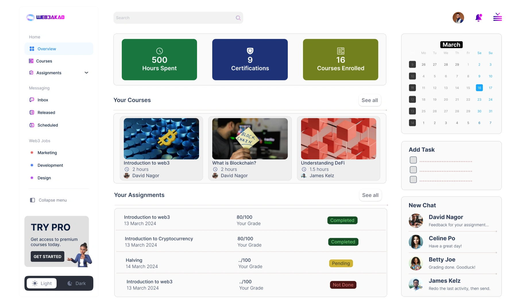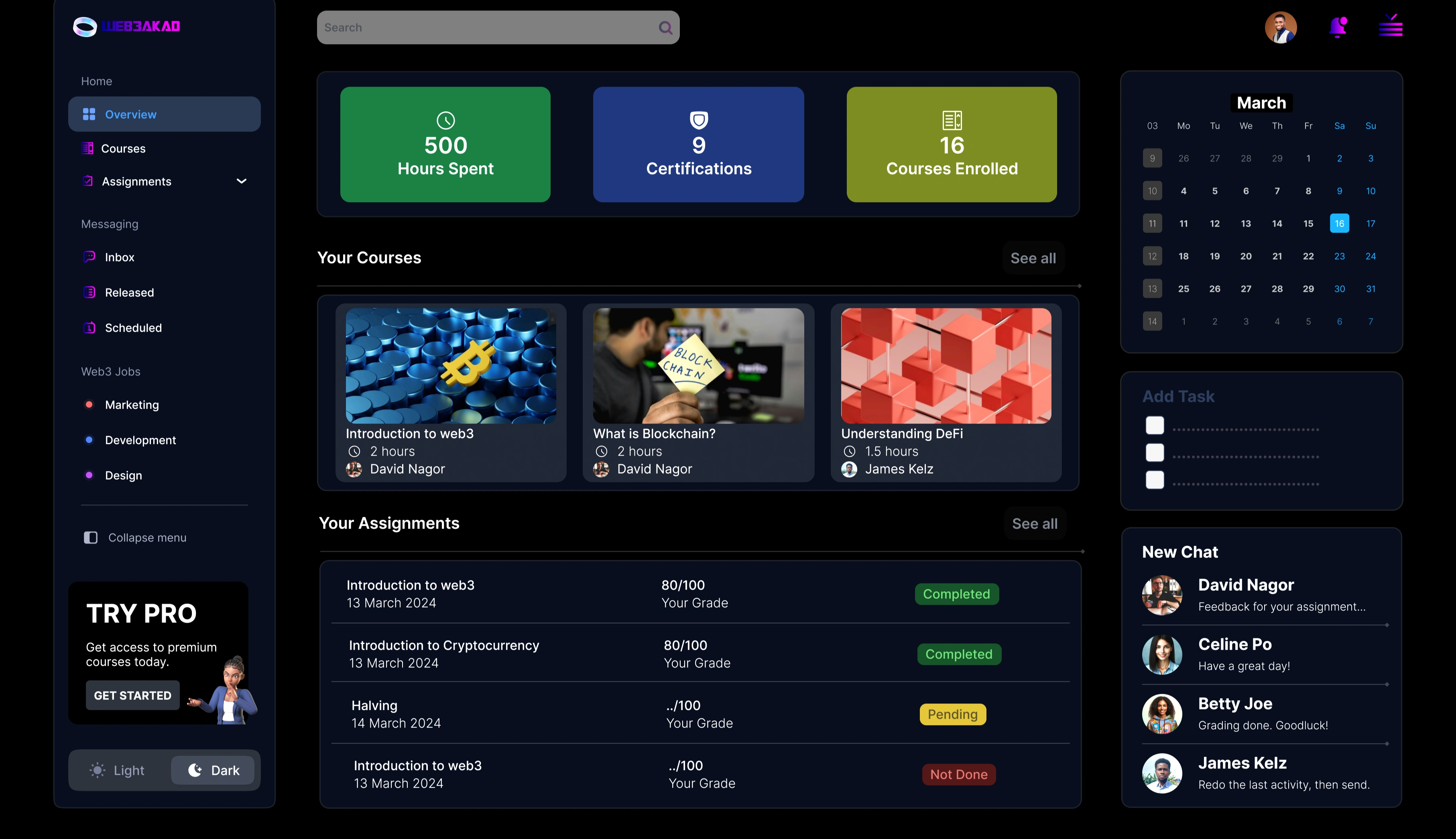E-learning dashboard to track progress and also encourage students to continue. Notified students of updates Userfriendly/unclogged interface