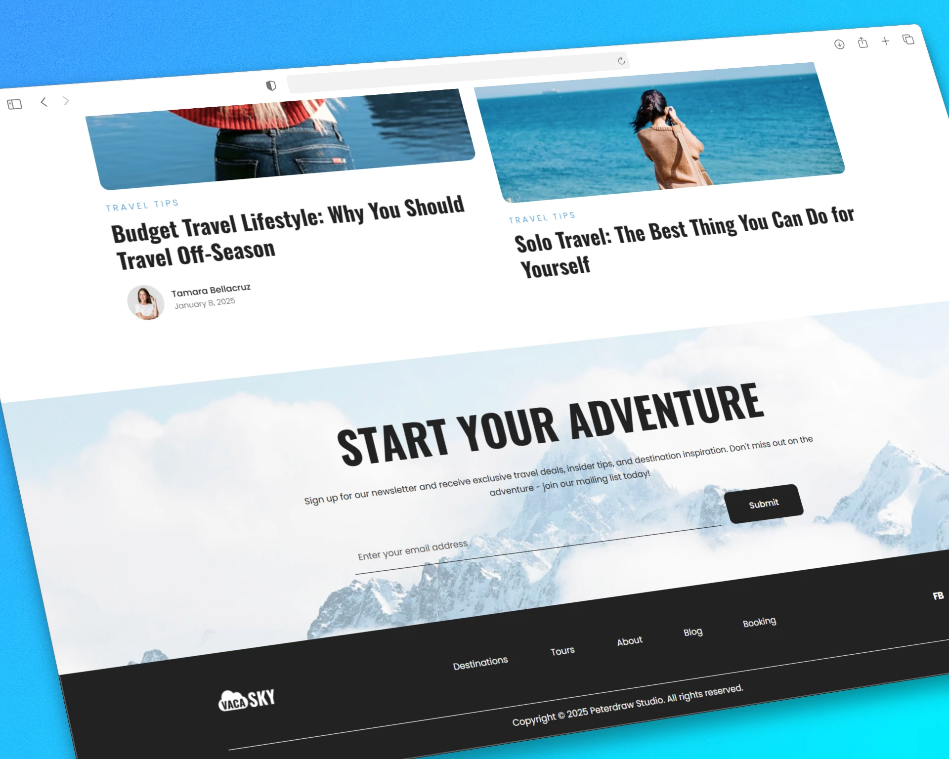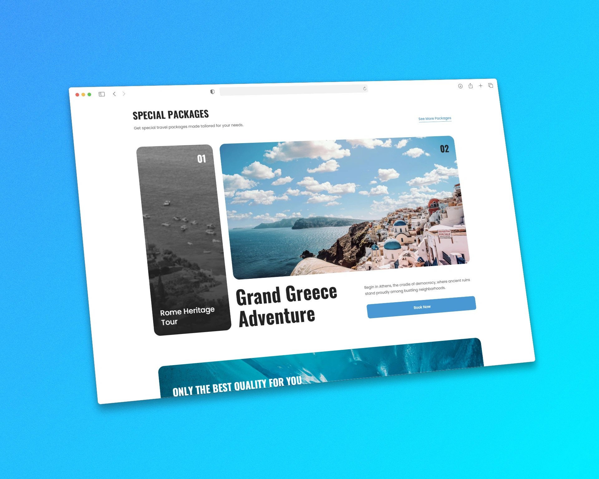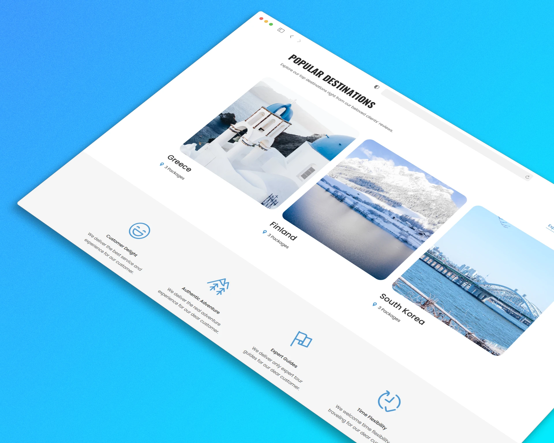 Destination Highlights: Created modular sections that highlight top travel destinations with engaging cards, eye-catching visuals, and brief descriptions to spark curiosity.