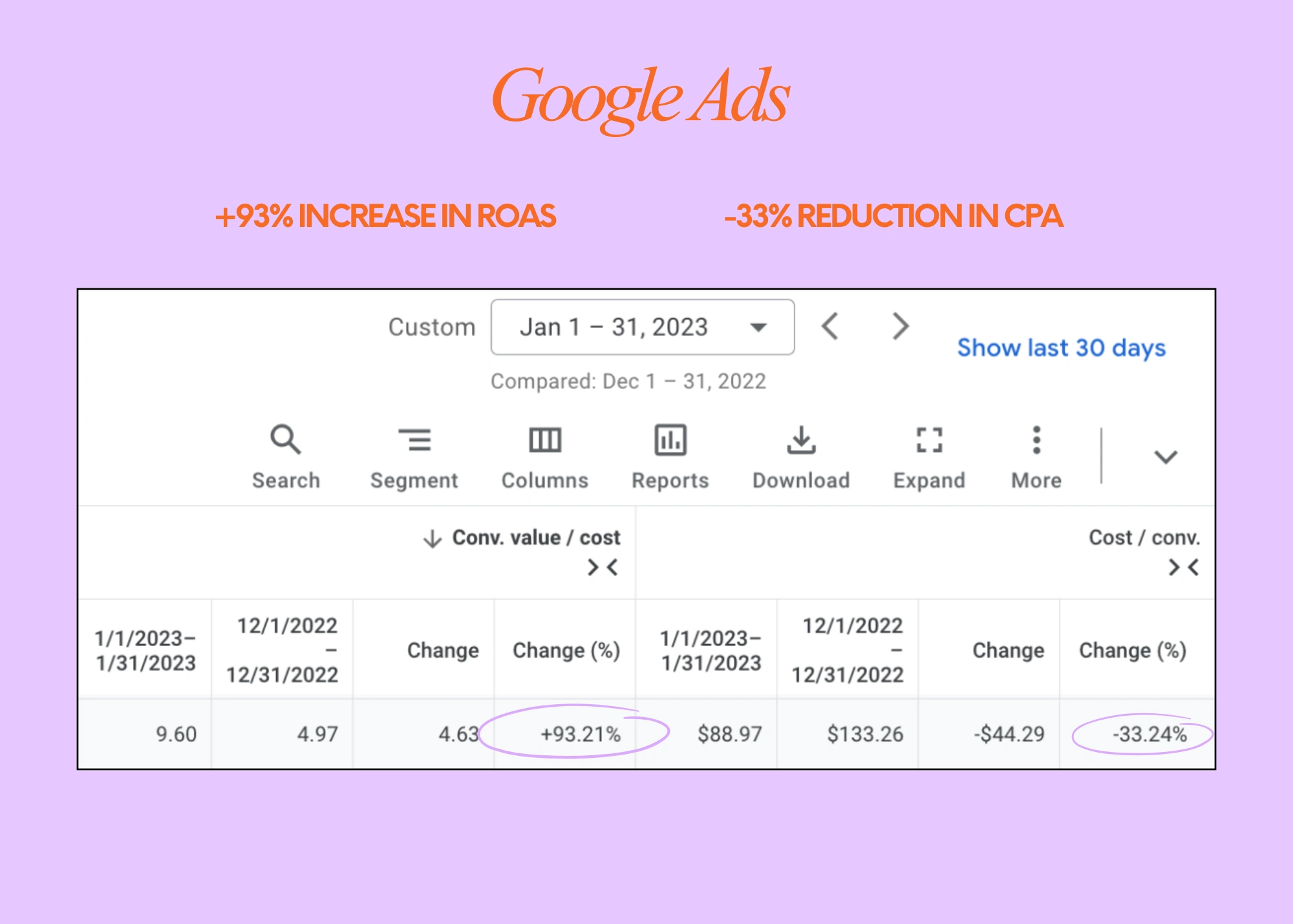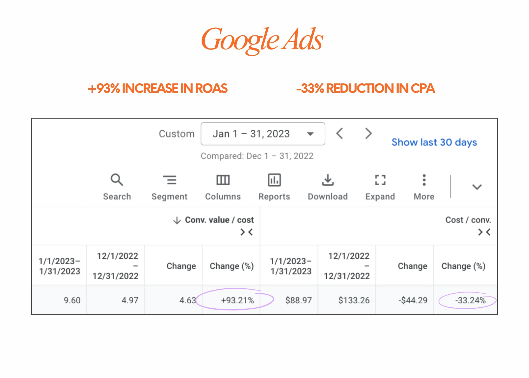 Restructured my clients Google Ads account which led to a 2x month-over-month increase in ROAS (+93% increase) going from a $5 ROAS to their goal of $10 ROAS.