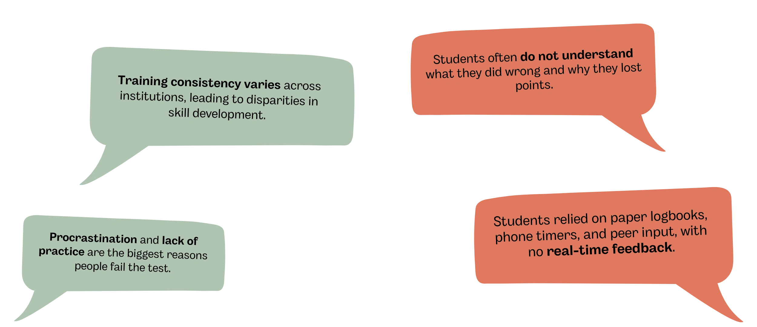 Students spend months practicing without clear feedback, which slows progress. | There’s no way to track how students are practicing or where they’re struggling. | But without real-time feedback, they can’t correct mistakes or know if they’re improving. |