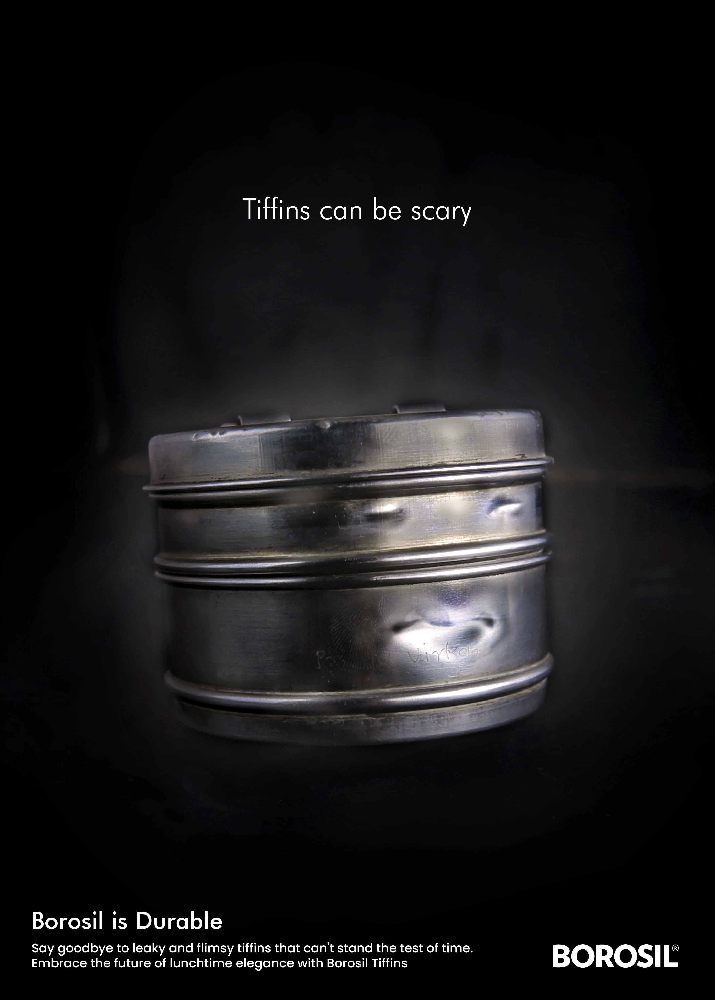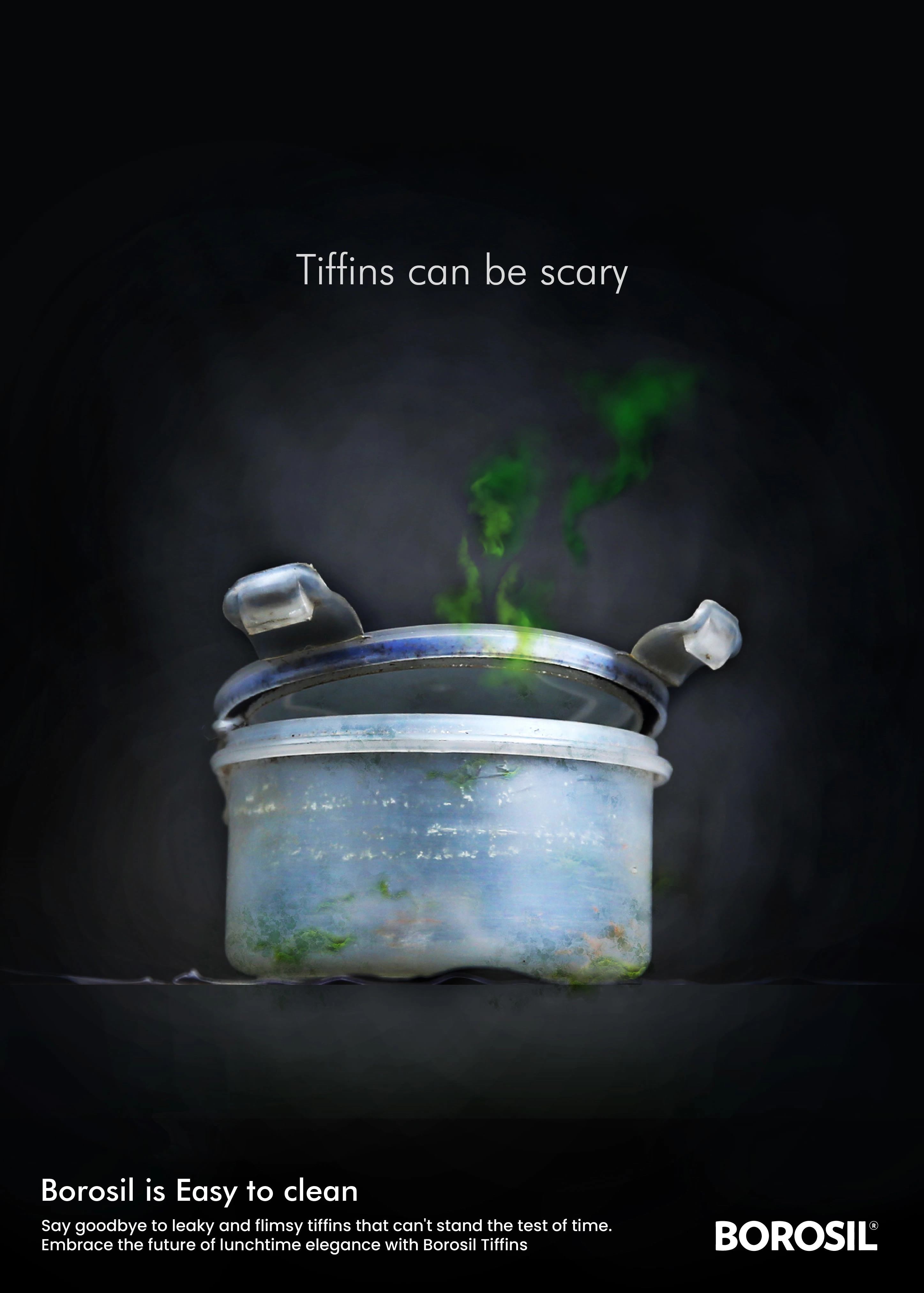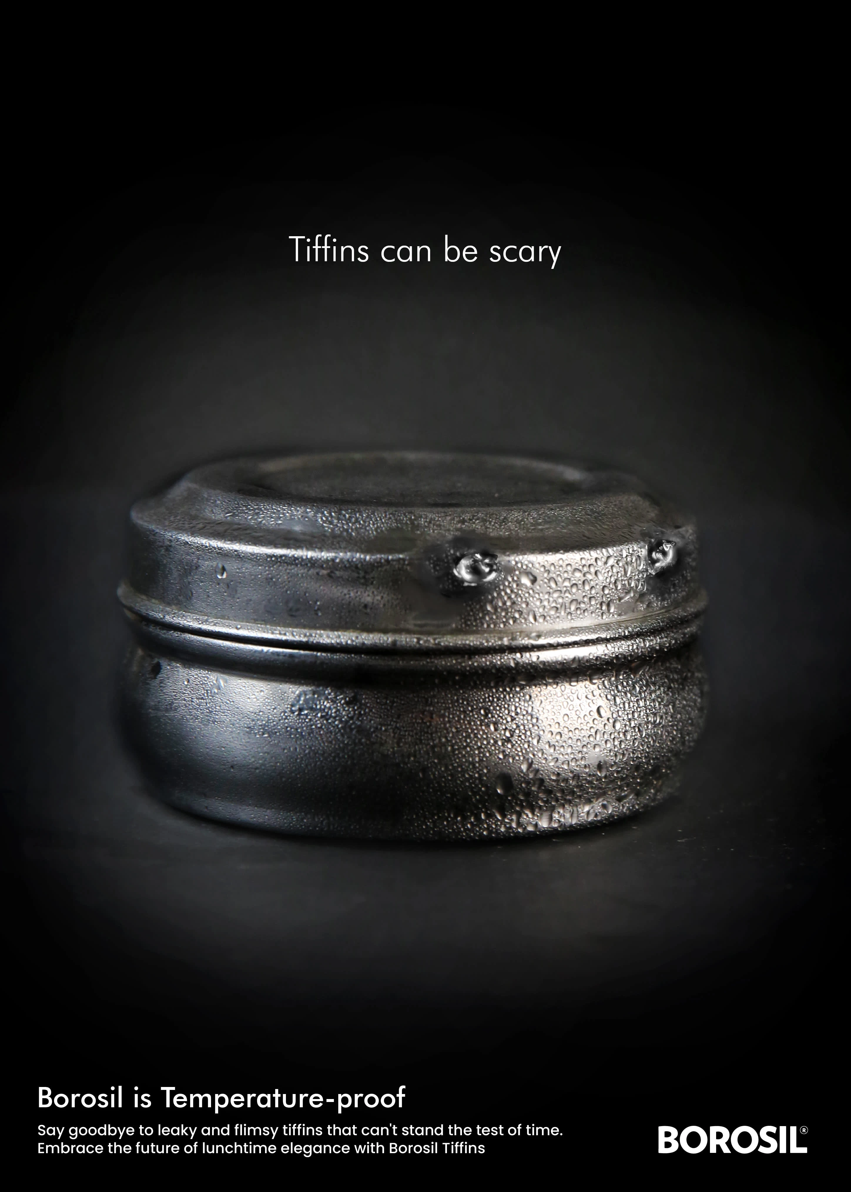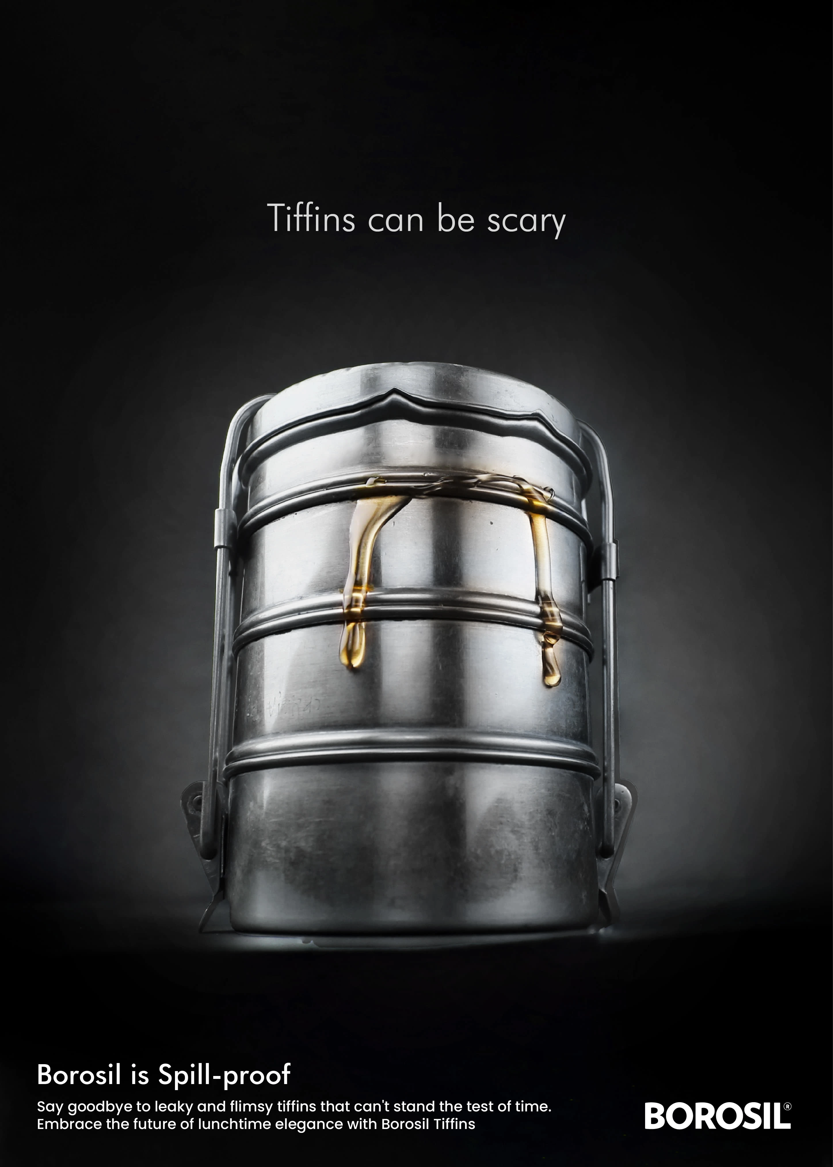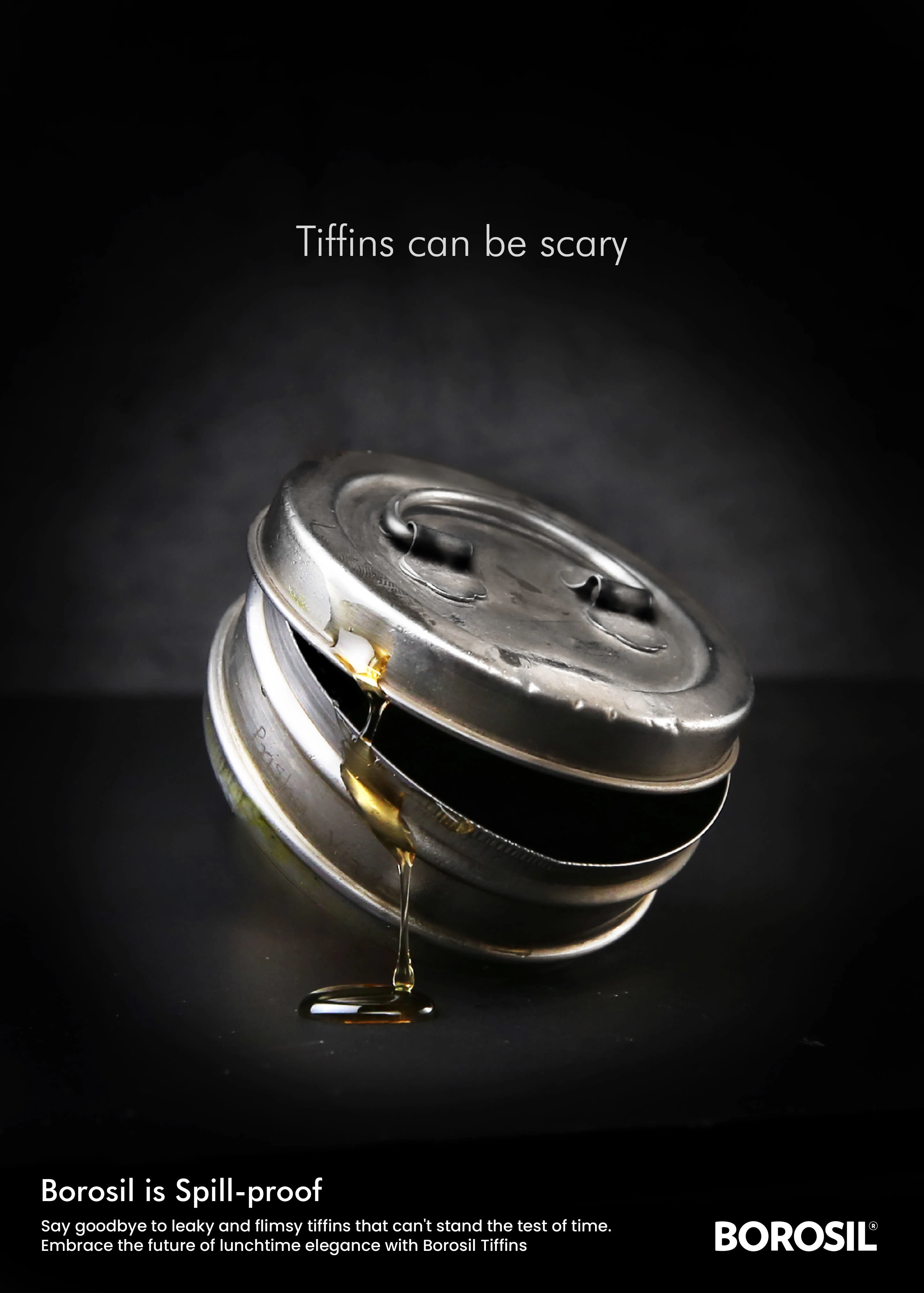 A witty print campaign turning the fear of leaky tiffins into a compelling case for Borosil. High-contrast visuals positioning the product as the hero.