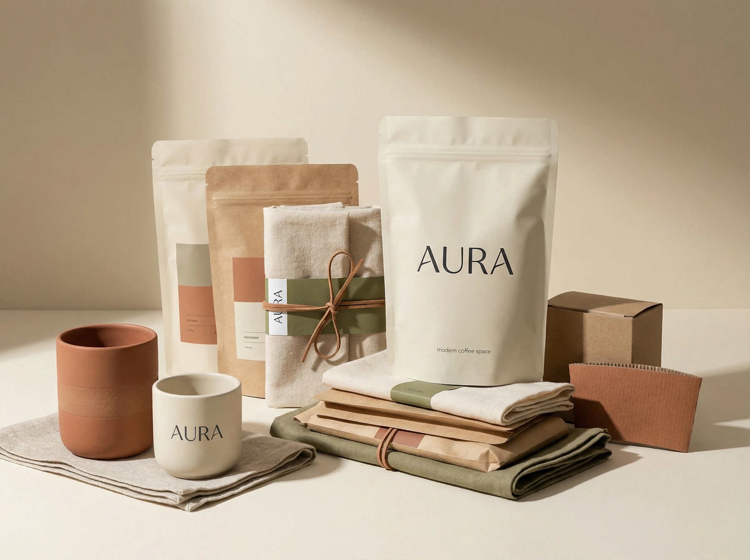 Minimal takeaway cups, sleeves and coffee packaging