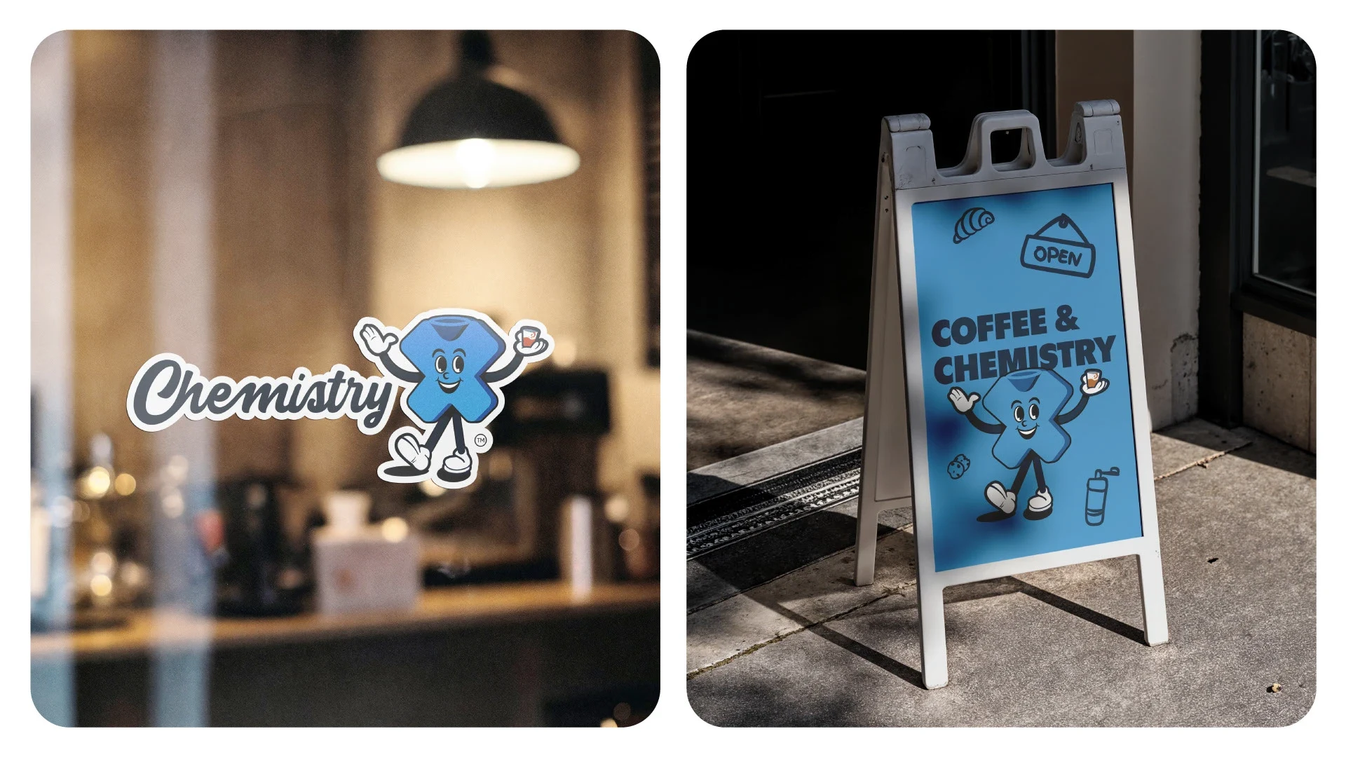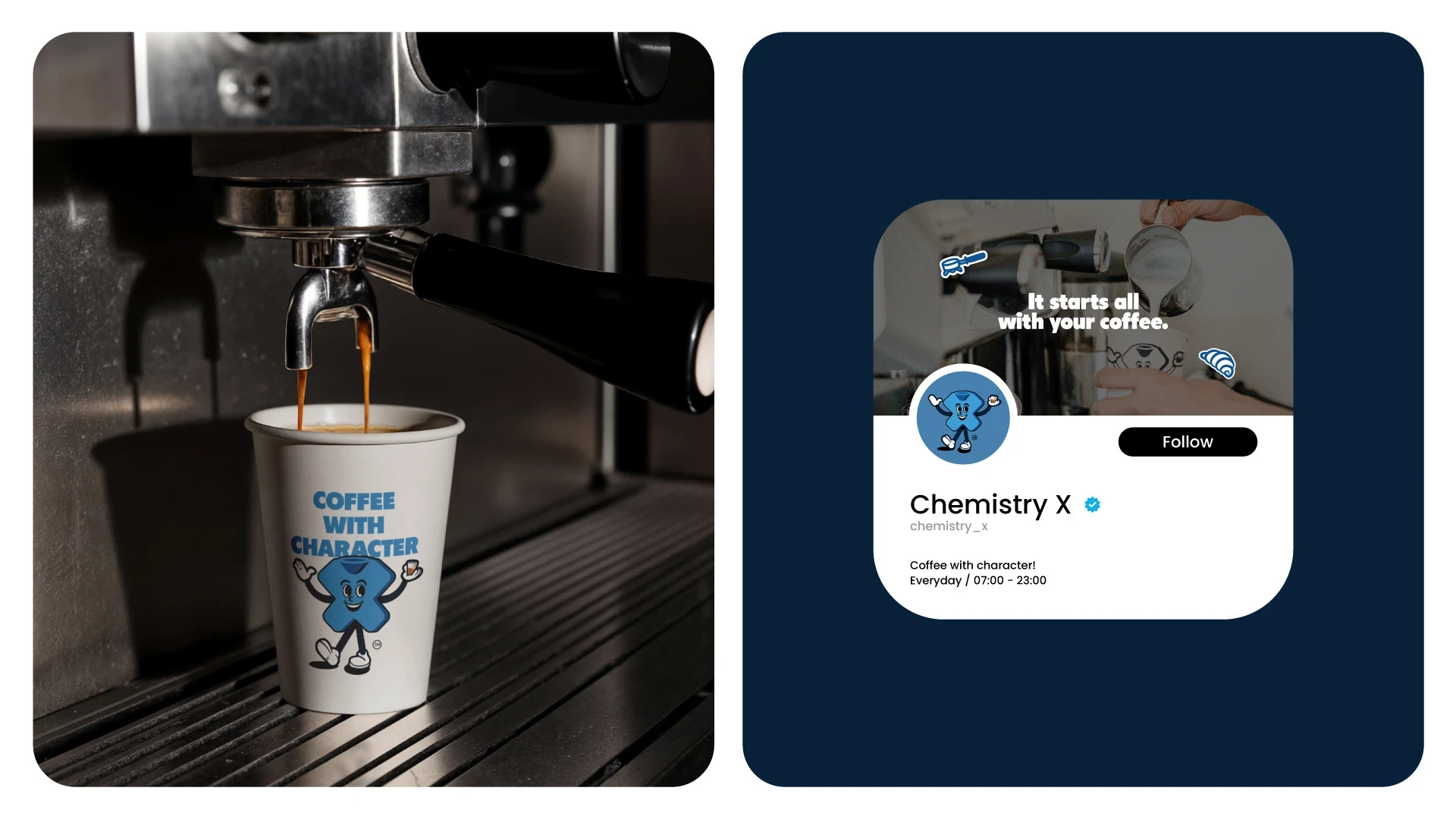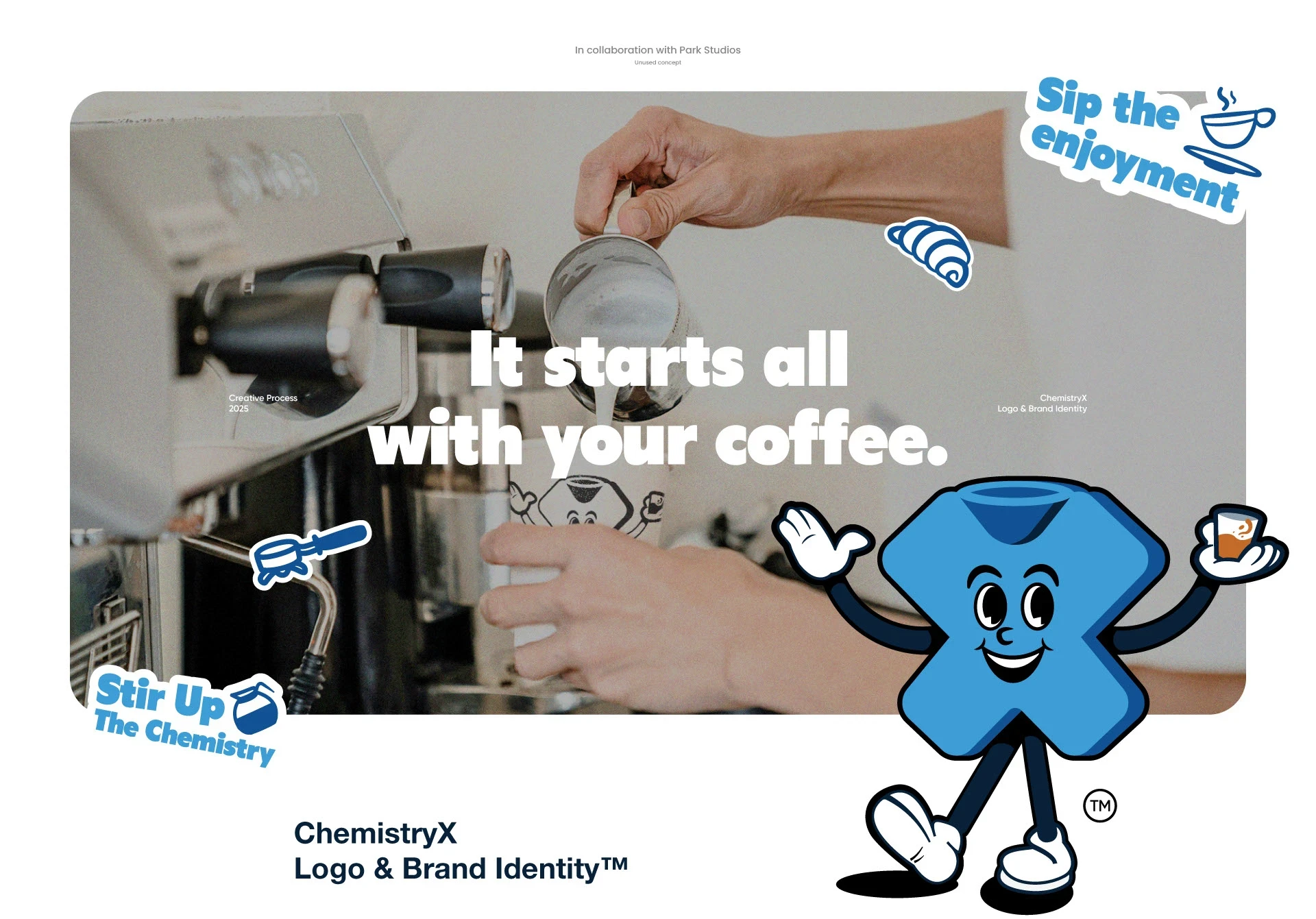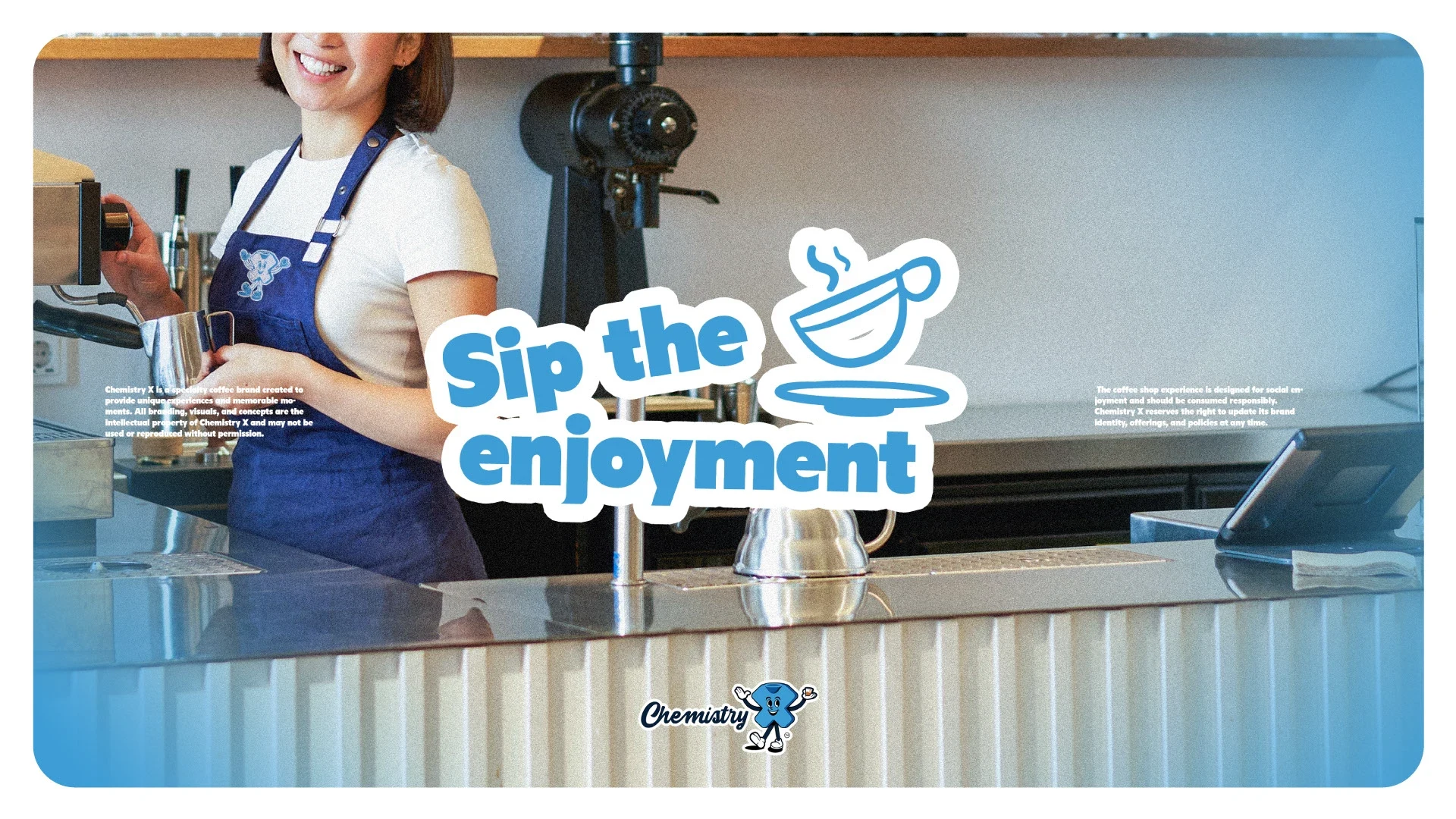 Blue is often linked to trust, honesty, and calmness, which makes it the perfect backdrop for genuine conversations between friends. The lighter blue brings in a sense of playfulness and openness, while the deeper navy grounds the brand with seriousness and stability. Together, they create a balance that reflects the essence of Chemistry X: a place where coffee isn’t just about warmth in the cup, but about the warmth of connection that grows when friends share it.