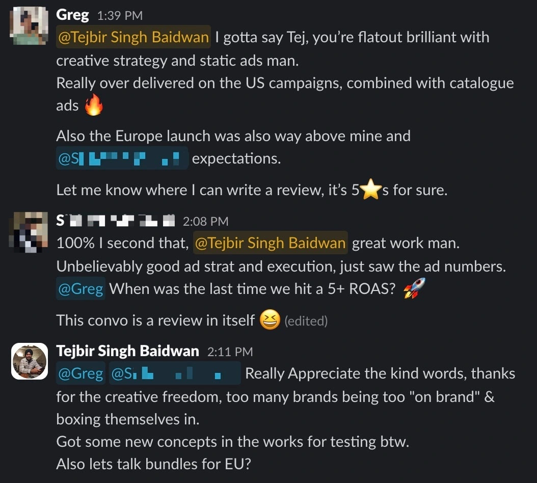 Real client feedback from brands I scaled with Meta Ads, Creative Strategy & AI Static + Video Ad Creatives driving 5x+ ROAS.