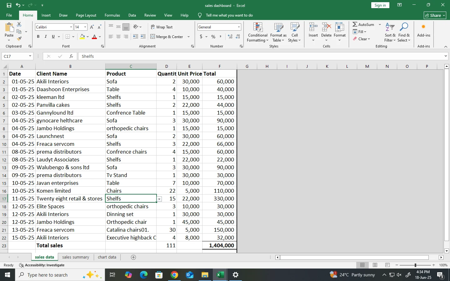 Built a clear Excel sales tracker for a furniture store—organized client orders, automated totals, and boosted monthly sales clarity.