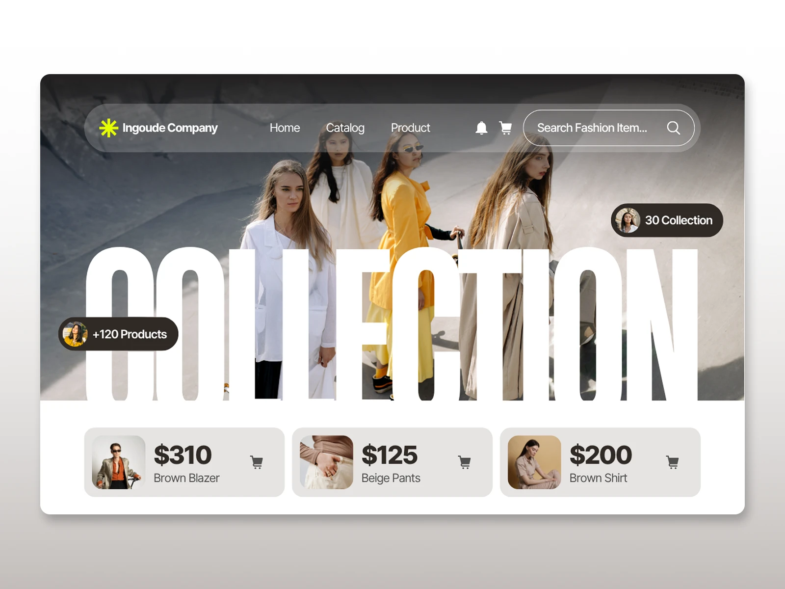 Ingoude Company needed a bold, dynamic landing page to showcase their new fashion line, targeting a young, style-conscious audience. The objective was to create an energetic and easily navigable experience that immediately highlights the breadth of their "COLLECTION" and encourages immediate browsing and shopping.