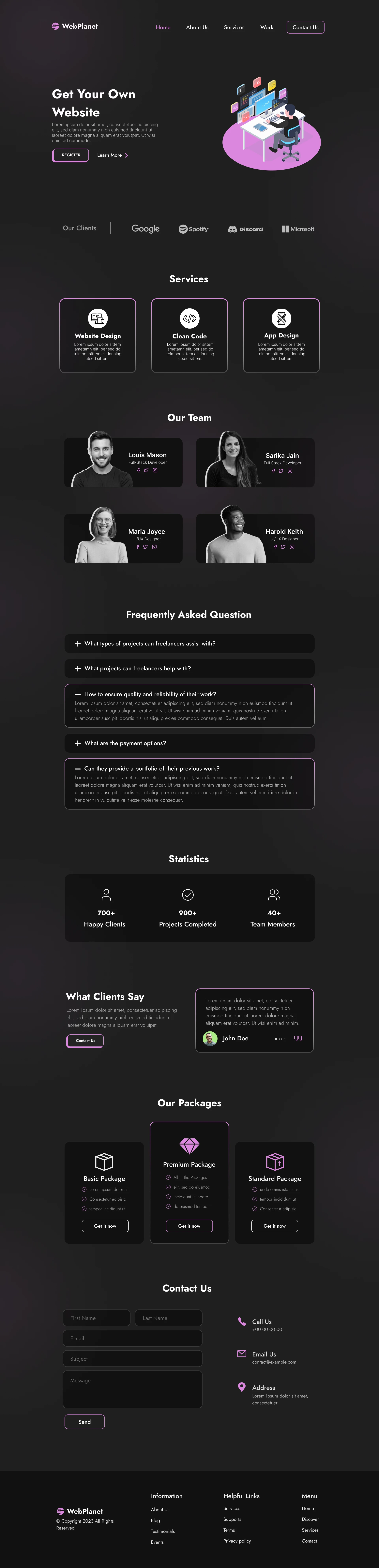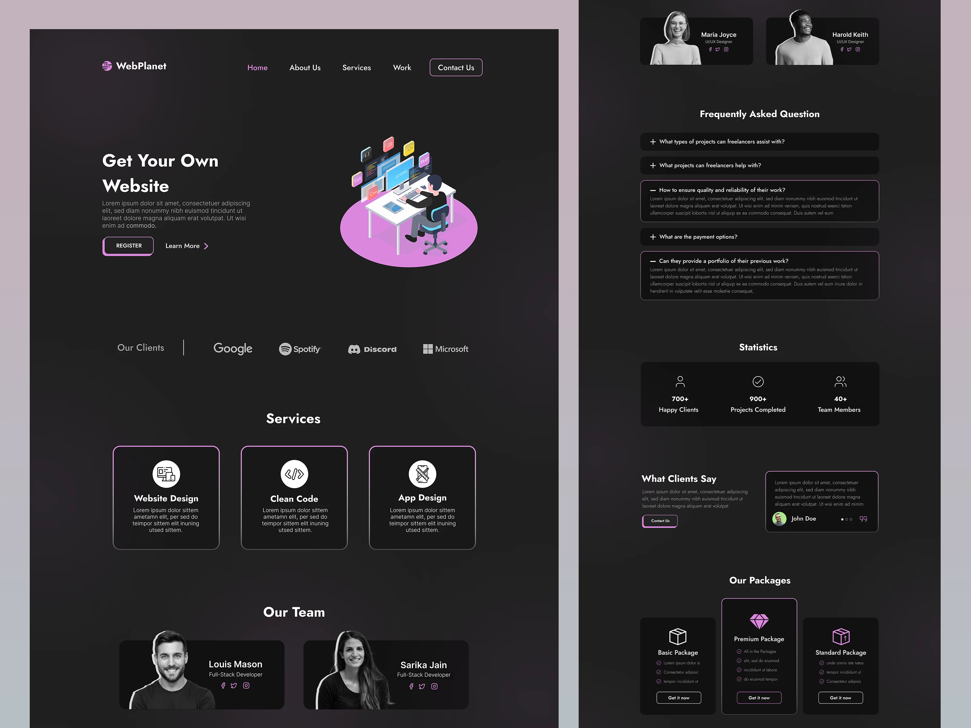 This website has a purple color scheme and offers design and coding services.