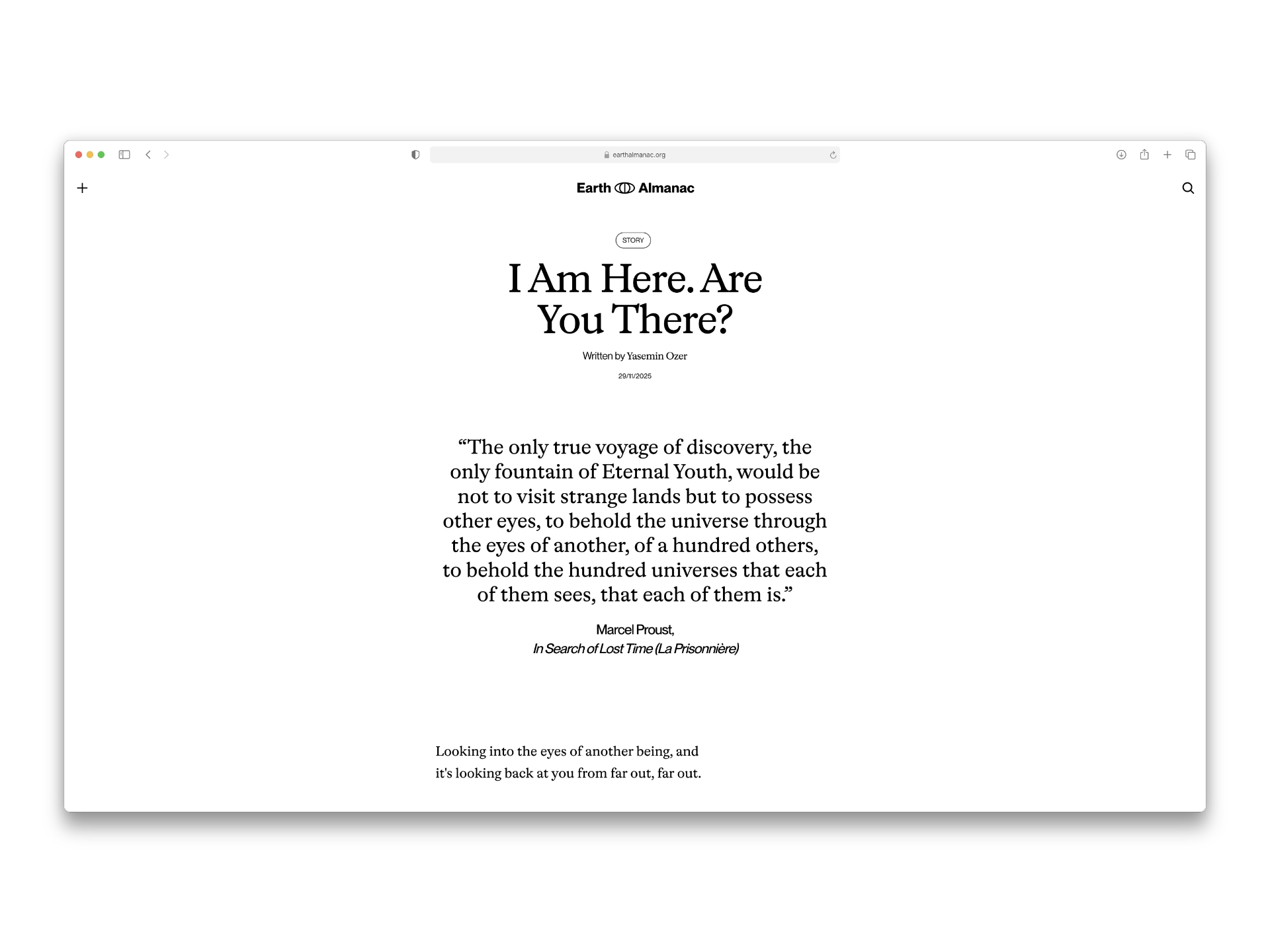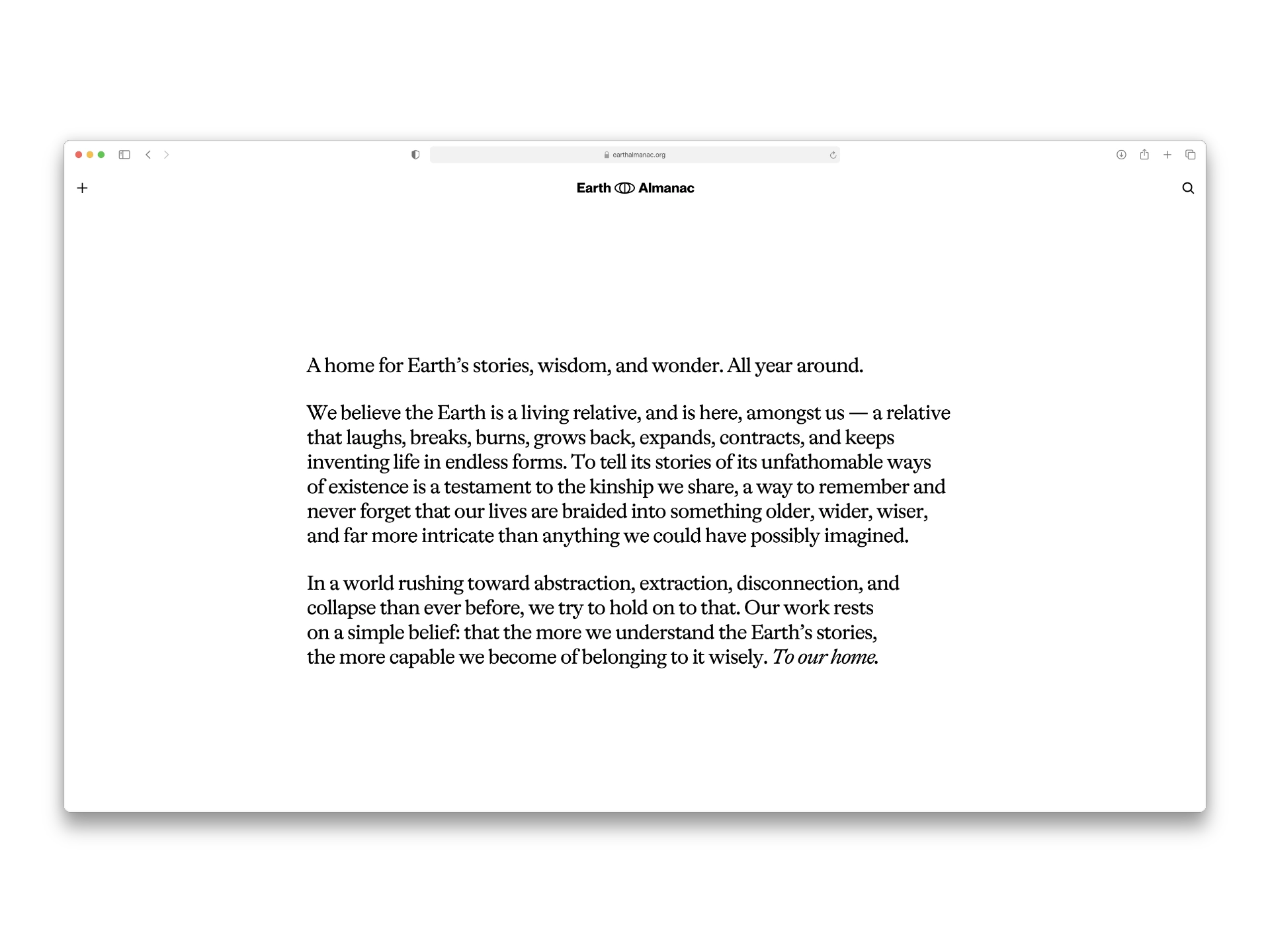 Earth Almanac is a collaborative project built on a simple belief: that the Earth is a living relative. In a world that the editors describe as "rushing toward abstraction, extraction, and disconnection," the project serves as a space to slow down. It is a home for long-form writing that explores the kinship we share with the planet—reminding us that our lives are braided into something older and wider than ourselves.
