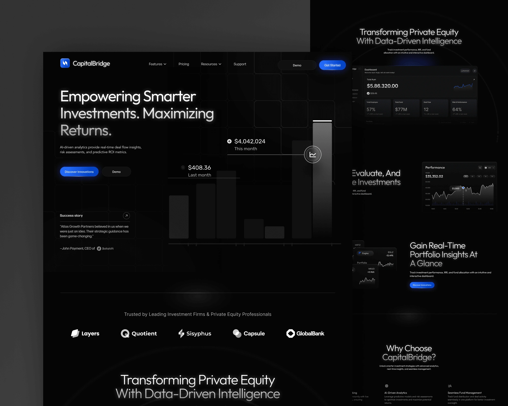 The interface features a modern dark theme with cool blue accents to reflect trust, innovation, and future-focus. Minimal layouts, bold typography, and data-driven visuals create a clean yet powerful experience tailored for investors and founders alike.
