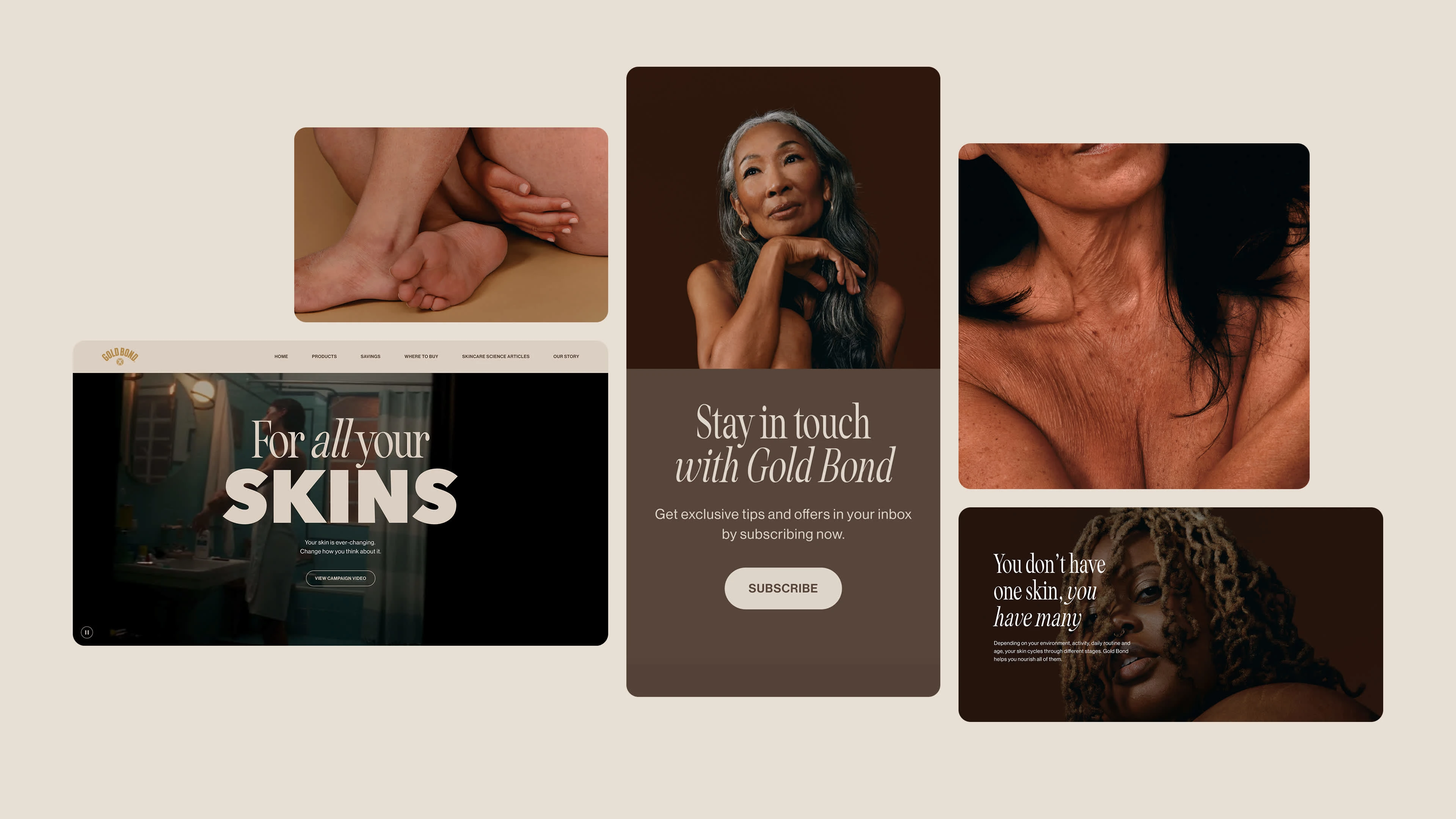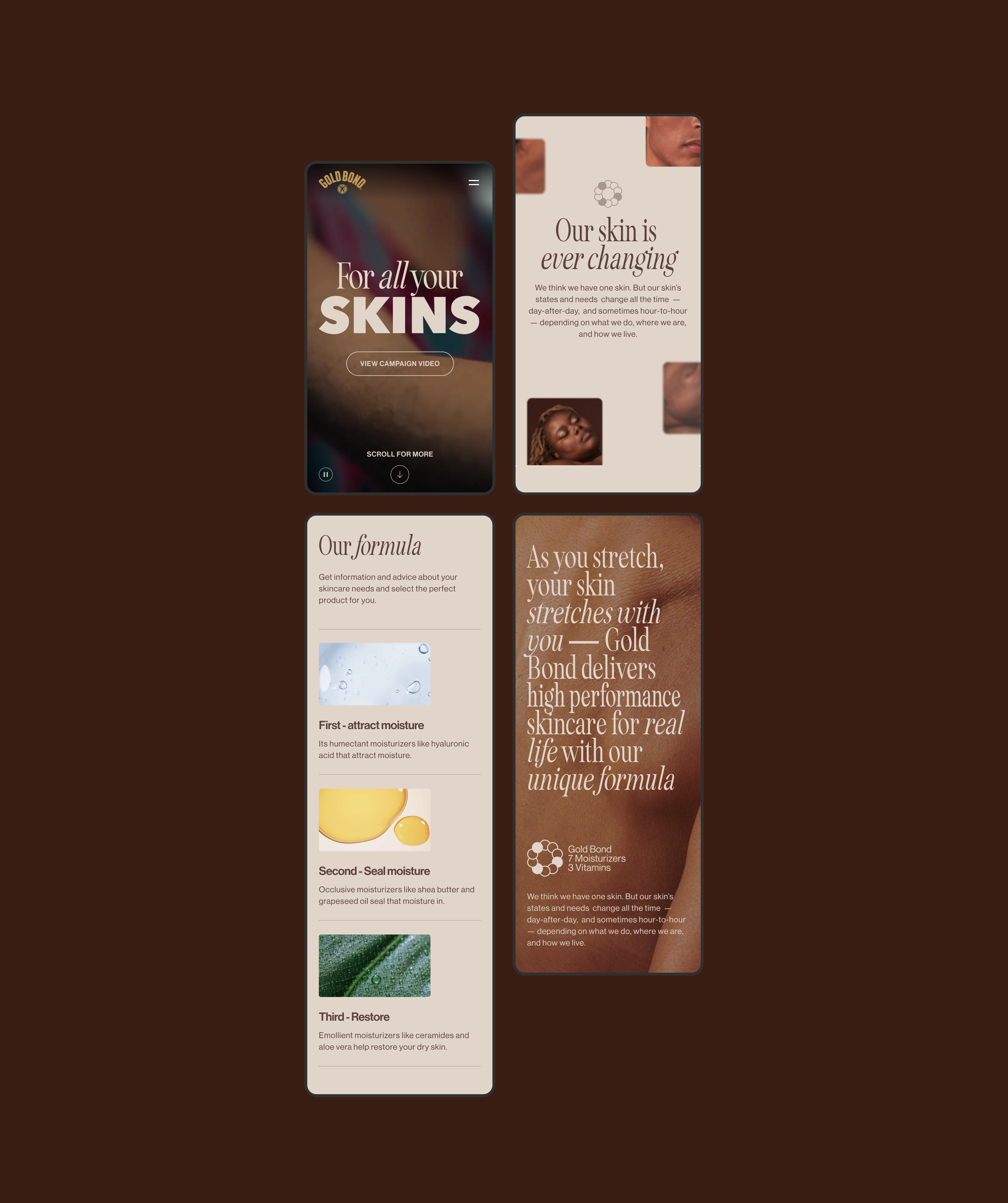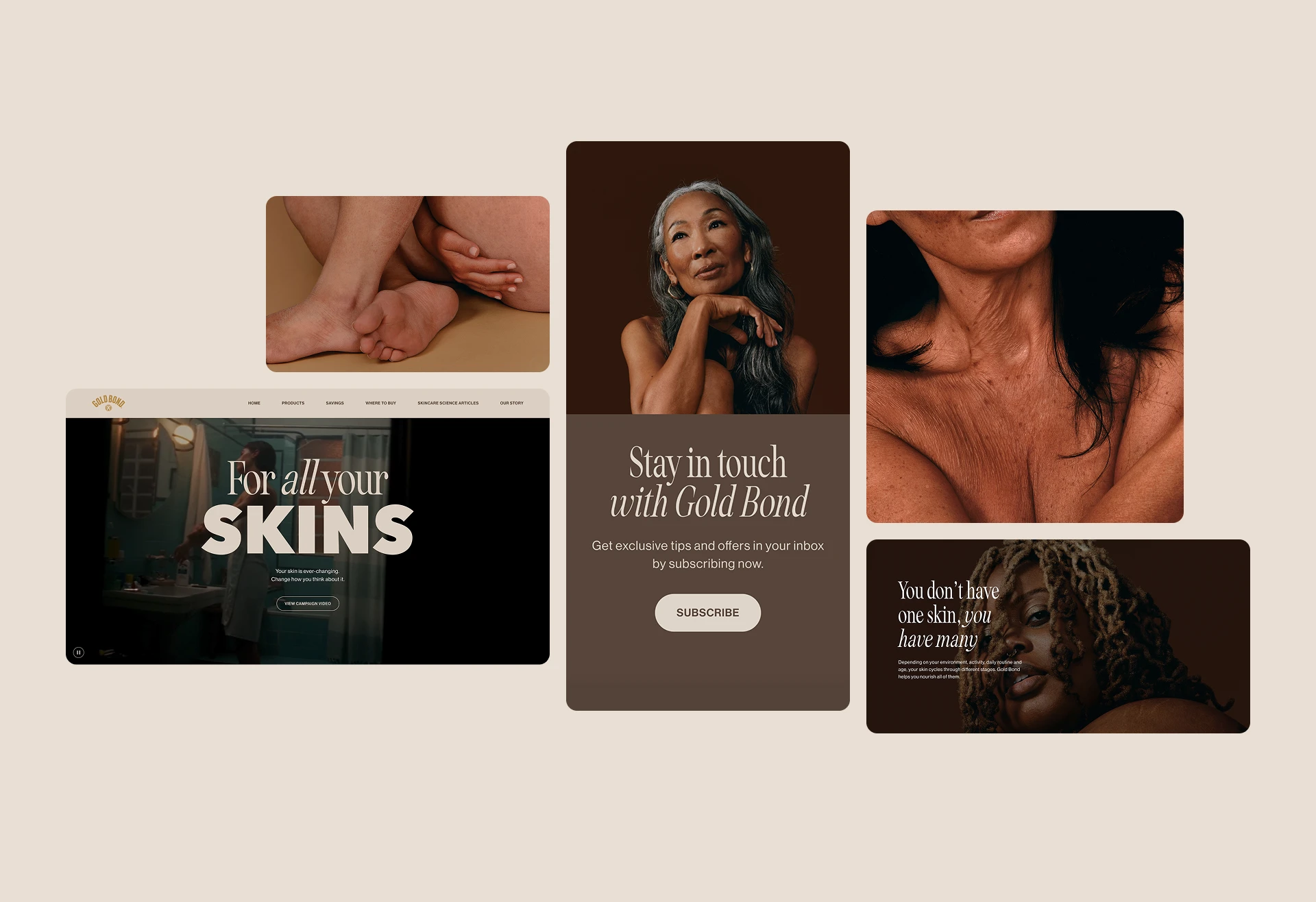We partnered with Gold Bond to revamp their brand image. Our mission was to recast Gold Bond as a modern, attractive brand, reintroducing their refreshed identity to new and existing customers while emphasizing the transformative power of their unique 7+3 skincare formula.