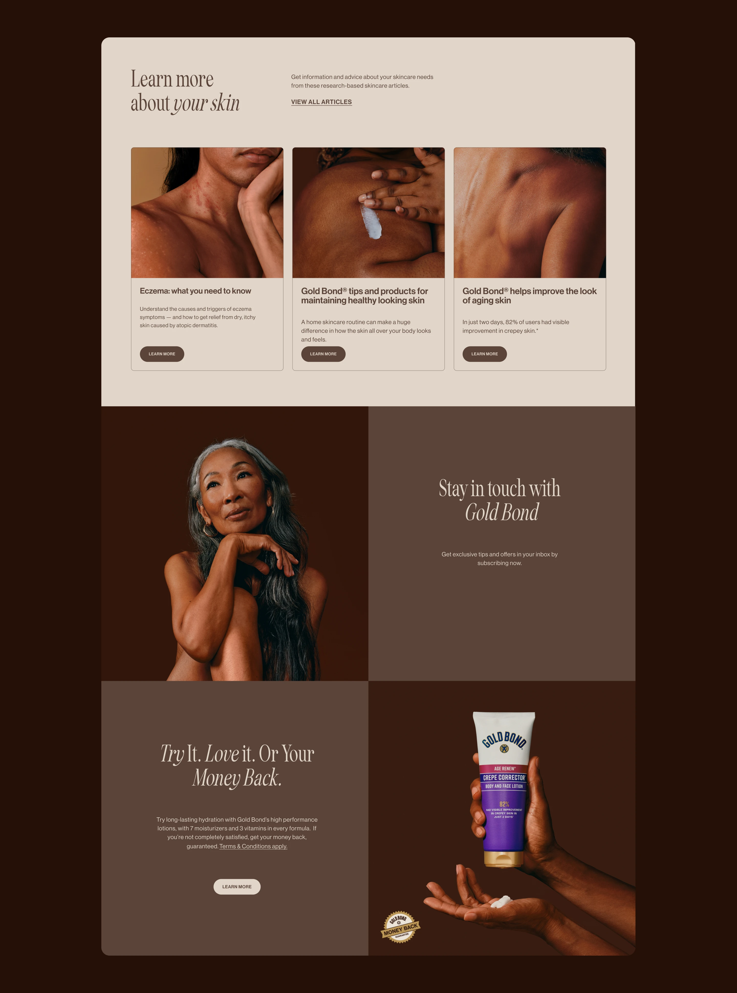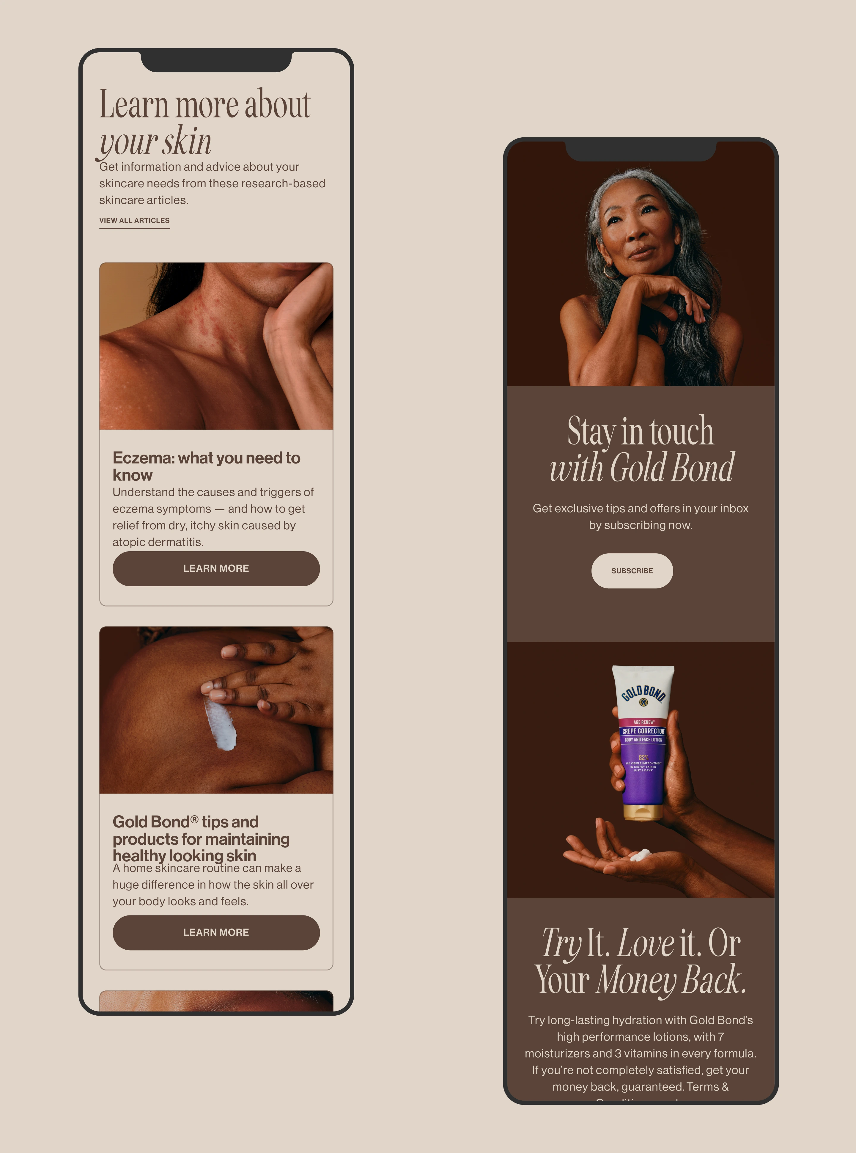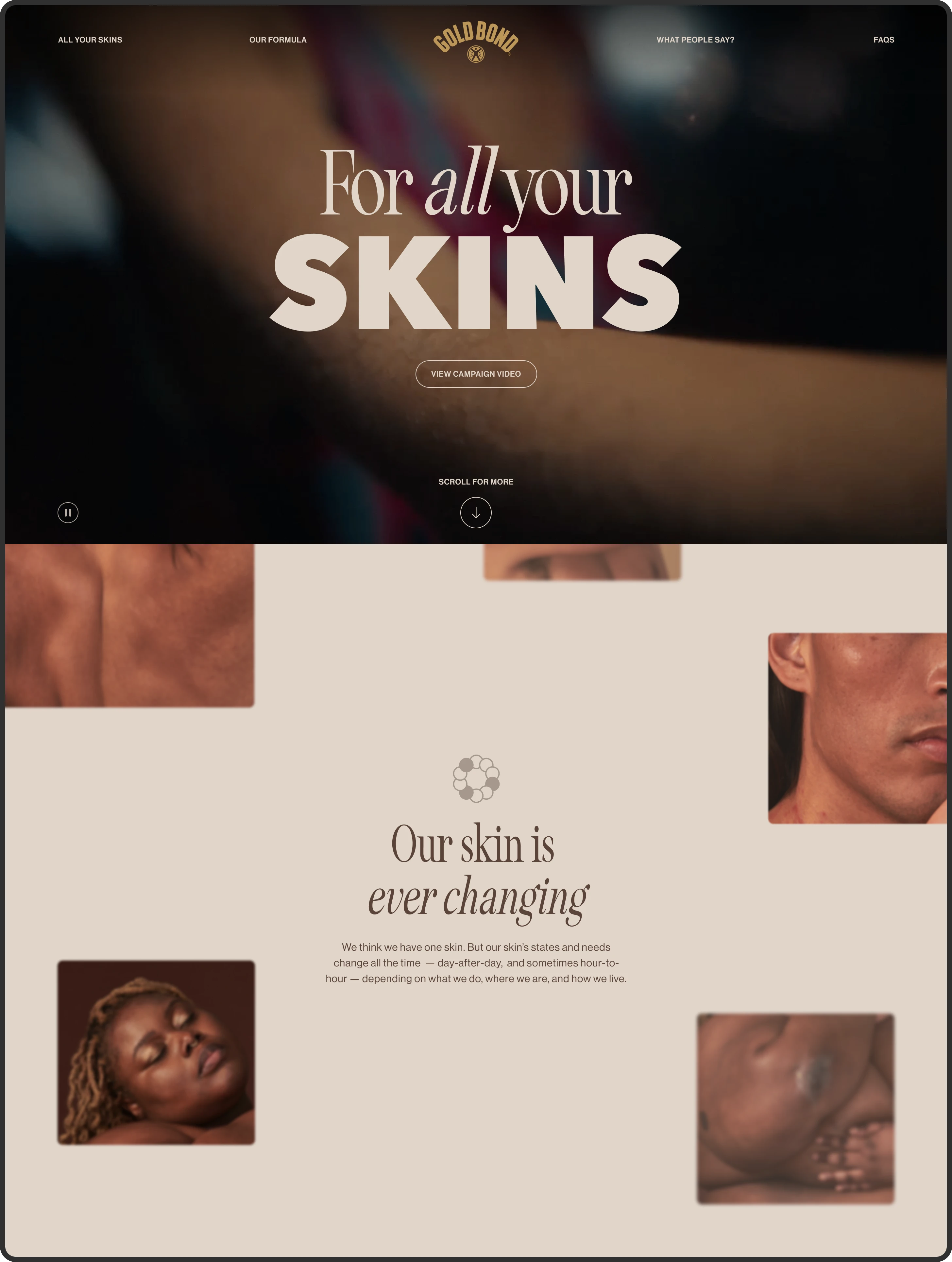 We partnered with Gold Bond to revamp their brand image. Our mission was to recast Gold Bond as a modern, attractive brand, reintroducing their refreshed identity to new and existing customers while emphasizing the transformative power of their unique 7+3 skincare formula.