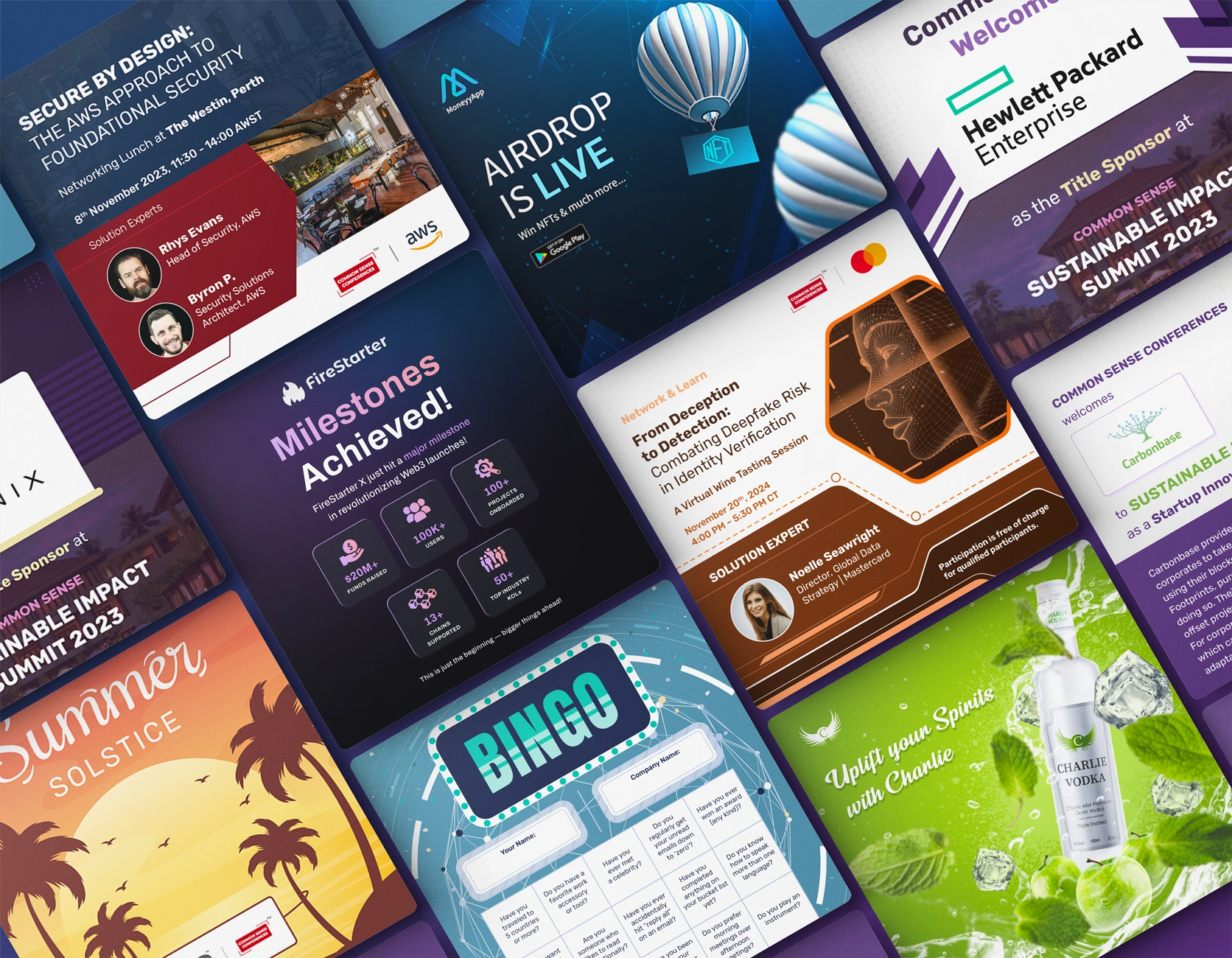 This section showcases my work with static designs, including clean graphics and clean aesthetics. Each post is crafted to effectively communicate the message while maintaining a visually appealing style, tailored to the topic at hand. It includes event posts and other creatives for top clients like Mastercard, Adobe. HPE and more.
