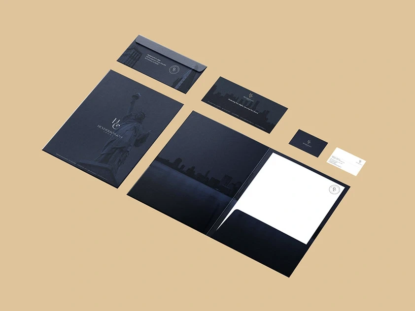 Henderson & Co. Legal needed a strong, professional brand identity that reflected their expertise and credibility. Their request included a logo, business stationery (letterhead and business card), a folder for client documents, and a small promotional flyer.