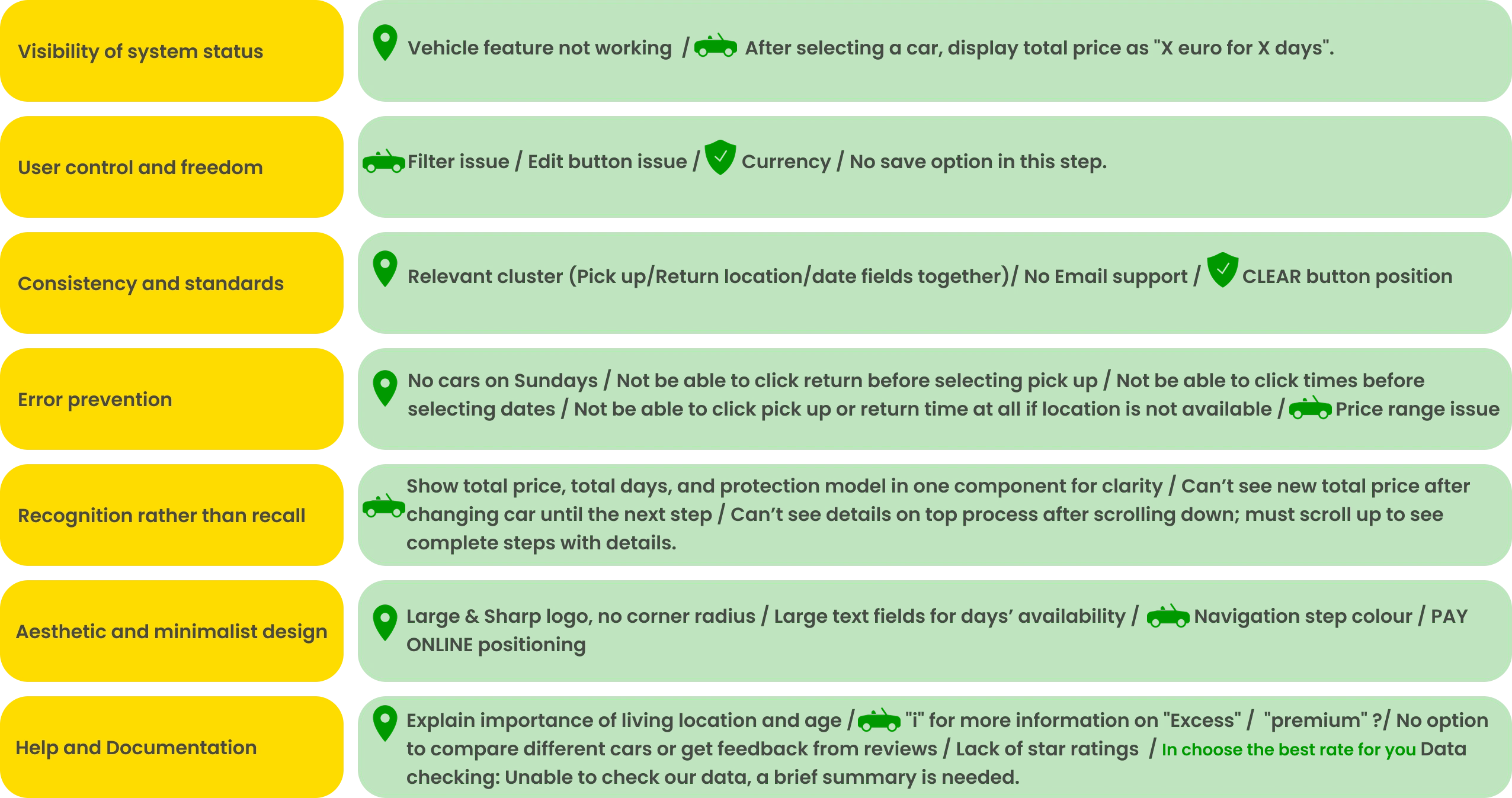To see what competitors are doing in the rental car service, I had a competitor analysis for the Avis and Dollar companies. It allows me to take an in-depth look at how others solve the same design problems.