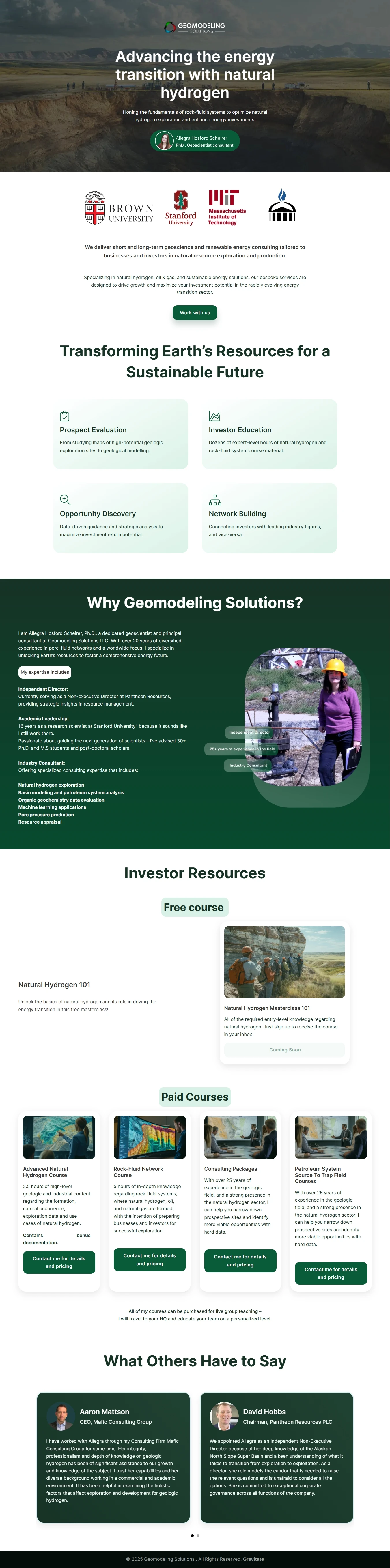 Challenge:Geomodeling Solutions needed a hydrogen consultant landing page to promote its course offerings on natural hydrogen and rock-fluid systems. As a Ph.D. geoscience expert, the client required a page that built trust, simplified technical content, and effectively engaged consultants, investors, and energy professionals. The design also had to be optimized for speed and usability within Bricks on WordPress.