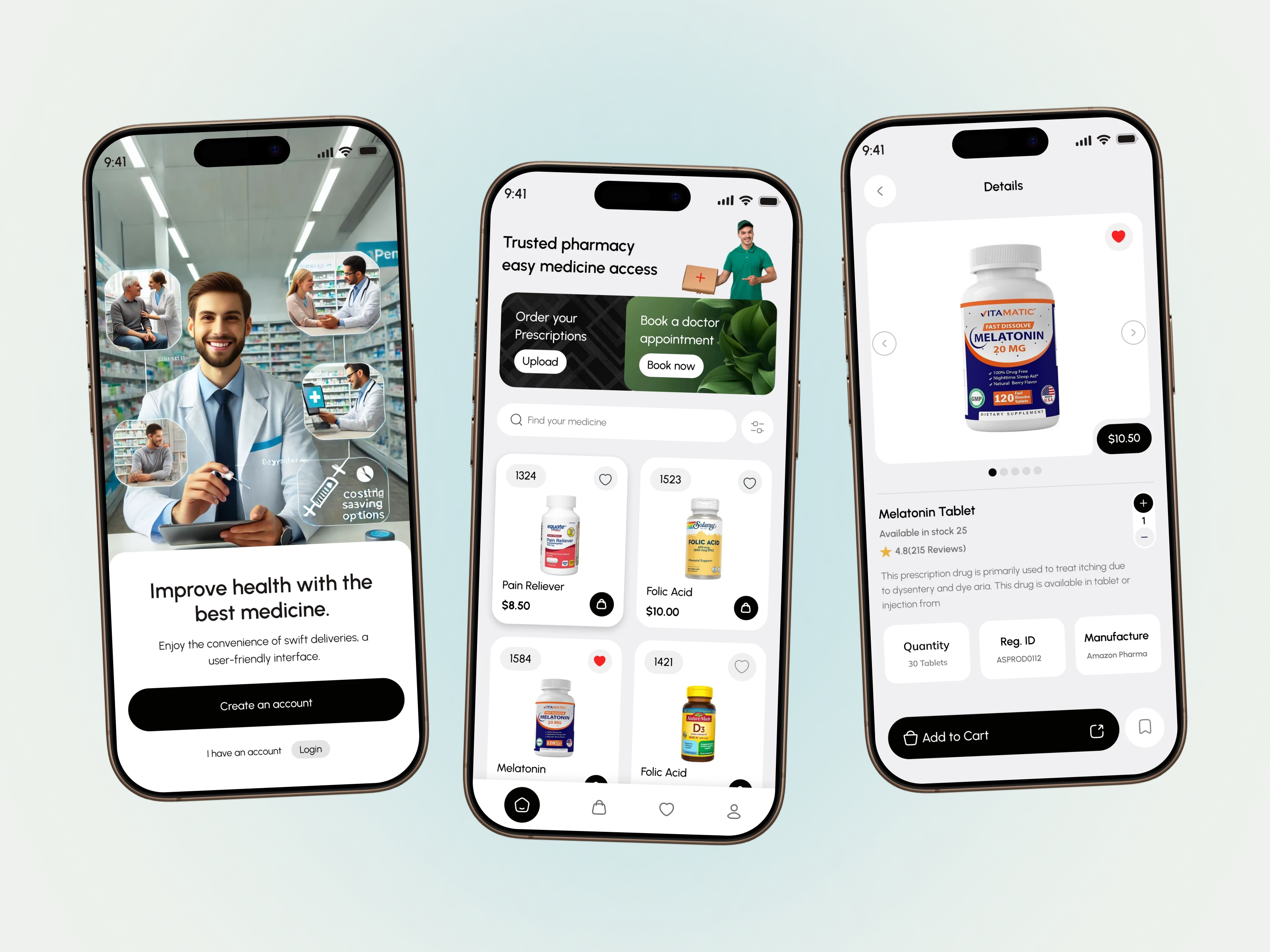 Pharmacy Mobile App UI/UX design focused on easy medicine search, prescription uploads, and seamless ordering. Clean, modern interface with user-friendly navigation to enhance healthcare accessibility. Designed for a smooth customer experience from browsing to checkout. Perfect for pharmacies, clinics, and health services.