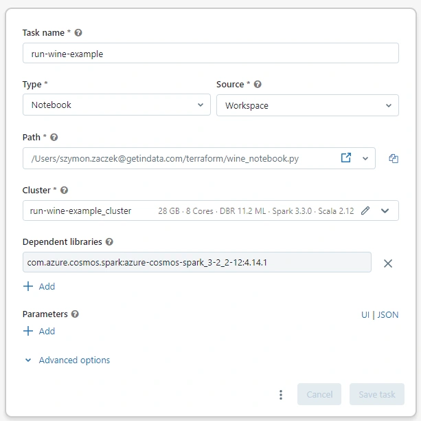 - data "databricks_current_user" "me"azurerm and databricks. As you can see, there is an additional option specified for key_vault within the azurerm provider and that is purge_soft_delete_on_destroy. Since the infrastructure showcased here was never intended to be used in real production workflows, by leveraging this option we make sure that key_vault content is purged along with its deletion.“null_resource” . “get_aad_token_for_dbx” resource is used for Azure CLI call that retrieves a token including flag — resource 2ff814a6–3304–4ab8–85cb-cd0e6f879c1d, which is Azure’s programmatic ID for Databricks workspace. The output of Azure CLI call is piped to jq command: jq -r .accessToken > %s which outputs token value to %s. The whole CLI call and a pipe is wrapped within the native Terraform format() command, which maps %s to the name of the file that is used for keeping the AAD token. As specified in variables.tf file, it is aad_token.txt.data block that is specified here as ”local_sensitive_file” “aad_token_file”.provider “databricks” block, where we specify its content as a token, while also taking care of redundant file formatting that might have got into the file, depending on our operating system of choice. This trimming is done via the trimsuffix function.terraform plan or terraform apply command. If the resource group is not modified in any way in the message received after running one of those commands, your definition completely matches the definition of an already existing resource group. Otherwise, you can either modify your code or overwrite the definition of the resource group.account_kind and is_hns_enabled in azurerm_storage_account resource must be specified to StorageV2 and true, respectively.resource_group_name and its location, we just take advantage of the fact that those attributes are specified in the state and we just provide a reference to them here.<storage-name>/<container-name> will map to the top level of the container. From within Terraform code, containers can be created using azurerm_storage_data_lake_gen2_filesystem resource.azurerm provider and not the databricks provider — the latter is for interacting with the workspace itself and requires the workspace to be created first. Parameter sku controls whether you’ll be using a standard or premium workspace. The comparison of their functionalities and pricing can be found here: https://www.databricks.com/product/azure-pricing.azurerm provider, since object_id parameter is set to data.azurerm_client_config.current.object_id. In order to create an access policy for a different user, group or service principal, change this value.depends_on option in azurerm_key_vault_access_policy is set to [azurerm_key_vault.kv]. This is done to make sure that the policy is created after the underlying Key Vault has already been provisioned.resource_id and dns_name as a keyvault_metadata in databricks_secret_scope resource. But please remember, that in order for this setup to work, you need to authenticate to the databricks provider in a way that provides access to both Databricks Workspace and Azure Key Vault, as described in the section Providers. Registering a Key Vault inside Databricks Workspace as a secret scope is exactly the reason why the authentication is done via an AAD token.kind = “GlobalDocumentDB” and setting tags to:throughput is set within containers and by changing this value, you can set how much computing power will be reserved for your workloads, so it also controls the costs of the resource.databricks_cluster resource you can also add spark configuration properties, which can be leveraged for customizing runtime experience. Herein, spark_conf is used to provide access key to the ADLS2 account. Please notice, that at first a format command is used, in order to reference azurerm_storage_account.adls2.name within the string and then it’s assigned the key value itself. Since this assignment is done via referencing properties of objects that were created earlier on, the storage key is never exposed in the code itself — it is evaluated at the runtime, whenever you hit terraform apply.databricks_library resource this is very easy to do from the script. We just need to specify the source of the library (maven) and its coordinates along with the appropriate cluster id.authorization-key. This is not done by accident. In fact, the Feature Store library expects that the access keys will have this particular suffix, regardless of what else is there in the name. We find this peculiar, especially since you always need to reference the secret name in the code but without this suffix the Feature Store library just hides this suffix addition from the user. For more info, please, refer to the original docs: https://learn.microsoft.com/en-us/azure/databricks/machine-learning/feature-store/fs-authentication#--authentication-for-looking-up-features-from-online-stores-with-served-mlflow-models. You can also have a look at the Python code for this connection in the notebooks uploaded to the repo along the Terraform code.databricks_token resource. Once it’s provisioned, let’s insert it into Key Vault just as we’ve done for other credentials.databricks_notebook resource. For dealing with paths, we’ll leverage the powerful format function available in Terraform. The source specifies the local path to the file and path is the target path on Databricks workspace. We can use ${path.module} for getting the filesystem path to where our code sits. For parsing the path on the Databricks workspace, we can leverage data.databricks_current_user.me.home, which is the attribute of data that we specified earlier on. By leveraging it, the beginning of the path will be equal to our user’s home path on the Databricks workspace.databricks_job resource. Basically it’s the same setup as what was done for interactive clusters within one resource. The only real difference in the code is the addition of