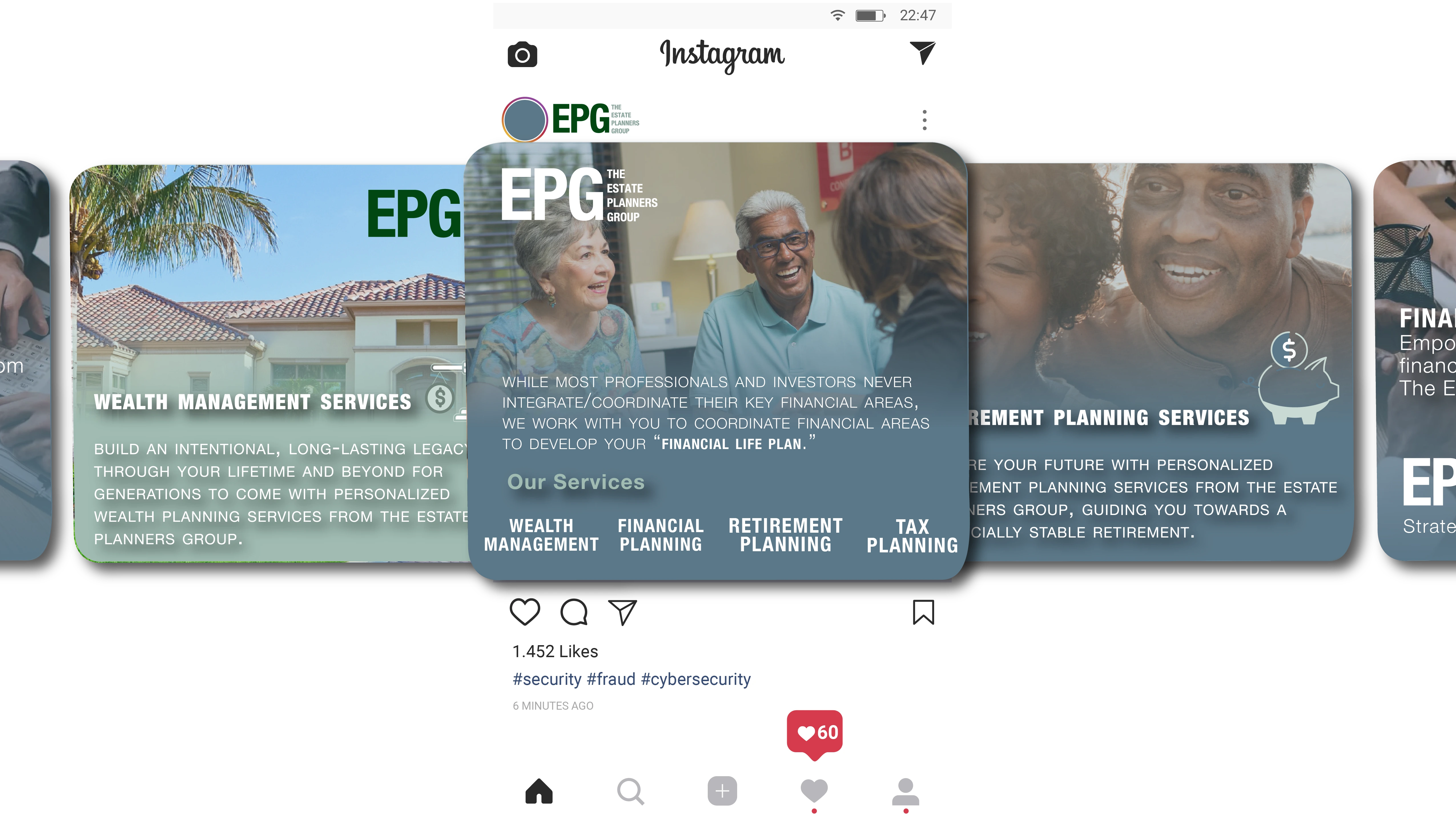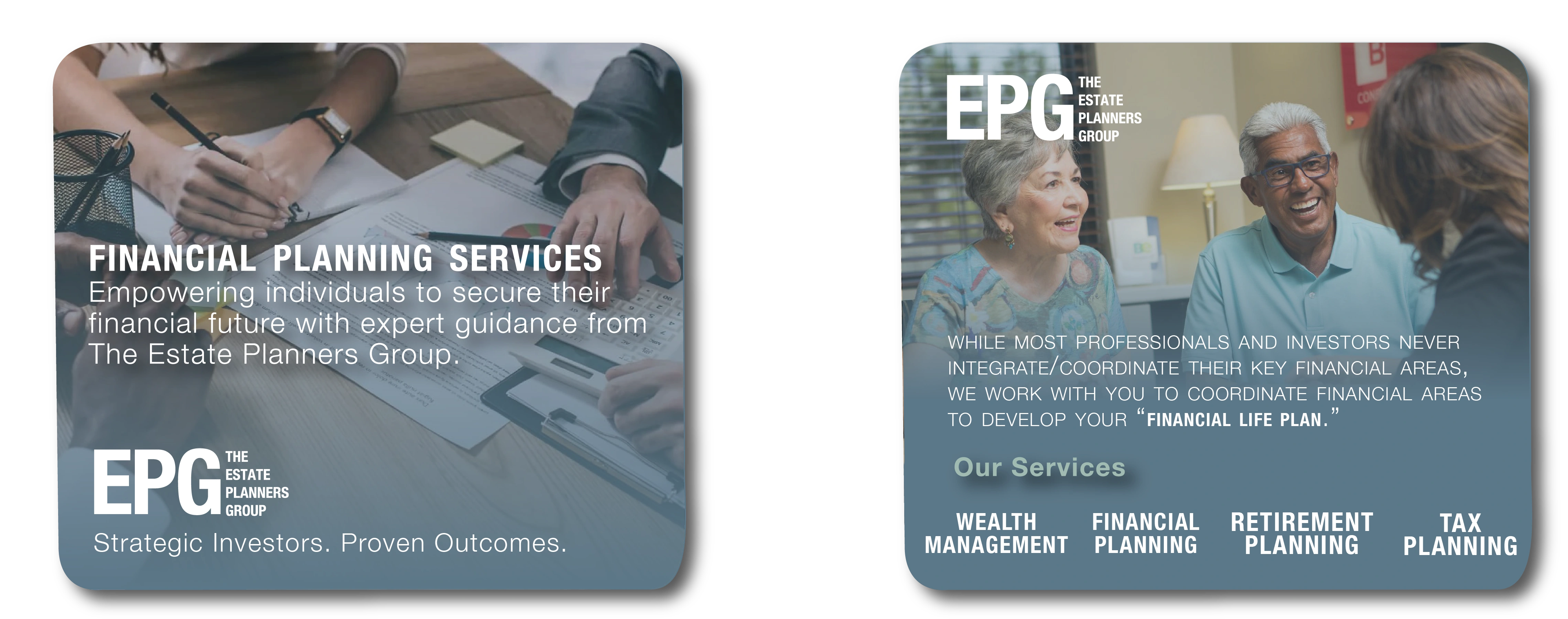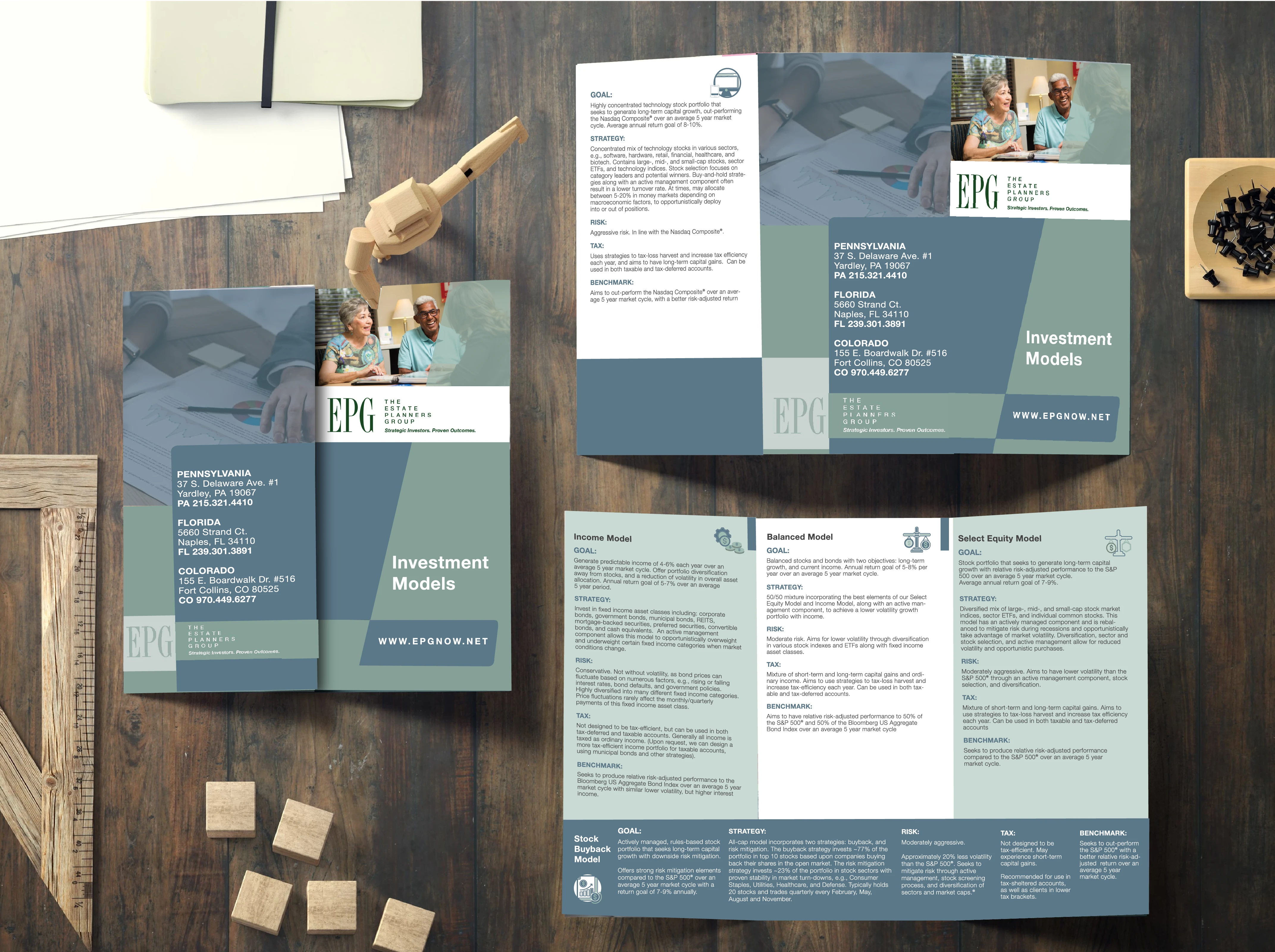 EPG, The Estate Planner Group, needed a two-sided, three-panel tri-fold that clearly outlined their services while maintaining their brand identity. The main challenge was balancing a large amount of content with their muted color palette of olive green and blue-gray. By alternating white and green backgrounds, I achieved a cleaner layout and improved readability.