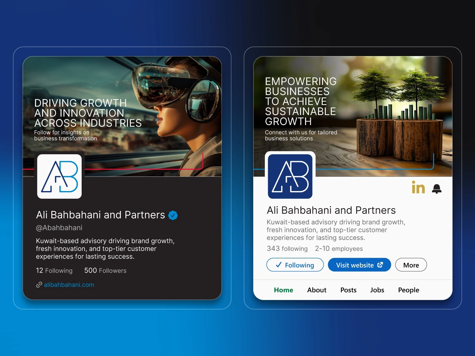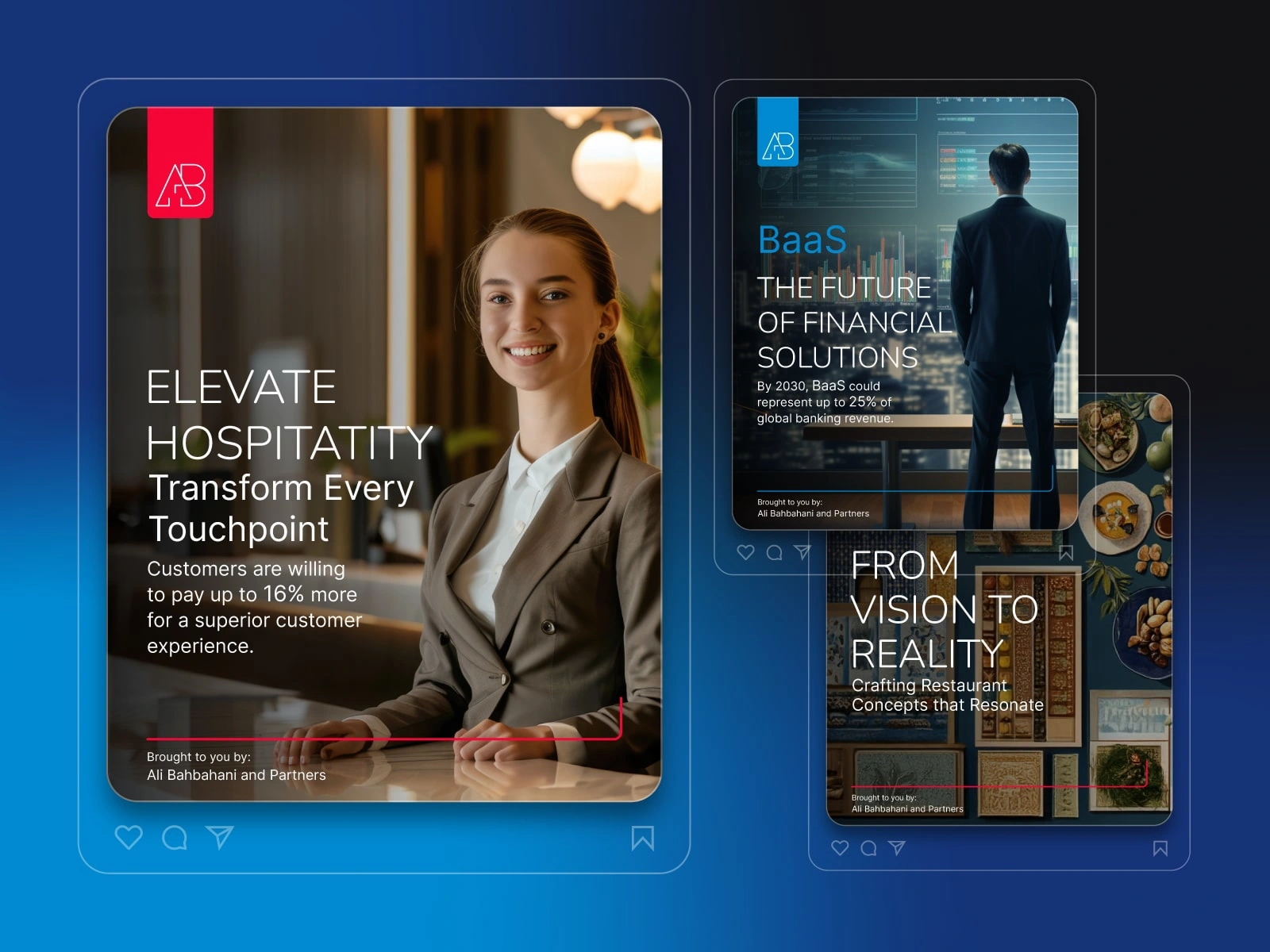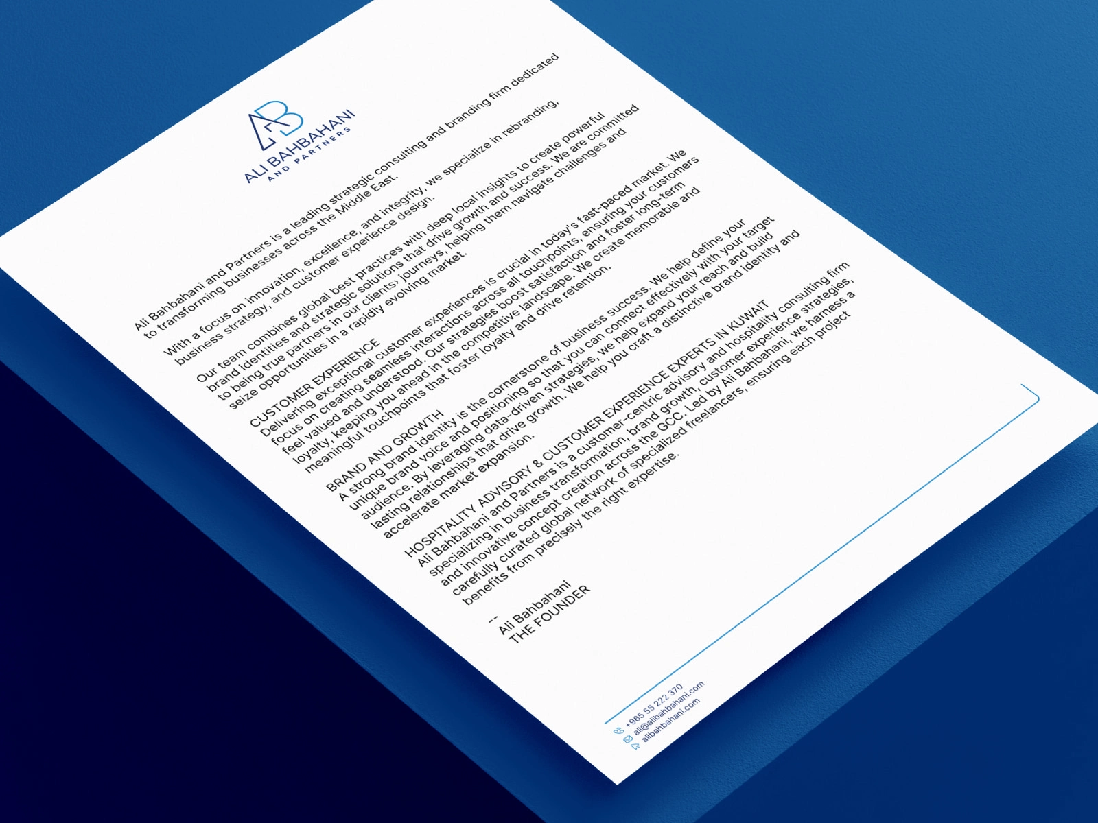 Ali Bahbahani and Partners is a leading strategic consulting and branding firm dedicated to transforming businesses across the Middle East. With a focus on innovation, excellence, and integrity, we specialize in rebranding, business strategy, and customer experience design.