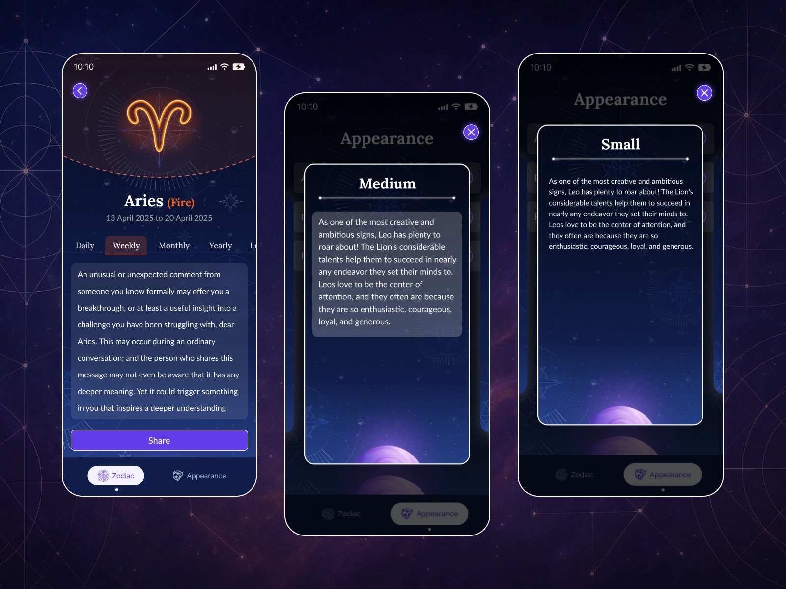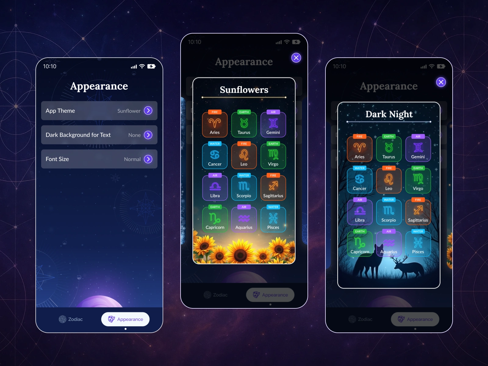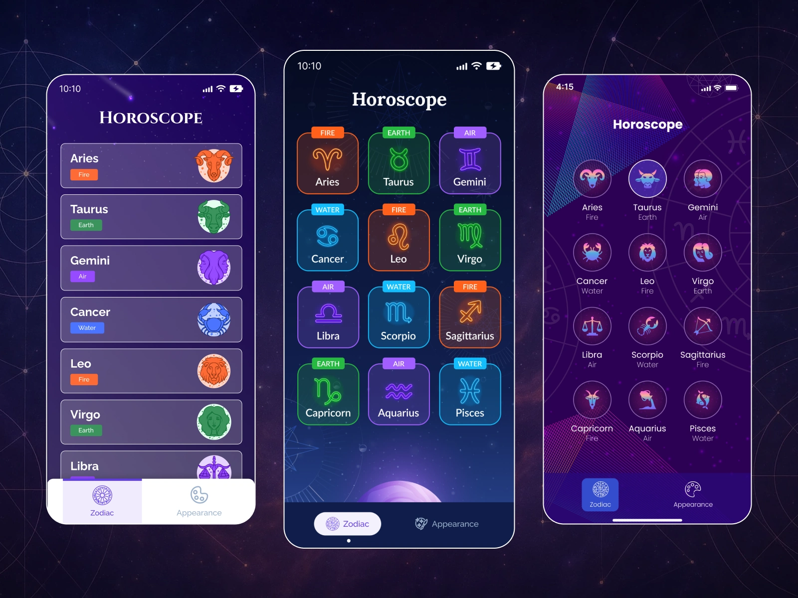 Designed UI/UX for a cross-platform horoscope app with zodiac UI, theme switcher, and responsive layout. Created in Figma for Android and iOS.