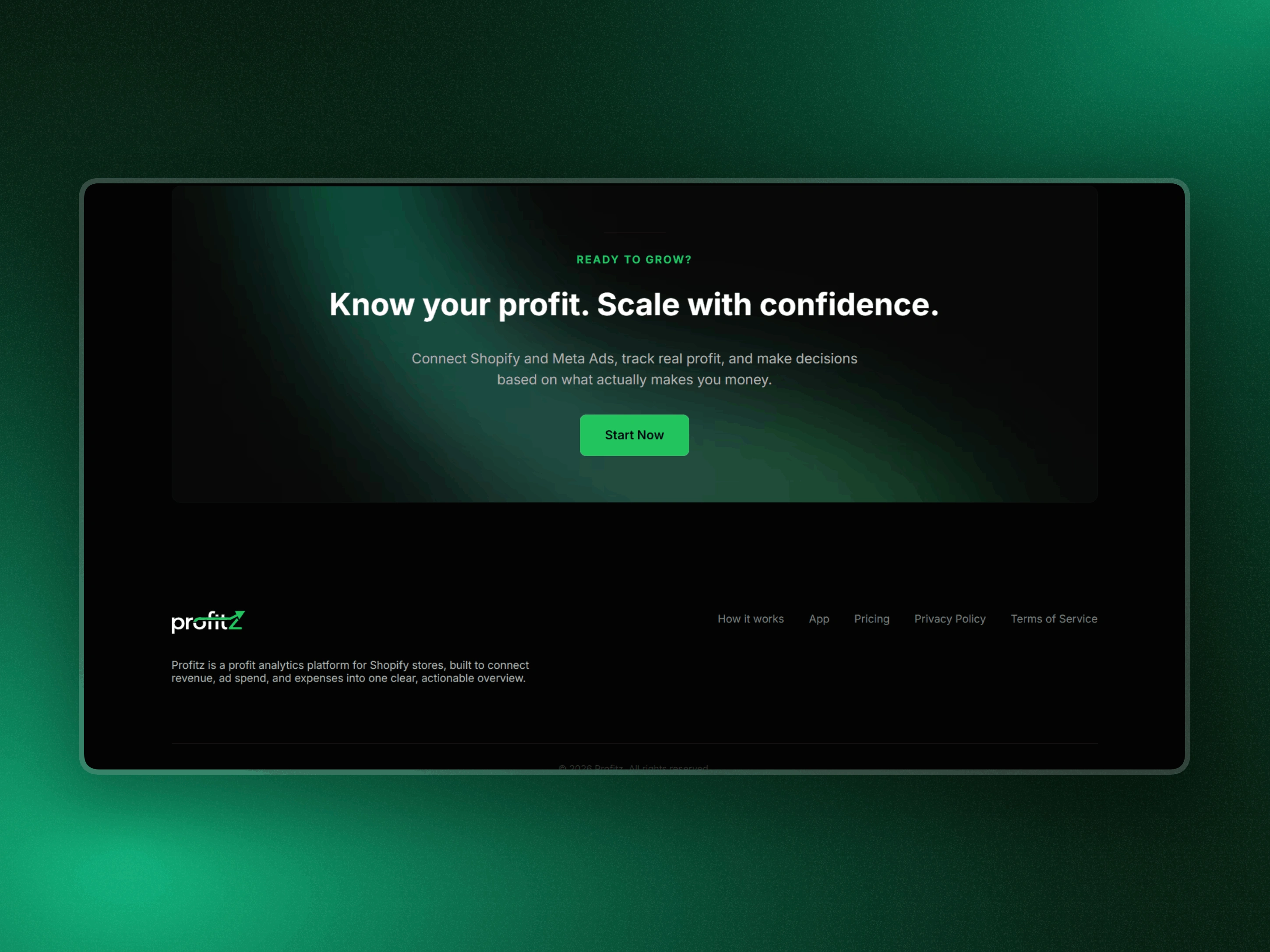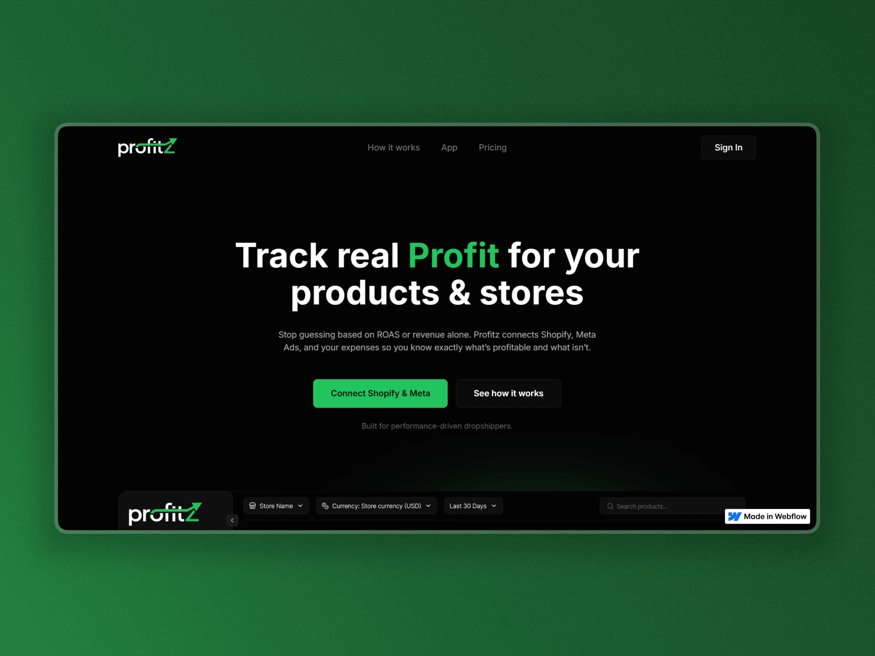Profitz is a SaaS platform that connects Shopify, Meta Ads, and expense tracking into one dashboard - so e-commerce founders and media buyers can see real net profit, not just revenue or ROAS.