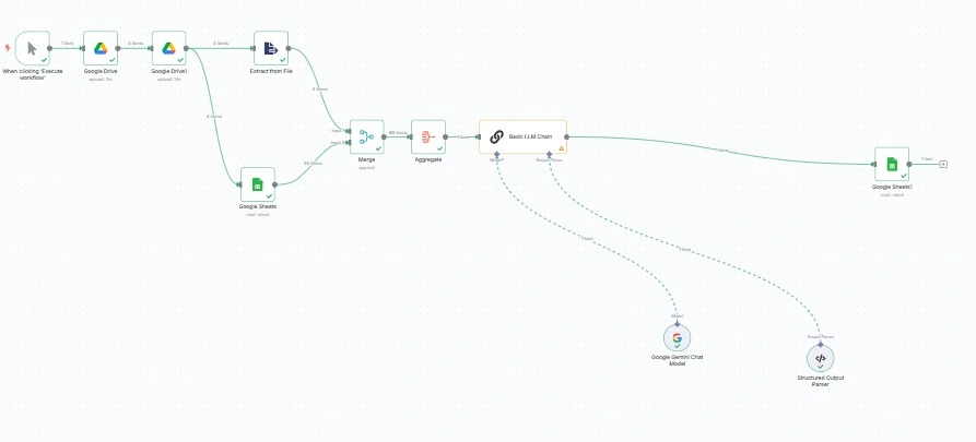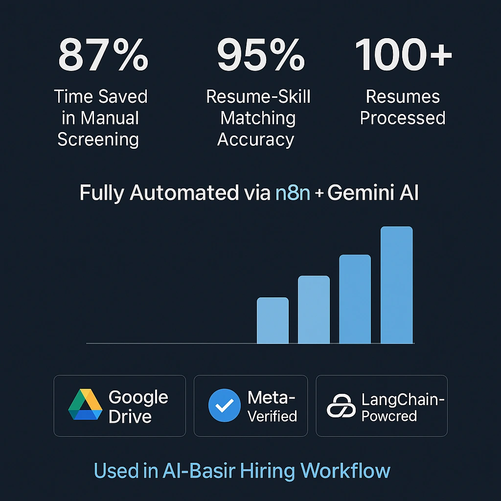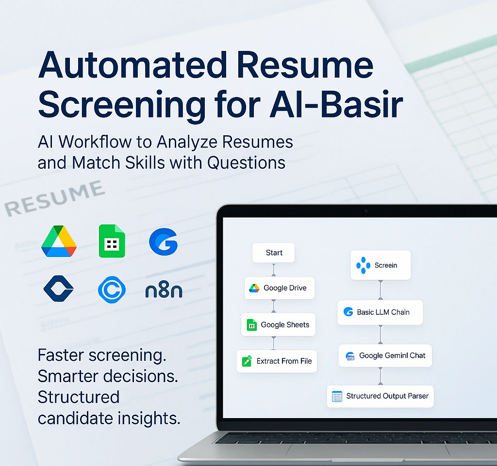 Delivered a hands‑free resume screening system that ingests resumes from Google Drive, analyzes them with Gemini AI, and writes structured insights to Google Sheets. The workflow standardizes shortlisting criteria, speeds up hiring decisions, and provides clear audit trails and documentation.