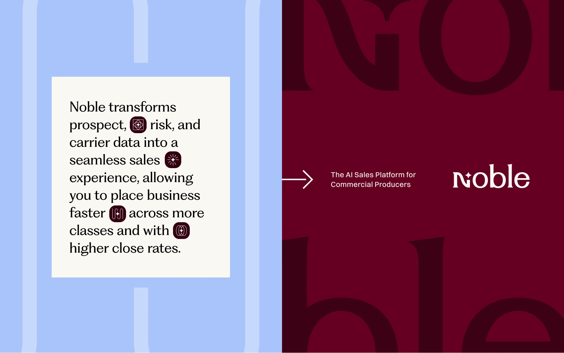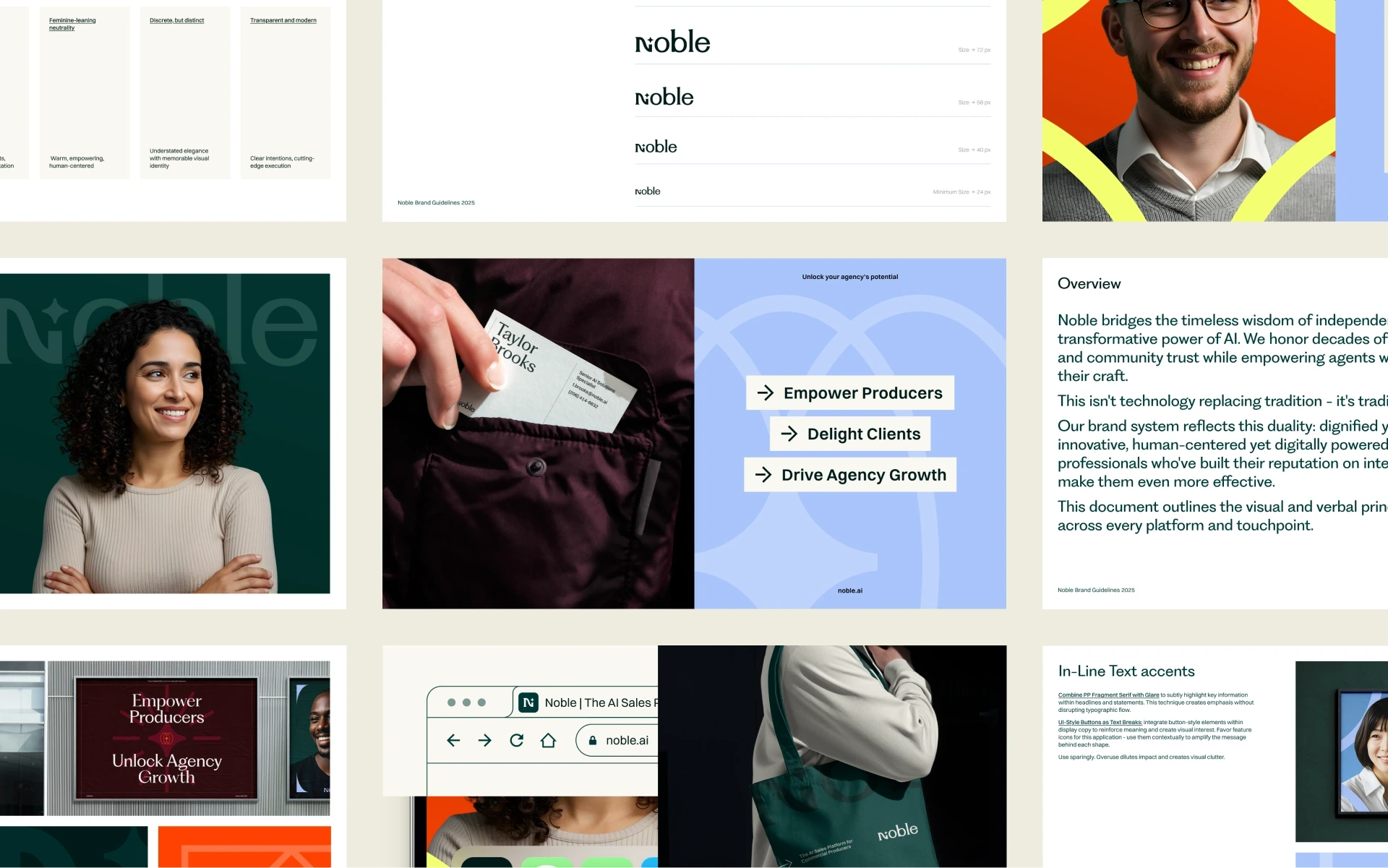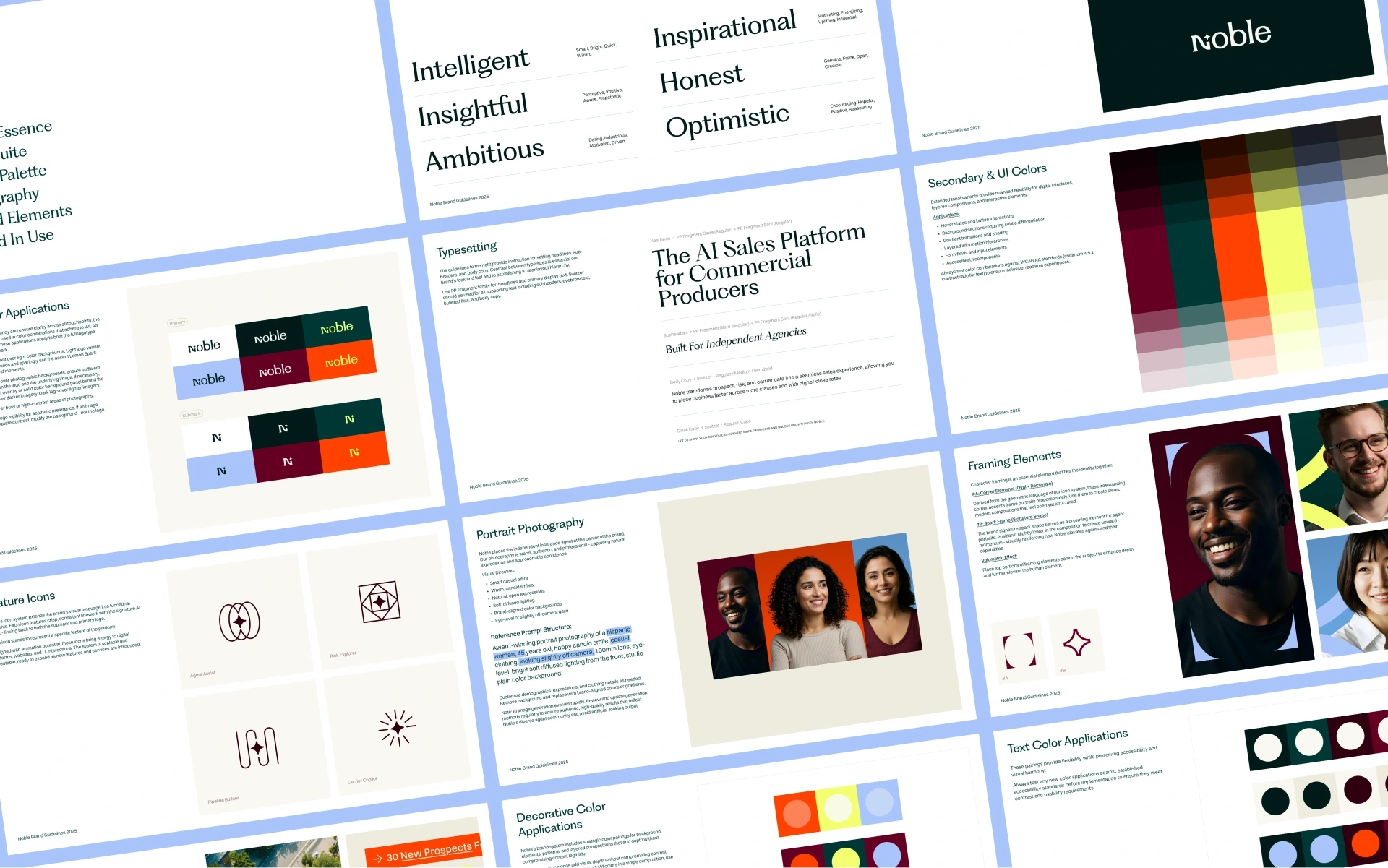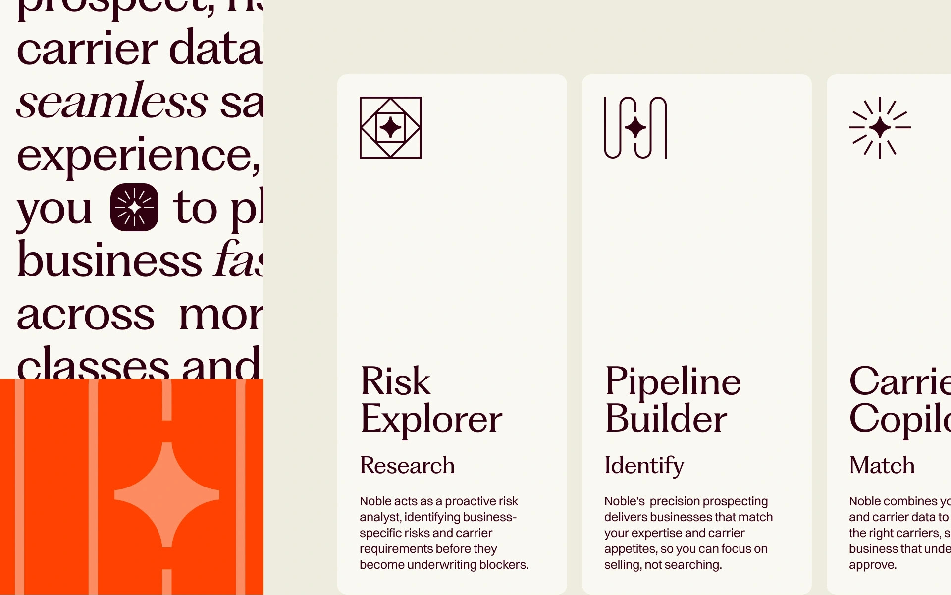 Noble places the independent insurance agent at the center of the brand. Our photography is warm, authentic, and professional - capturing natural expressions and approachable confidence. Portrait art direction centers on warmth, authenticity, and confidence. A custom geometric framing system positions the signature spark above subjects, introducing subtle upward momentum - a metaphor for elevating human expertise. Subjects overlap framing to reinforce the idea that people lead the system, not the other way around.