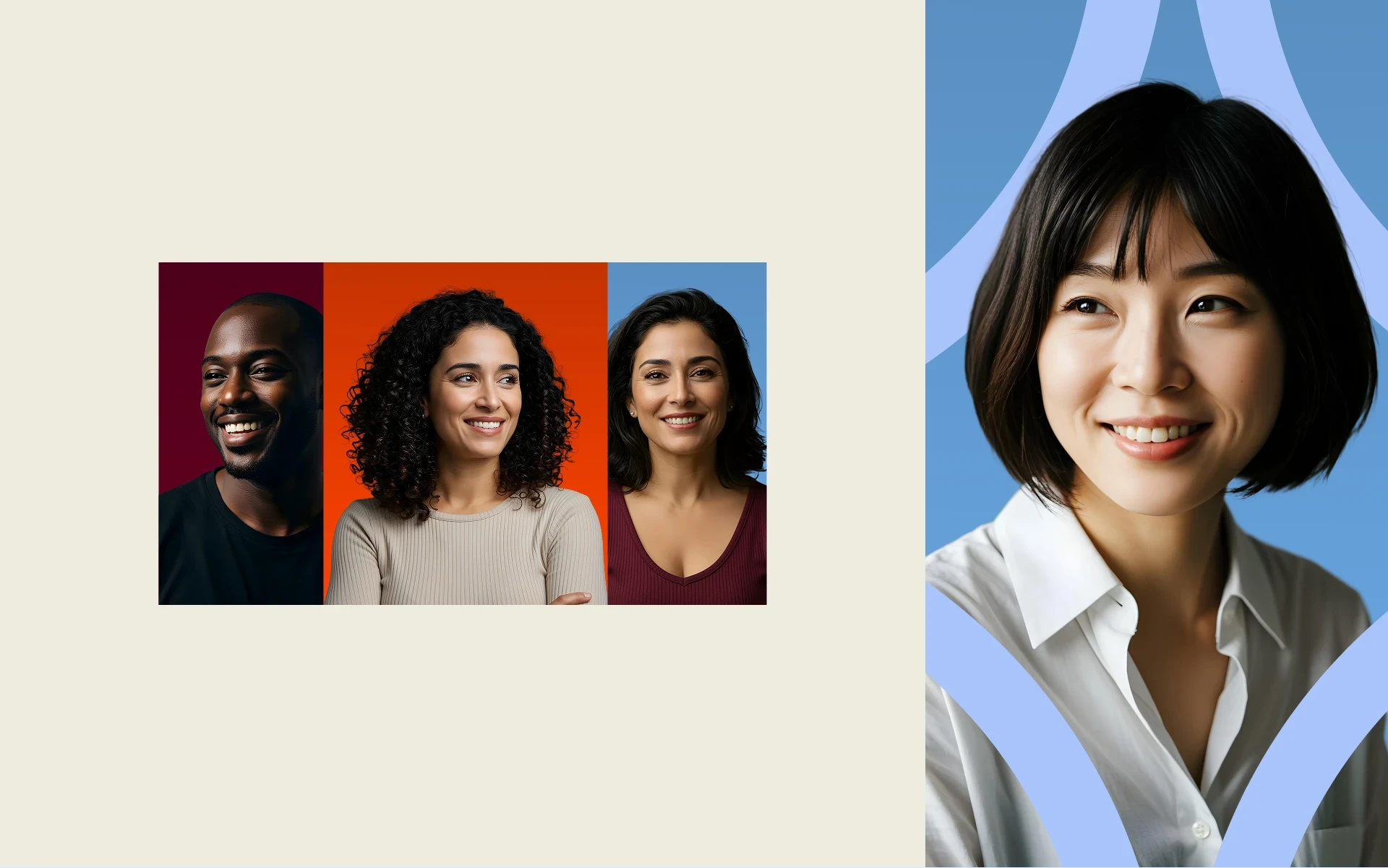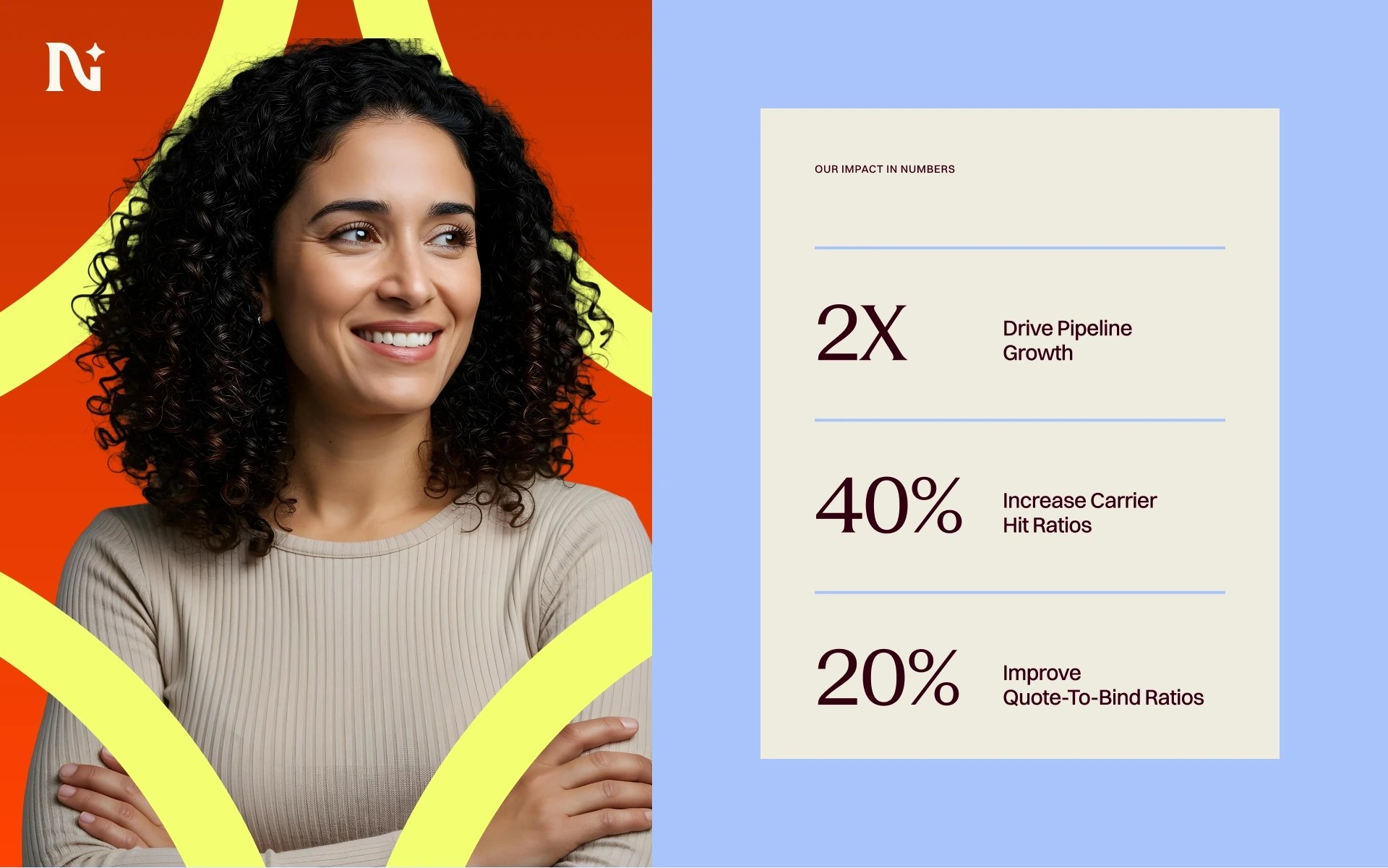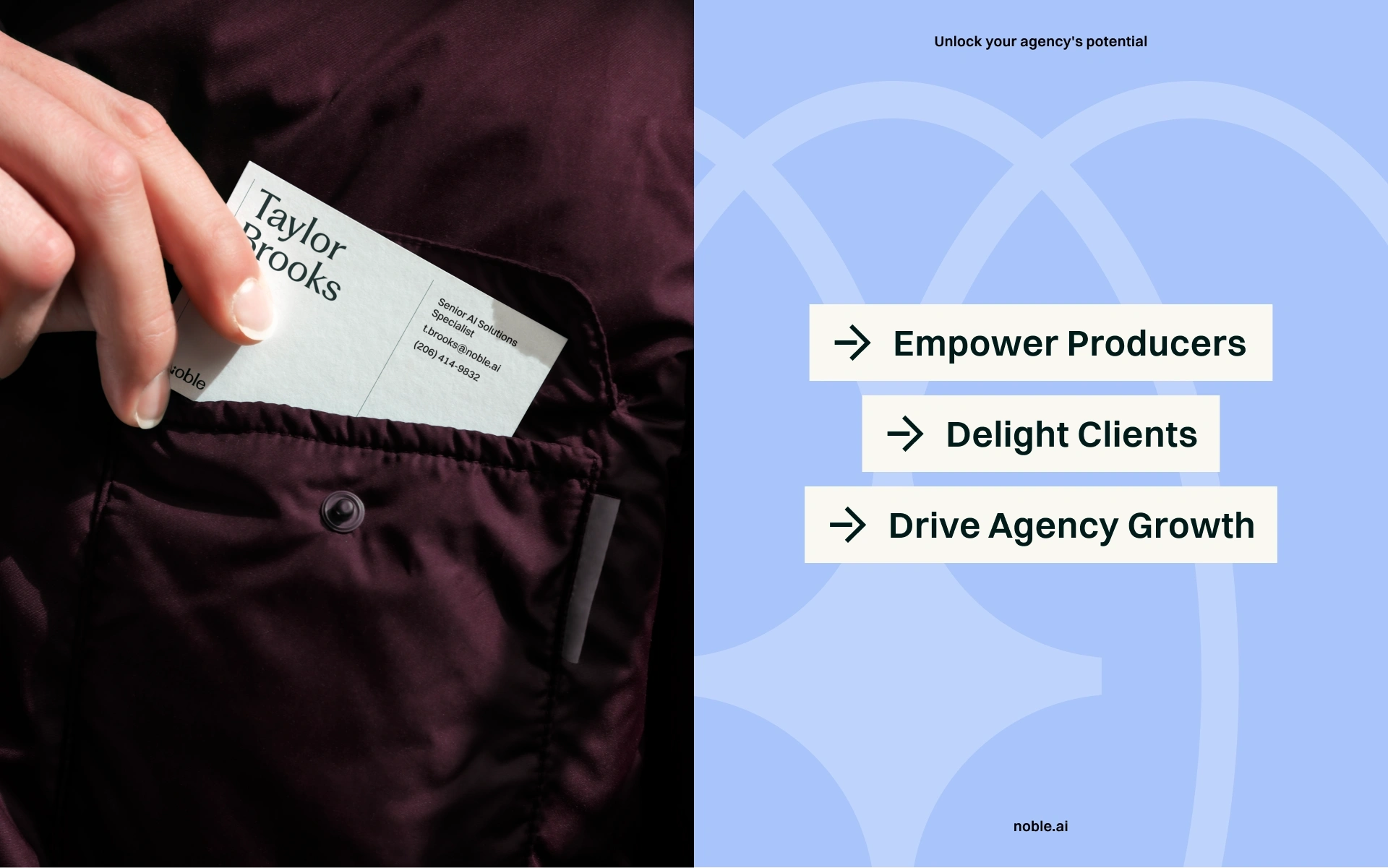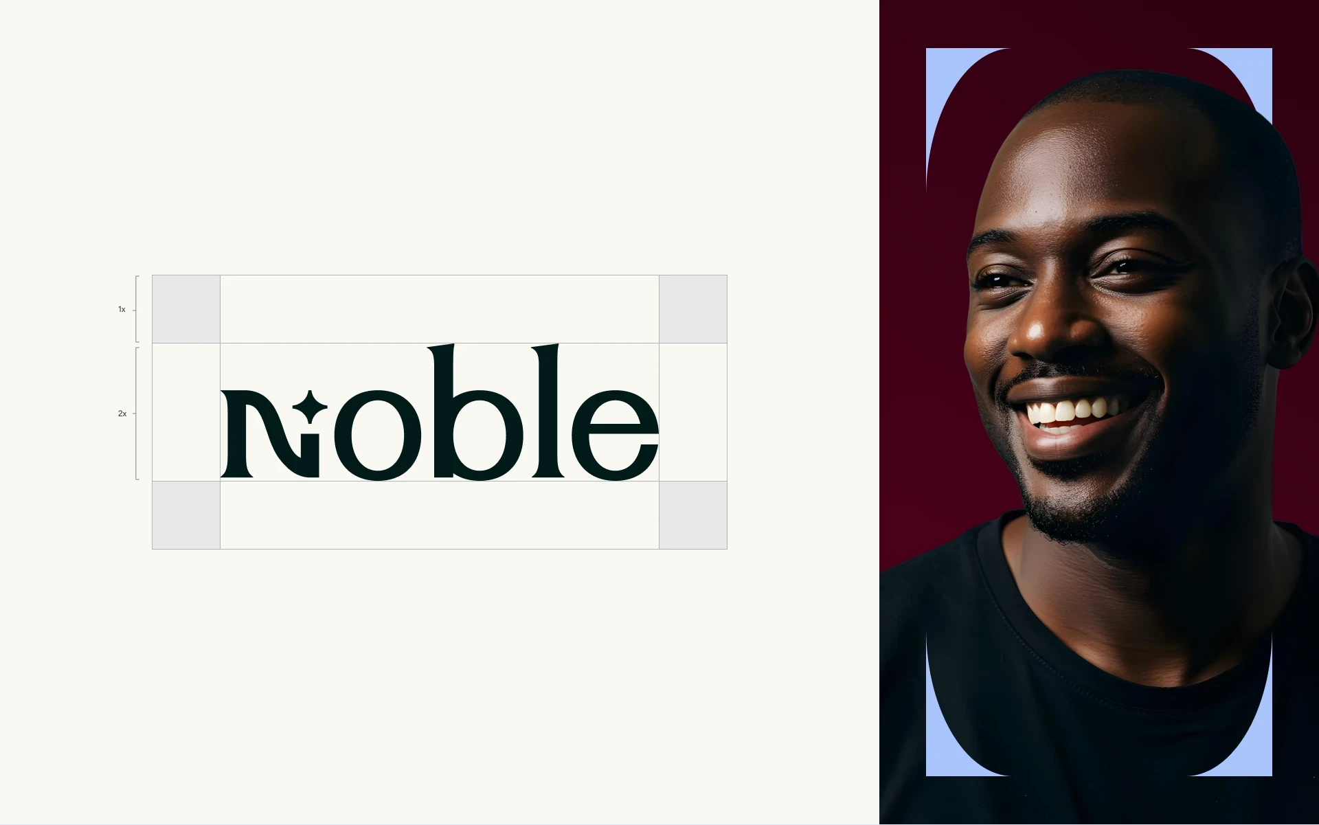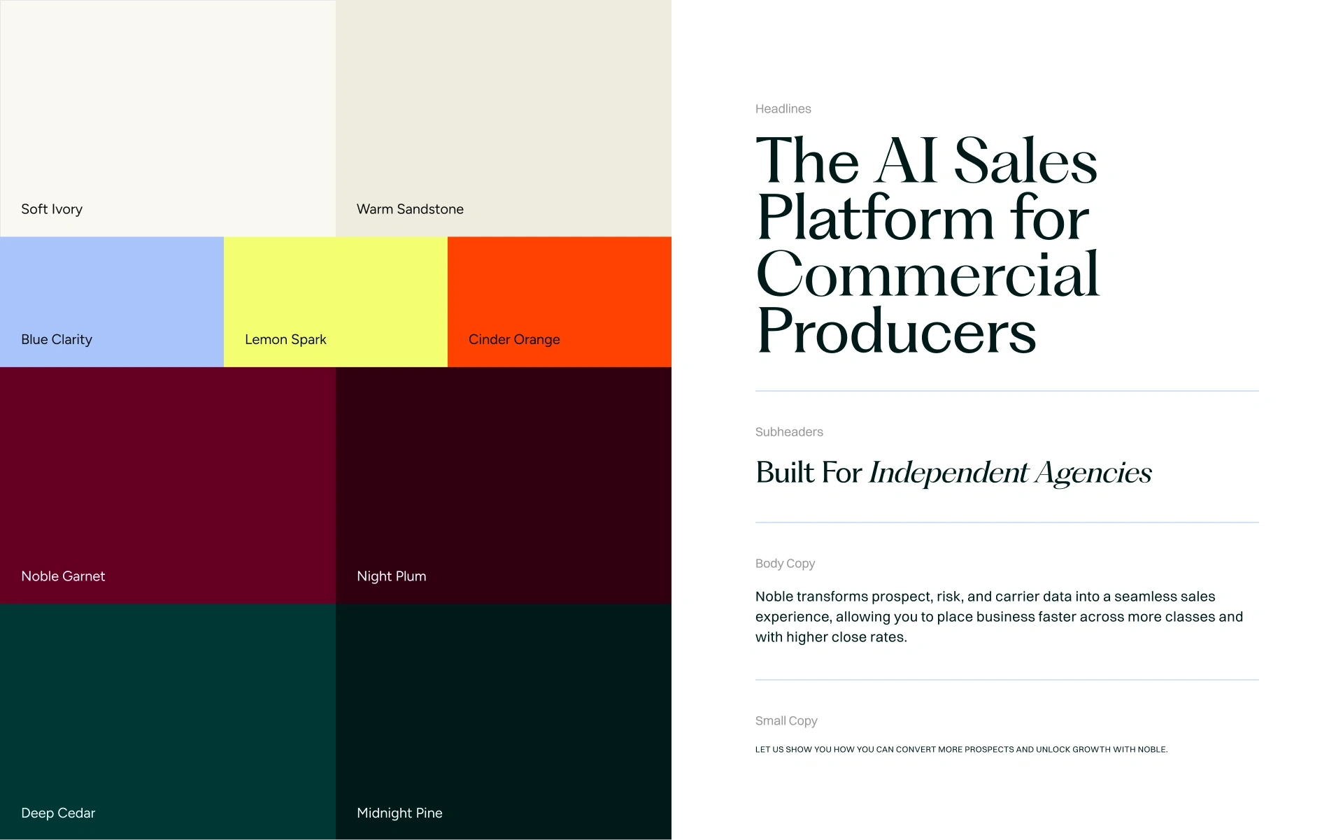 Noble places the independent insurance agent at the center of the brand. Our photography is warm, authentic, and professional - capturing natural expressions and approachable confidence. Portrait art direction centers on warmth, authenticity, and confidence. A custom geometric framing system positions the signature spark above subjects, introducing subtle upward momentum - a metaphor for elevating human expertise. Subjects overlap framing to reinforce the idea that people lead the system, not the other way around.