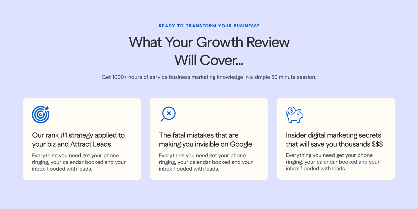 Explains what’s included in the free strategy review — marketing insights, SEO methods, and competitor analysis.