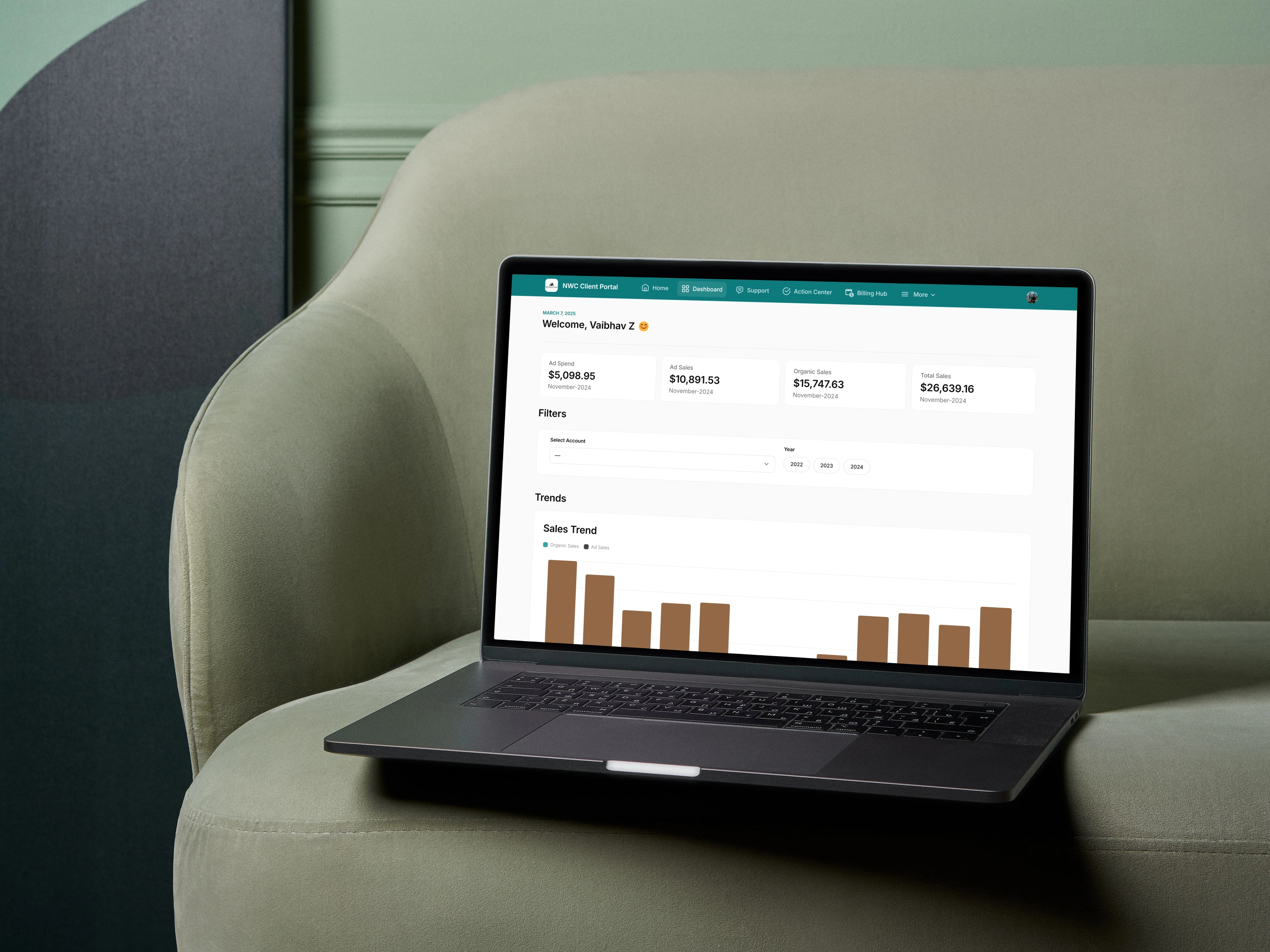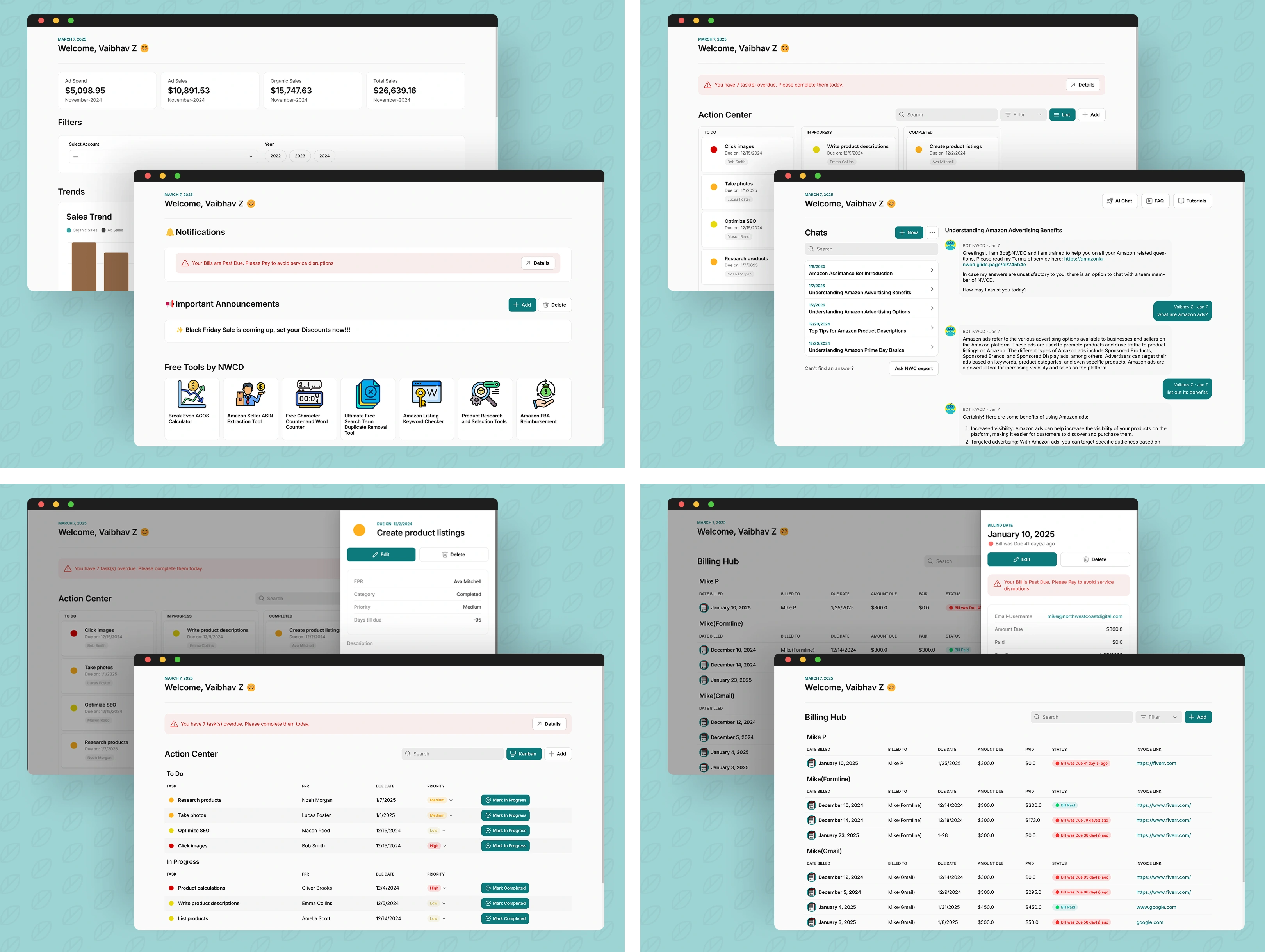 Amazon.com. Built for a service provider specializing in Amazon ads, the app gives clients a centralized space to track ad performance—covering ad spend, ad sales, and organic sales—through a clear dashboard. It also features a support hub with FAQs, tutorials, and an AI chatbot, an Action Center for managing ad-related tasks in both kanban and list views, a billing hub for payment management, direct expert chat, and a feedback forum. Access is restricted to invited users only.