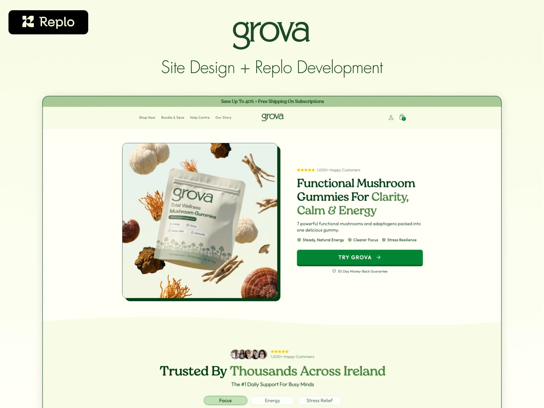 Entire site design and development in Replo for Grova. Resulted in a 90% conversion rate increase.