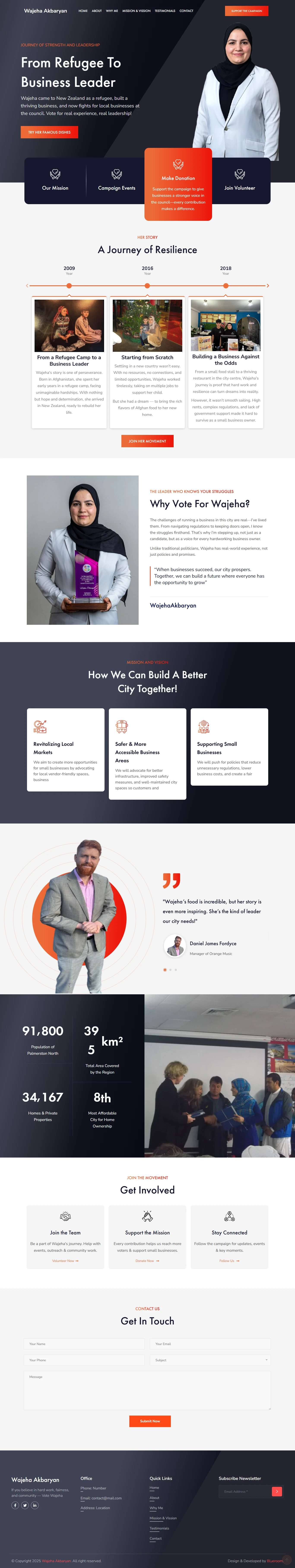 Goal: Build a modern, responsive political campaign website to showcase the candidate’s story, mission, events, and allow visitor engagement (volunteering, donations, contact).