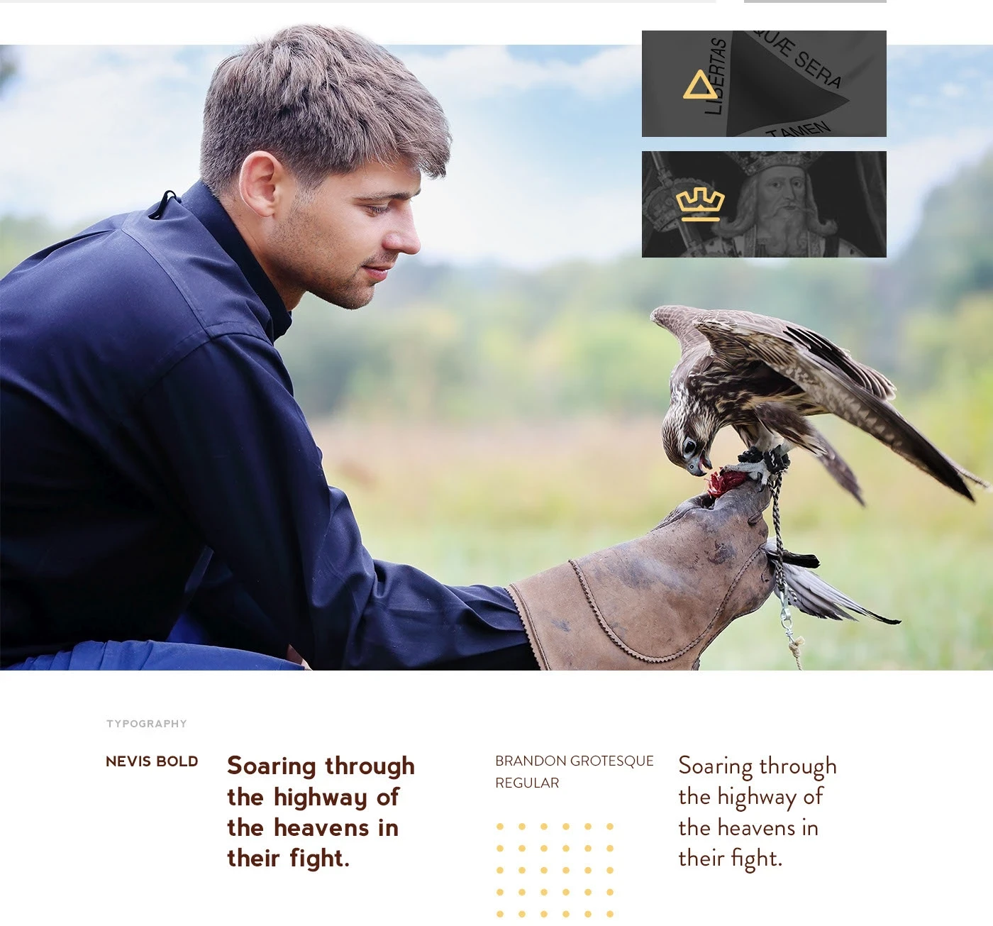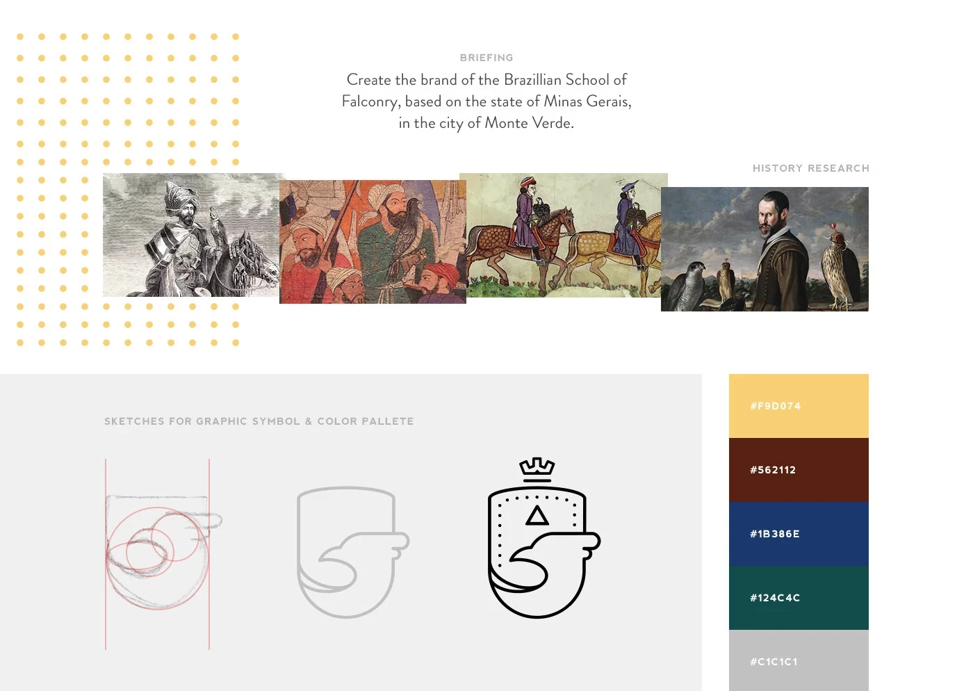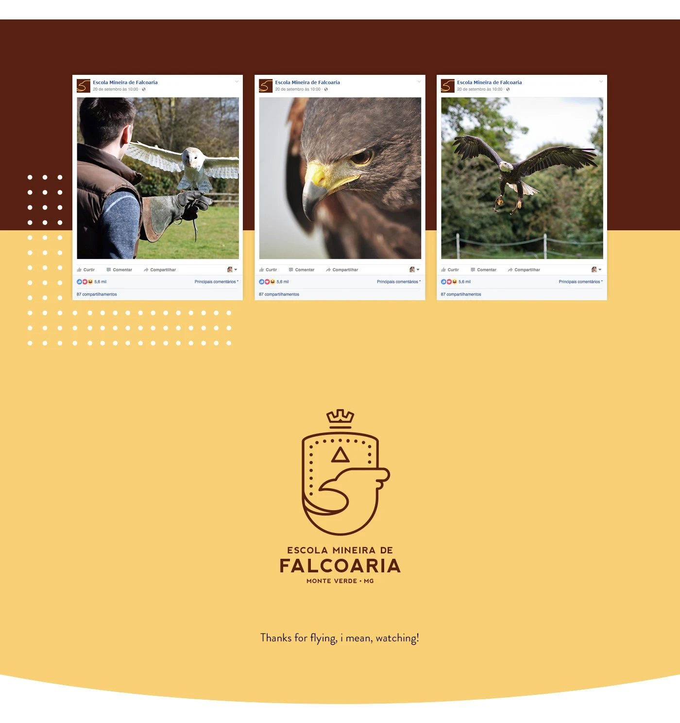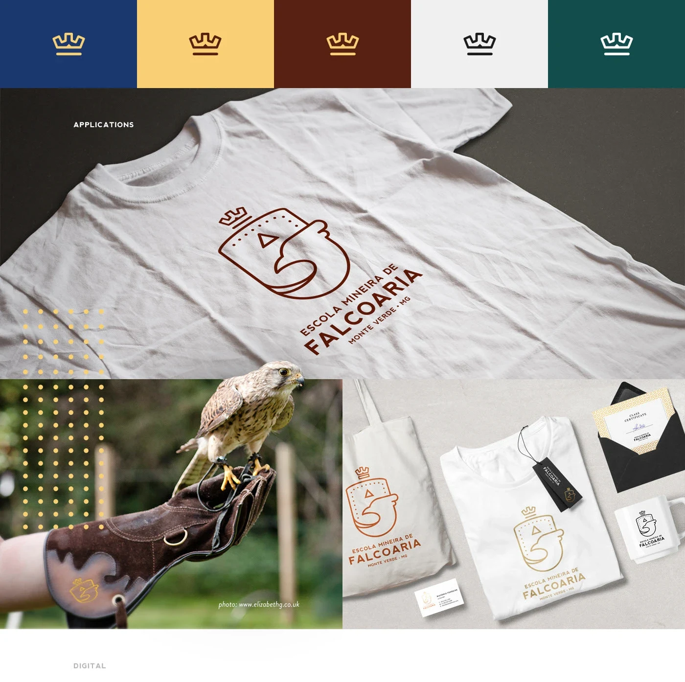 Located in middle of Brazil, in the state of Minas Gerais, the Brazilian School of Falconry is space created by Riuvânio Rodrigues Ferreira - Biologist, ornithologist, manager and environmental educator, to teach this art/sport with more than 4000 years of history. We created this brand based on the respect that this sport gained over the years, being even called the "Sport of the Kings”. After a graphic historic research, the heraldic style was the best choice, but in a modern application.
