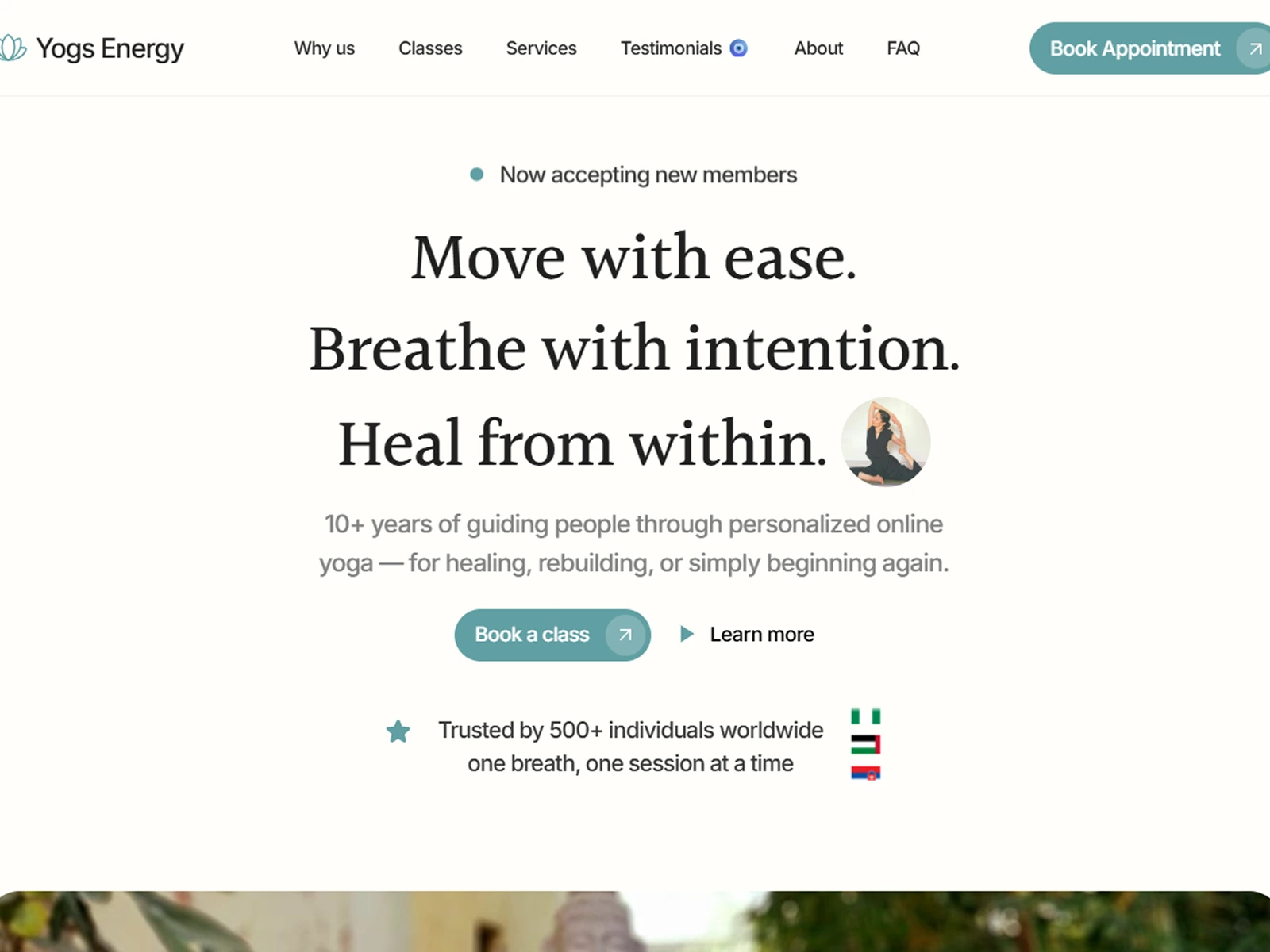 A clean, responsive wellness site built in Framer for Yogs Energy, a personalized online yoga & healing studio with UI that mirrors the studio’s ethos.