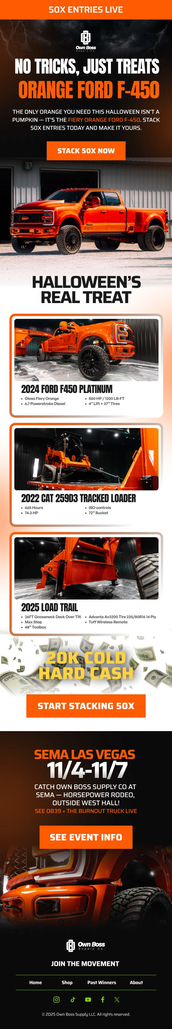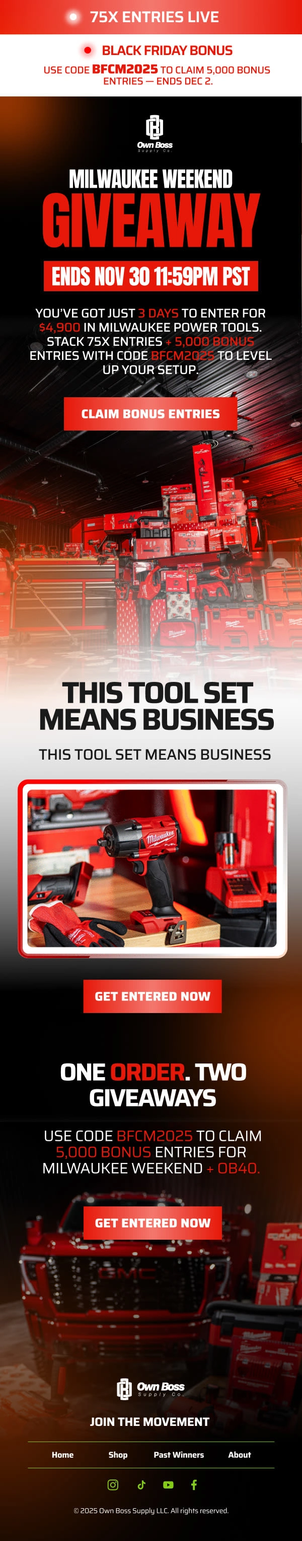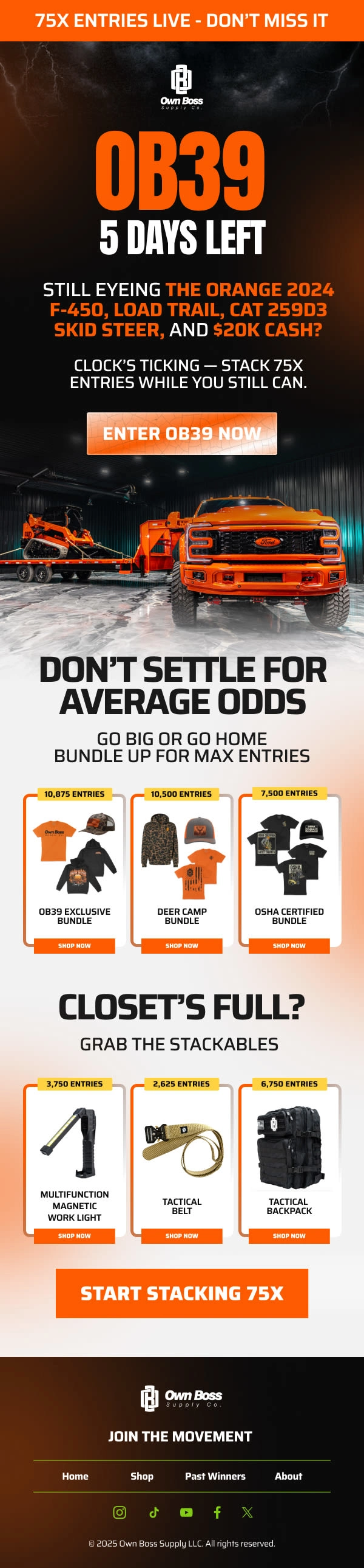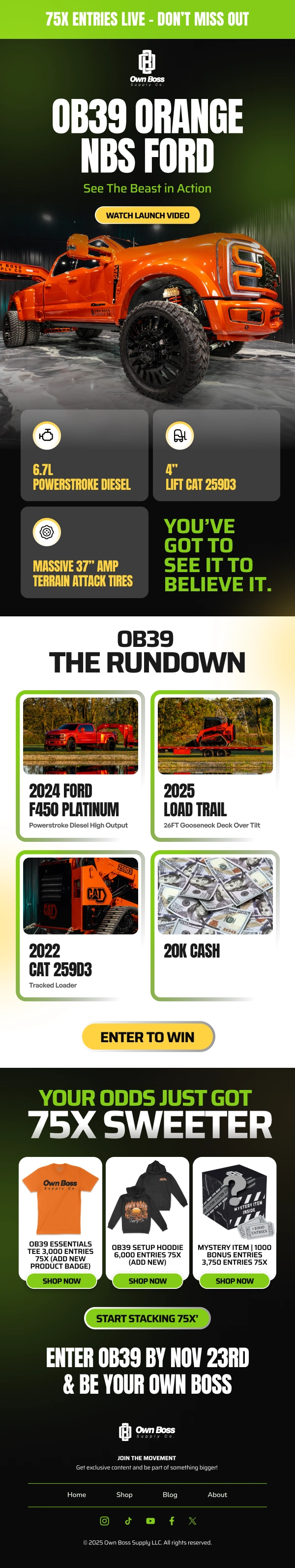 The campaign required not just engagement — but massive entry stacking. The goal: maximize conversions per order, drive urgency through segmented email flows, and maintain design consistency across product drops, countdowns, and last-minute pushes.