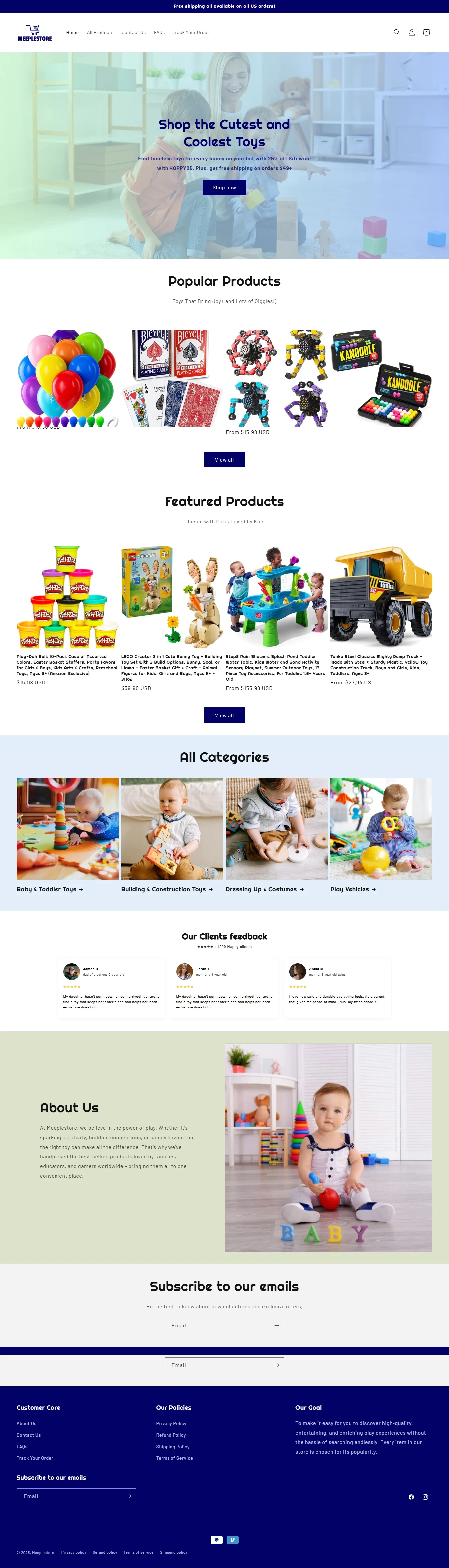 Challenge: Meeple Store, an online shop specializing in toys and kids’ games, needed a kids games Shopify store design that blended playful branding with smooth e‑commerce flow. The design had to highlight product categories (e.g. Building Toys, Play Vehicles, Costumes), drive engagement through parent-friendly UX, and be built in Figma then converted to Shopify—all while ensuring trust, fast load times, and mobile responsiveness.