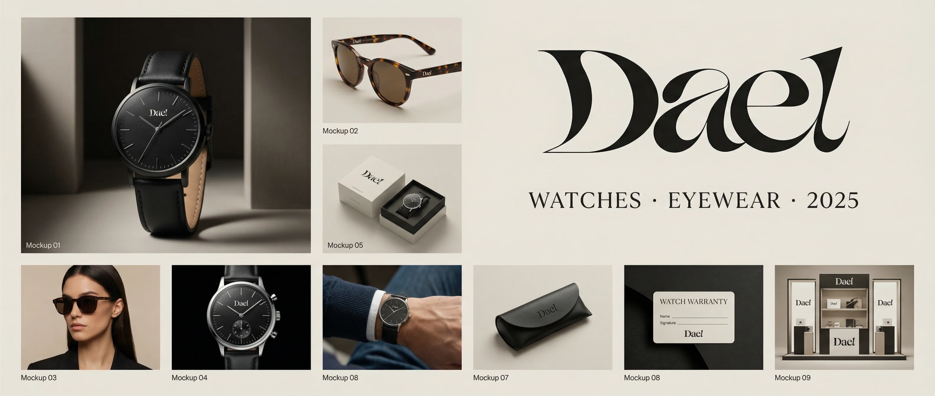#e8e2d9. The Dael wordmark large in the top-right quadrant. "WATCHES · EYEWEAR · 2025" in the secondary typeface below. The composite demonstrates the range of the system across scales, surfaces, and contexts — from the 4mm logo on a watch dial to the architectural presence of Mockup 09.