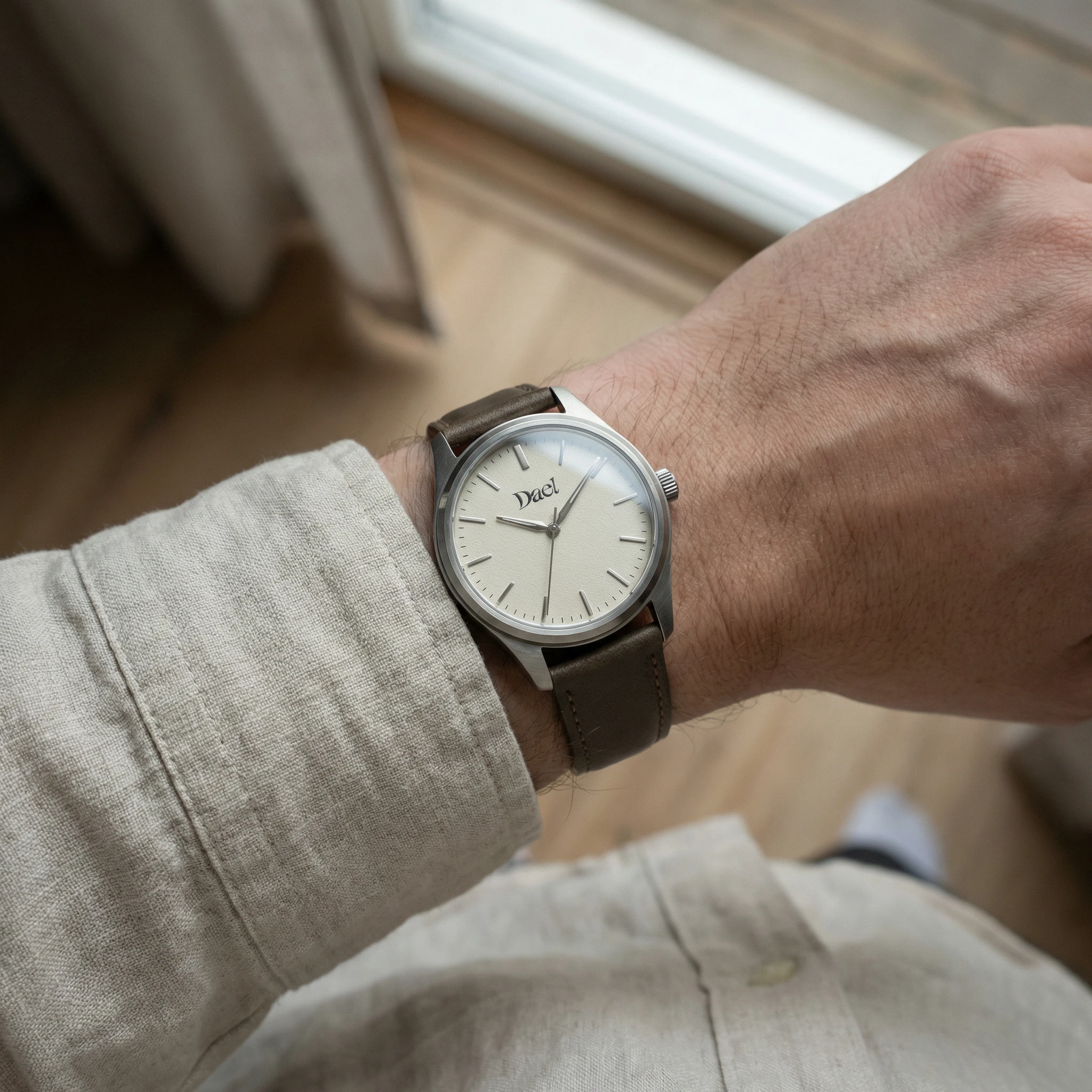 #d4cfc8, applied indices only, no numerals. The Dael wordmark at 6 o'clock in #1a1a18, approximately 4mm wide on the physical dial. Undyed vegetable-tanned leather strap. The logo is the only information the dial offers.