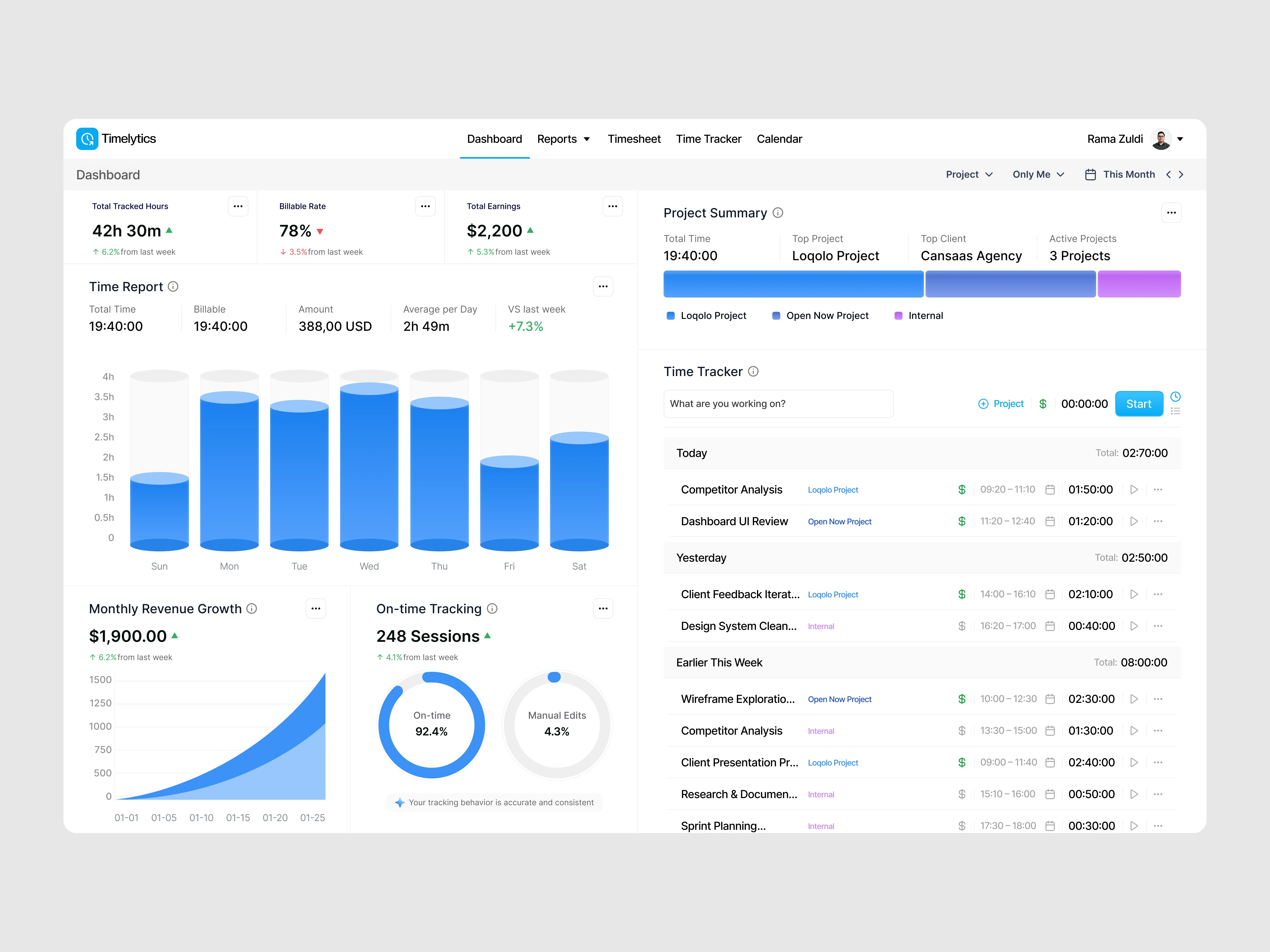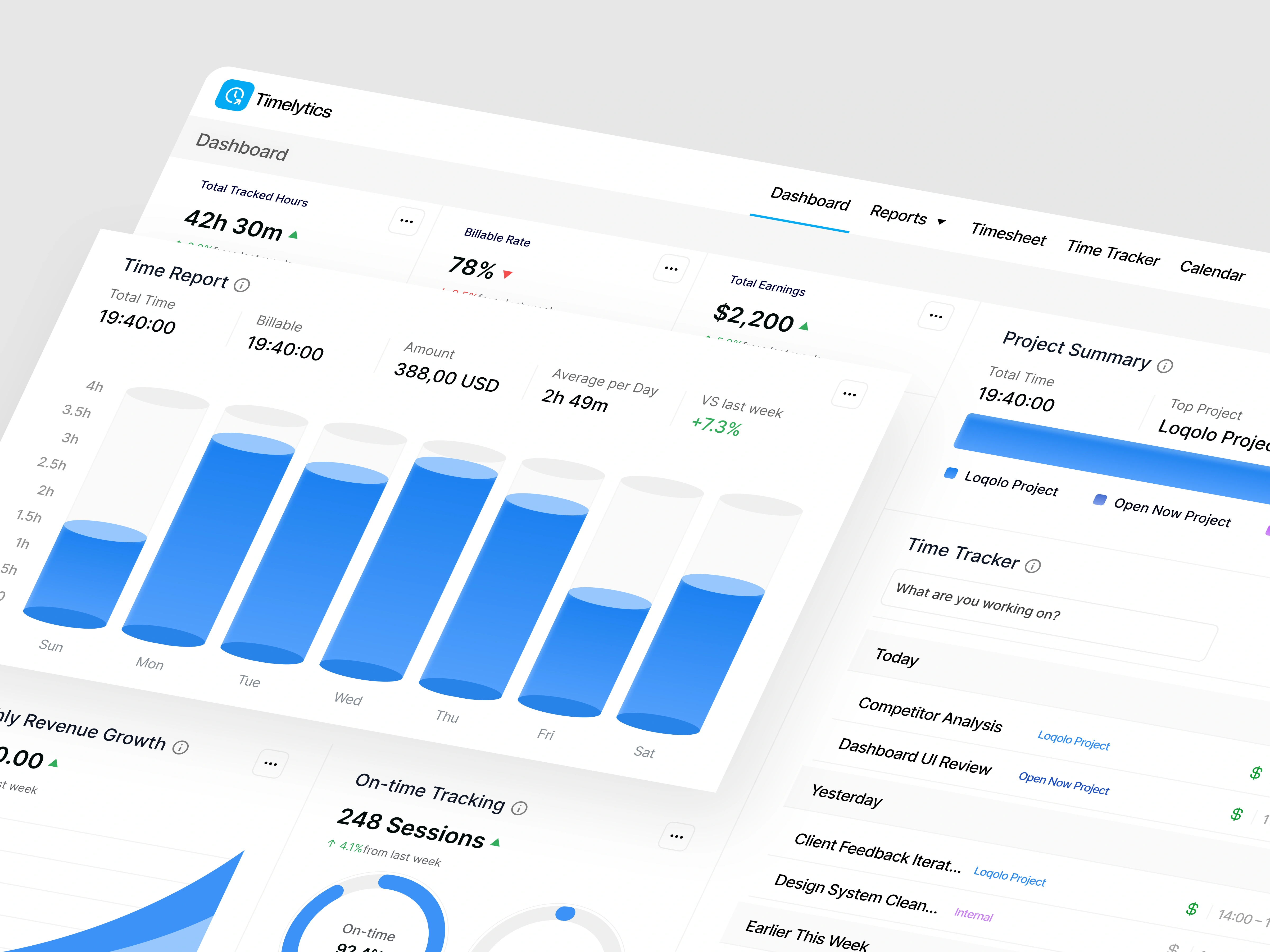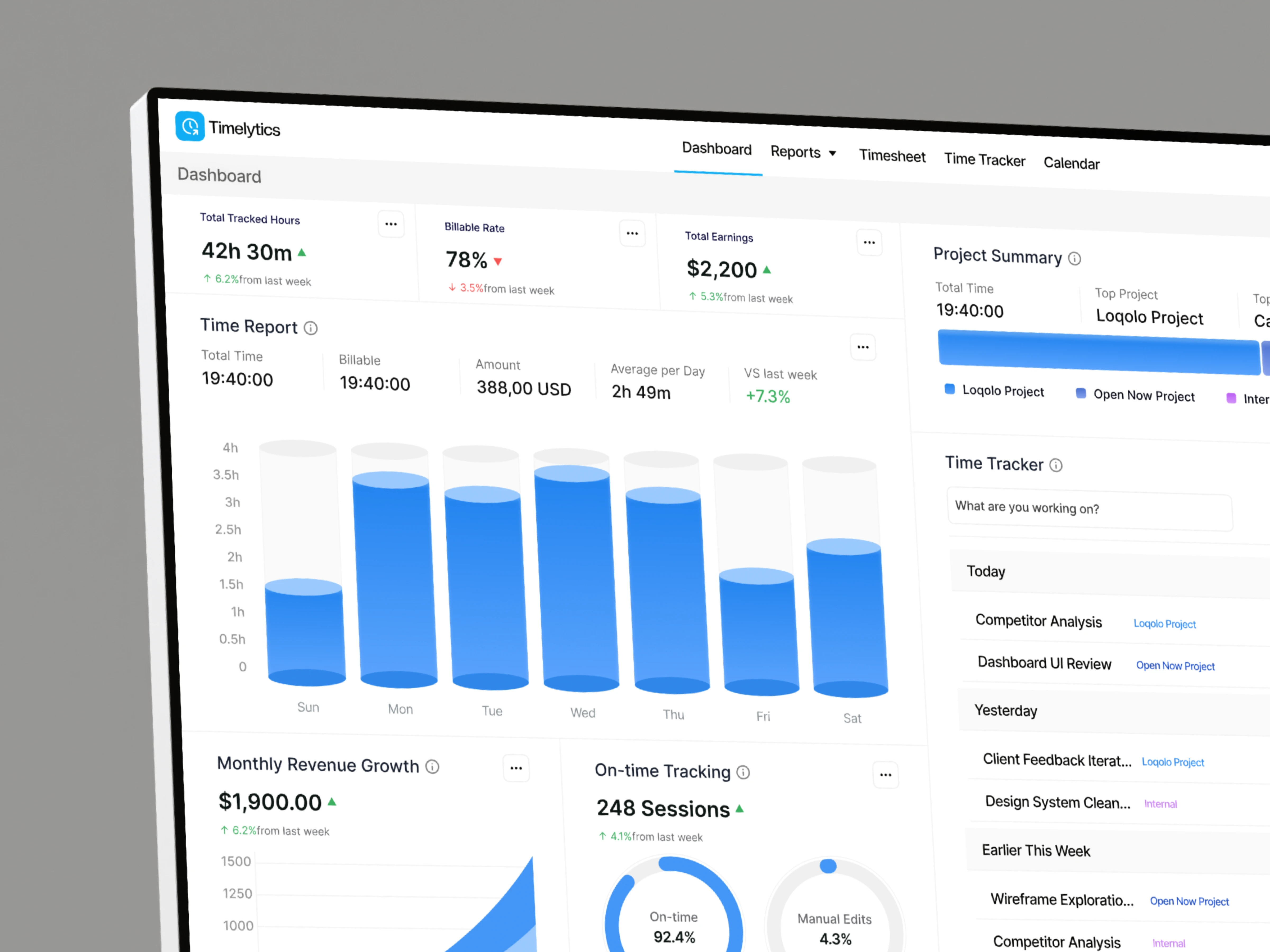 Many time tracking tools feel either too basic or overly complex. Users often struggle to understand where their time goes, how productive they actually are, and how tracked hours translate into earnings. The challenge was to present time, revenue, and performance metrics in a way that feels transparent, motivating, and easy to scan at a glance.