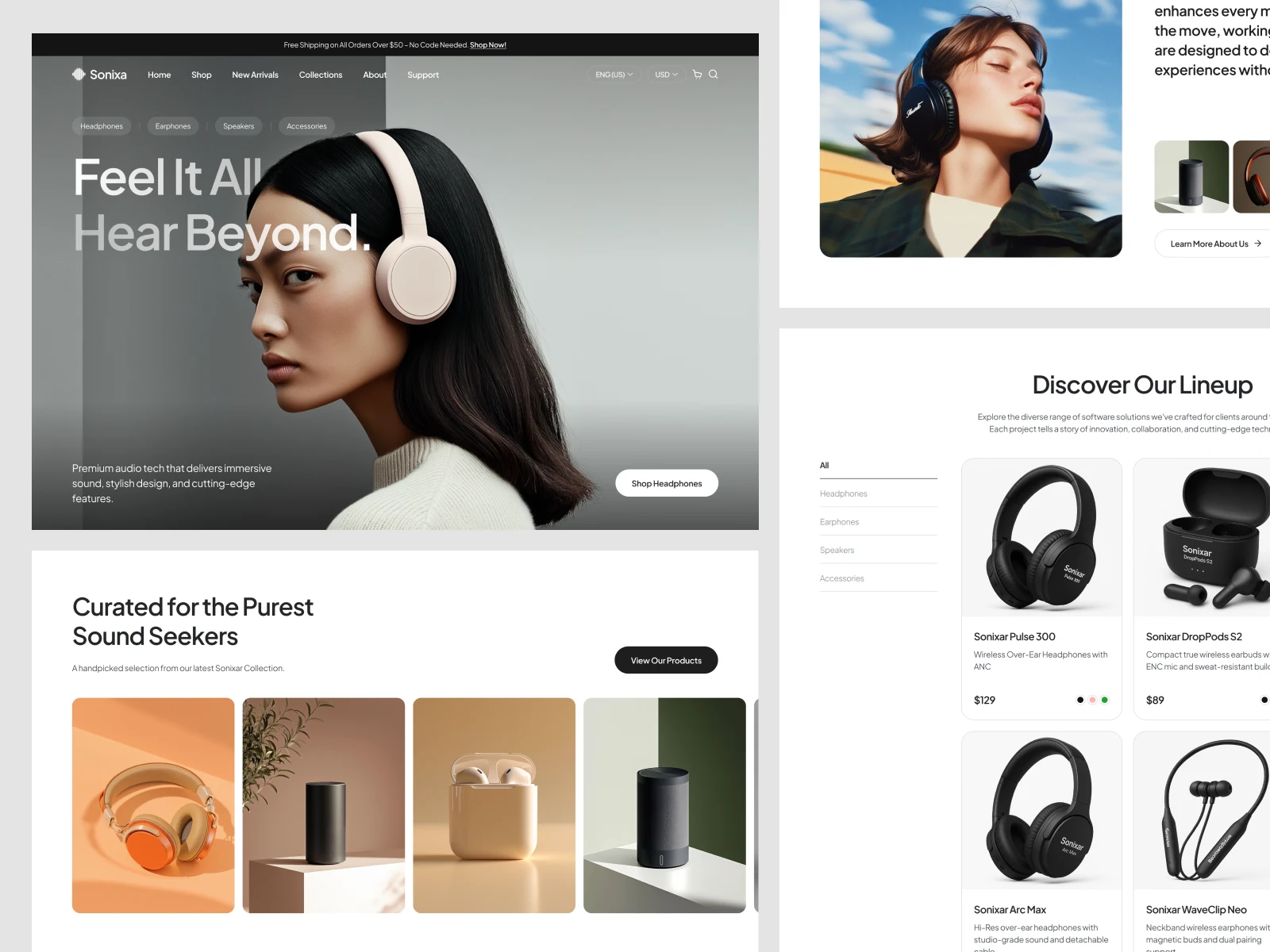 I had a lot of fun creating this concept for Sonixa, a fictional e-commerce brand that sells premium audio gear. The idea was to build something that feels modern and high-end, but still super easy to browse—like you're window shopping from the comfort of your couch.